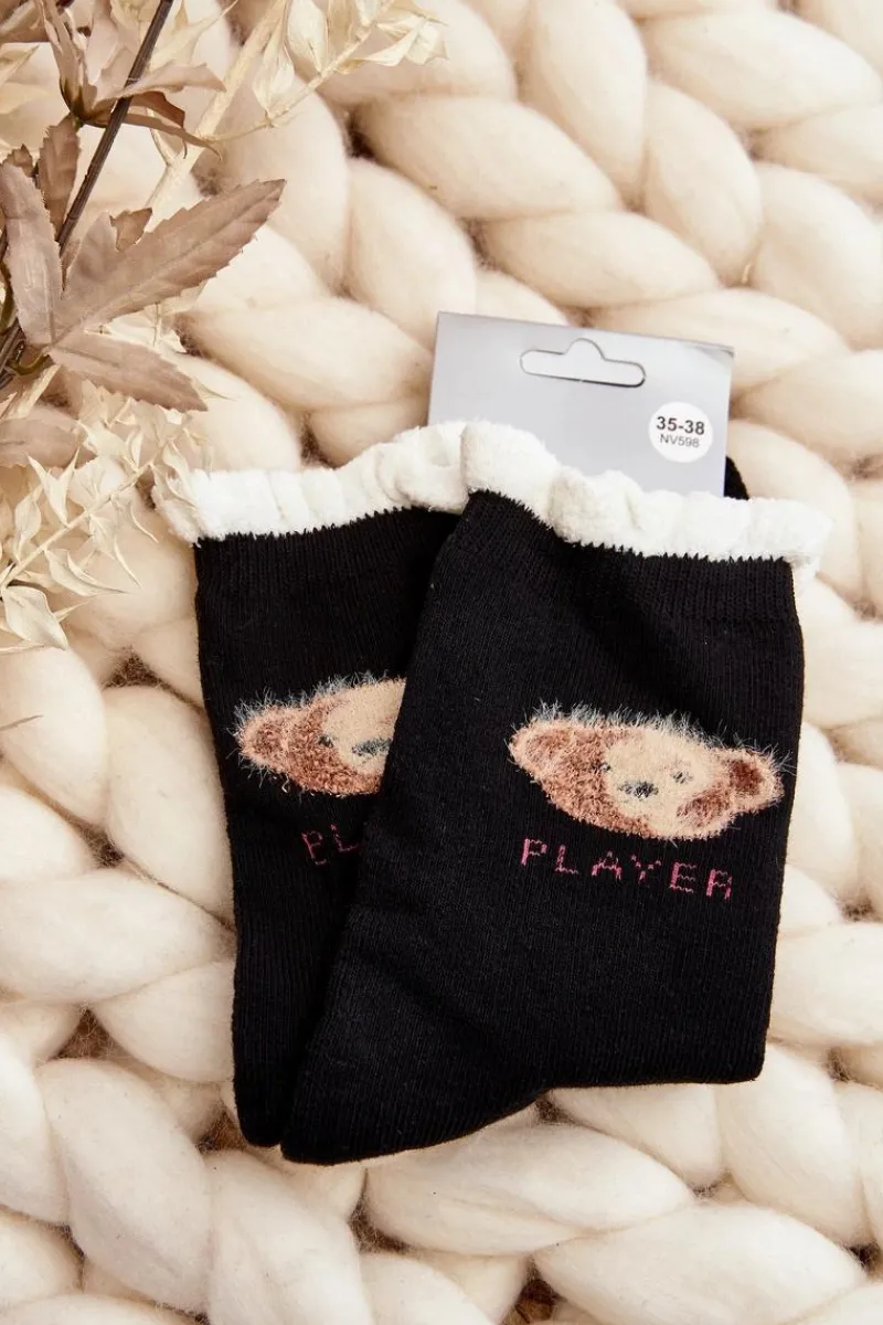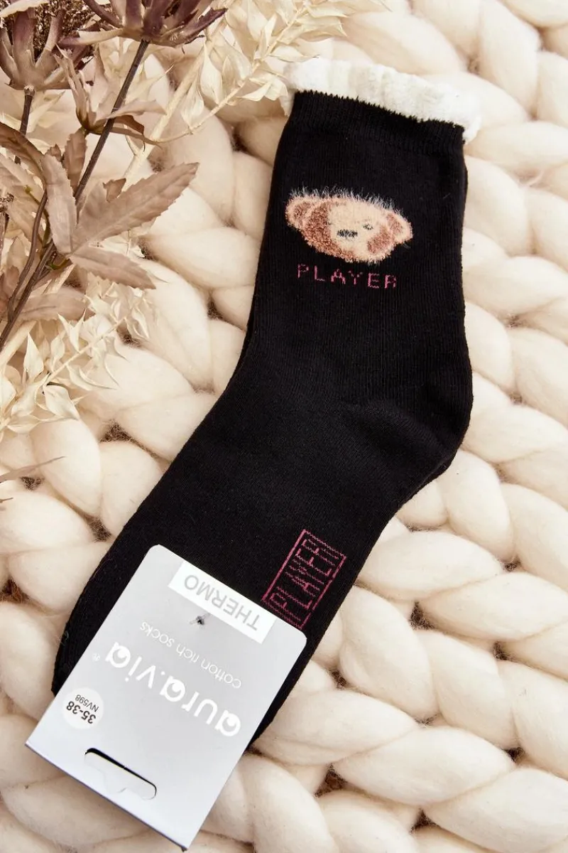 Ciepłe skarpety damskie idealne na mroźne dni. Model z naszywką w postaci misia. Lekki ściągacz sprawi, że będą idealnie dopasowane do tęgości nogi. Koniecznie powinnaś je mieć!