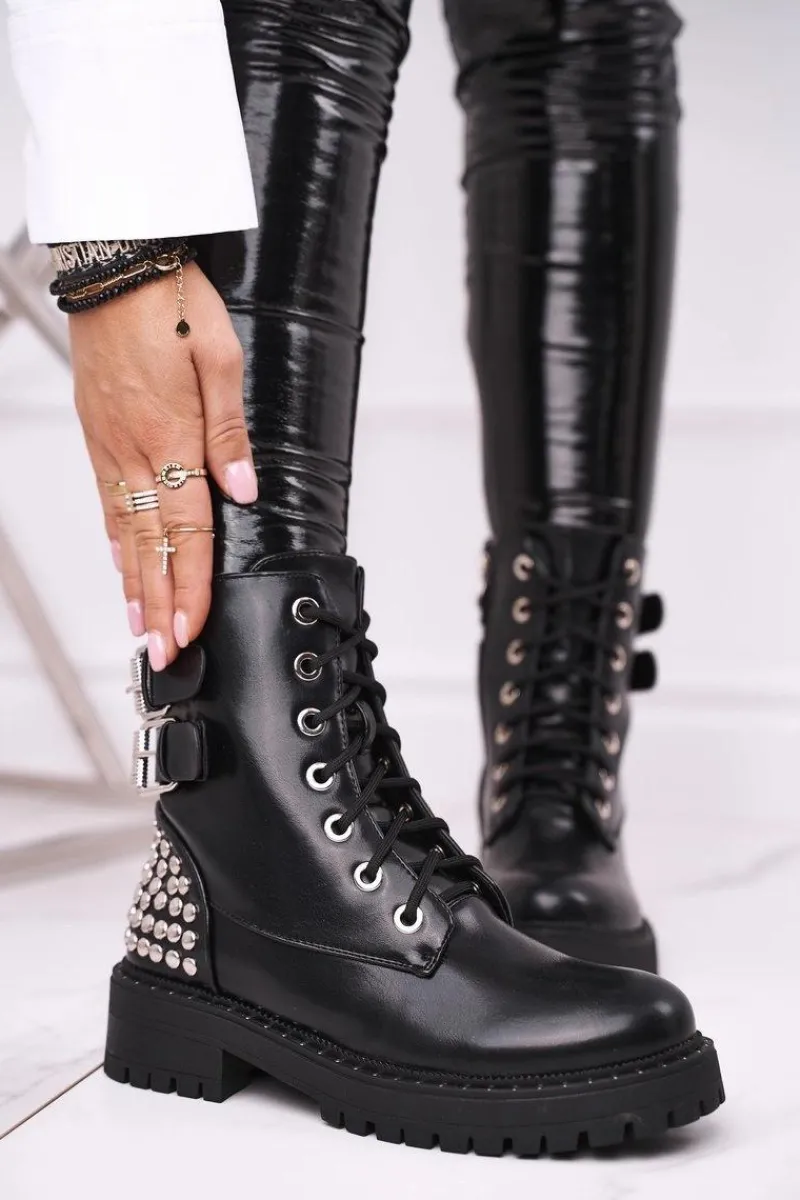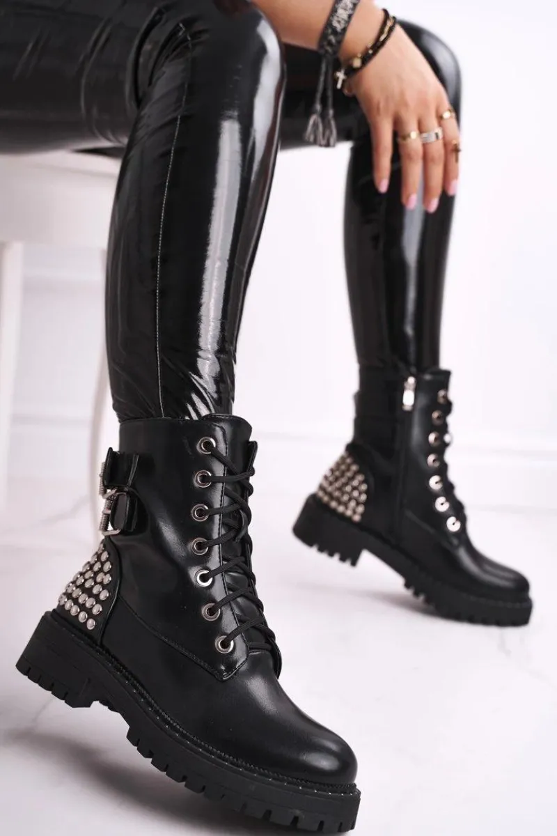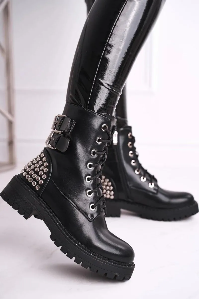 Hot Botki Damskie Z Nitami Czarne Feel Your Touch Damskie Botki Sznurowane|Czarne Botki