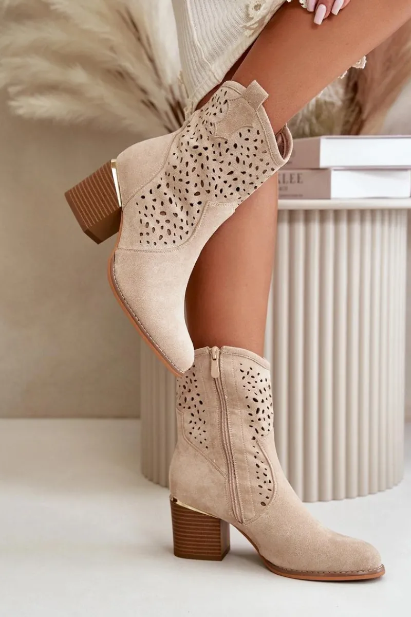 Damskie botki wykonane z eko zamszu, wyróżniają się ażurową cholewką, która sięga za kostkę. Osadzone na eleganckim słupkowym obcasie, ozdobionym złotym elementem, co dodaje im wyjątkowego charakteru. Zapinane na zamek, zapewniają wygodę użytkowania. Noski zaokrąglone, co podkreśla ich klasyczny i stylowy wygląd. Idealne do codziennych i eleganckich stylizacji. Przy wyborze rozmiaru prosimy sugerować się tabelą rozmiarów.