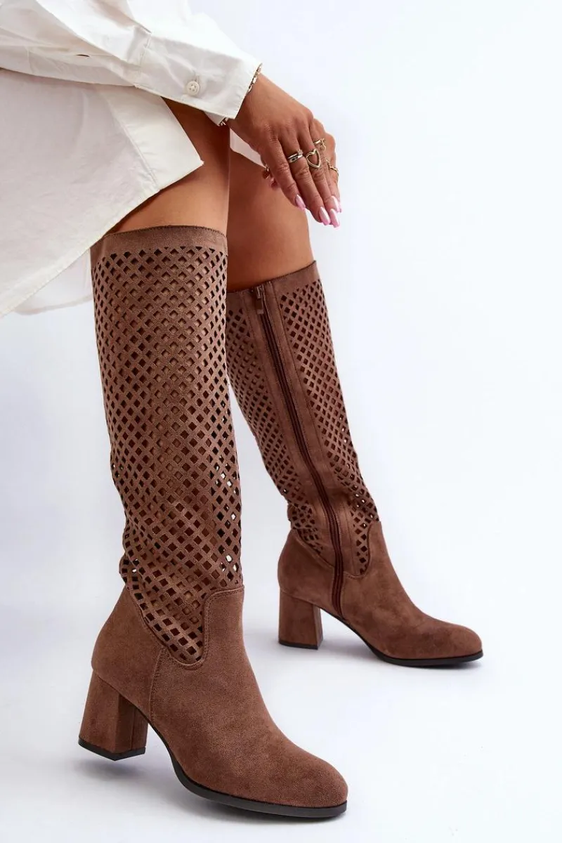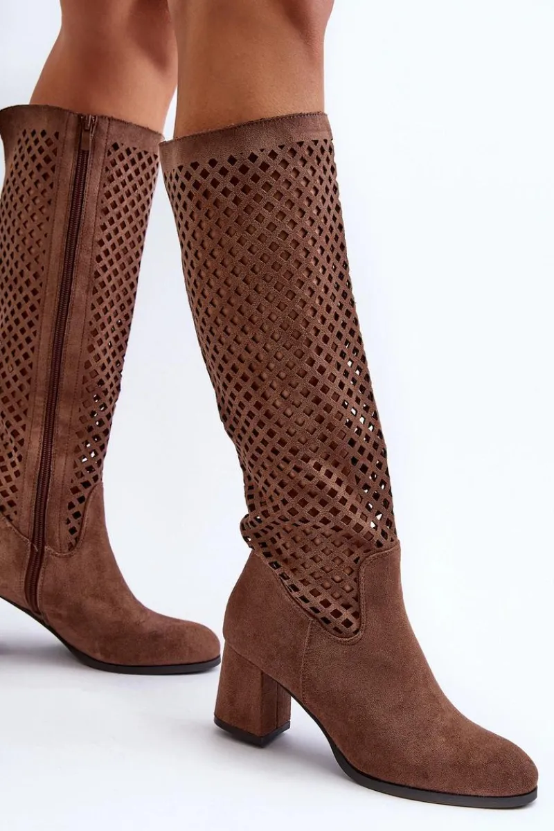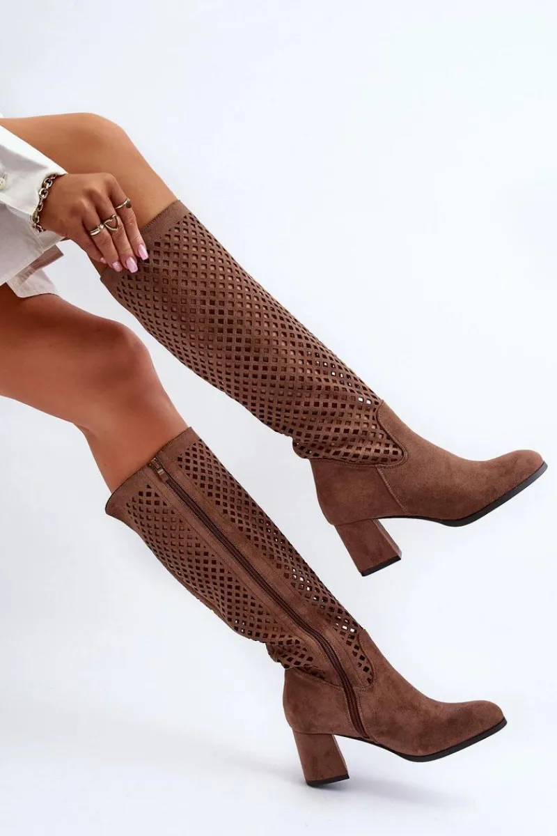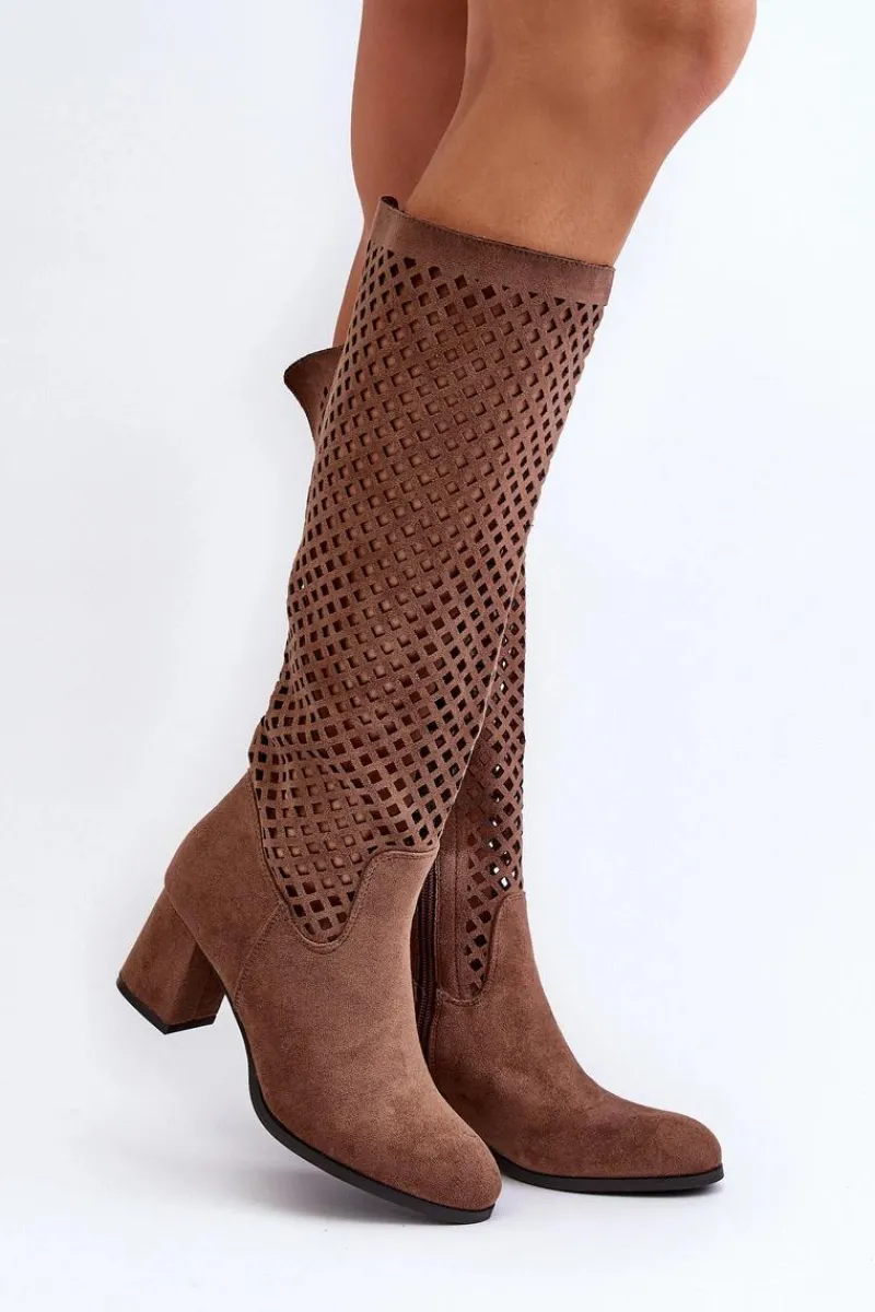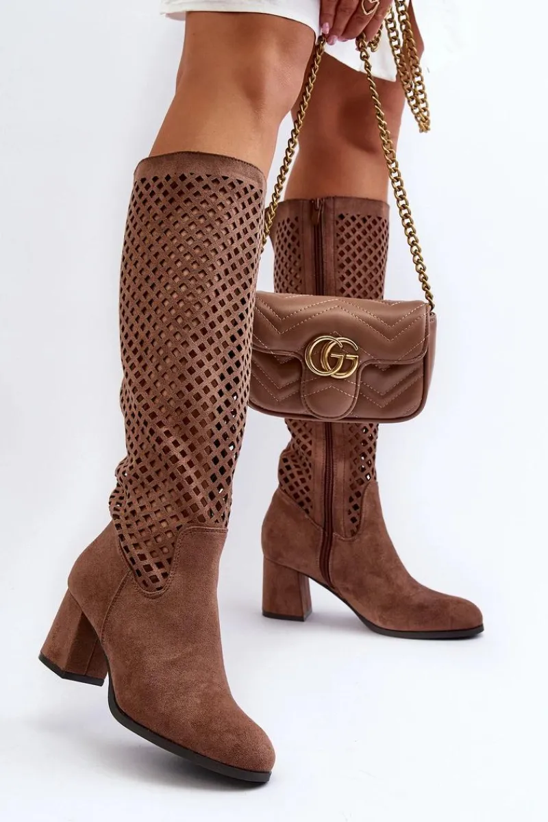 Damskie kozaki marki Jezzi. Wykonane z wysokiej jakości eko zamszu, prezentują się niezwykle elegancko. Ich ażurowy wzór dodaje im subtelnego uroku. Obcas niski słupek gwarantuje zarówno stabilność, jak i wygodę, pozwalając Ci cieszyć się pewnością kroku przez cały dzień. Usztywniony zapiętek dodaje dodatkowego wsparcia i komfortu dla Twojej stopy, co jest istotne, szczególnie podczas dłuższych spacerów. Przy wyborze rozmiaru prosimy sugerować się tabelą rozmiarów.