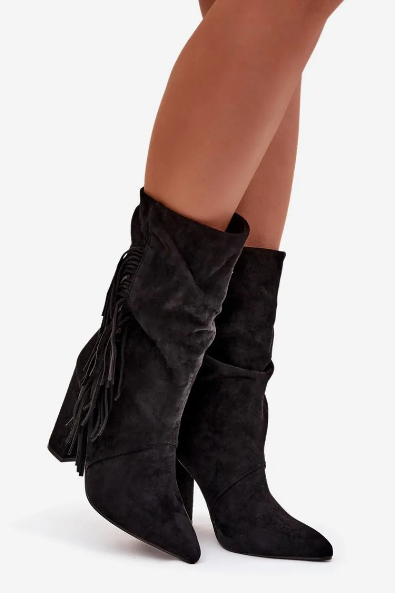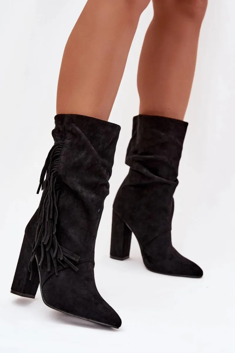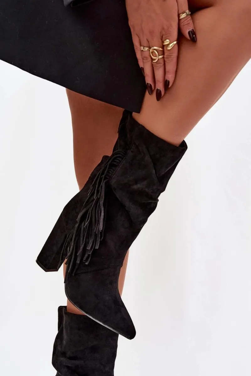 FAQ — Botki damskie na słupku z frędzlami i marszczeniem ocieplane czekoladowe Darlina