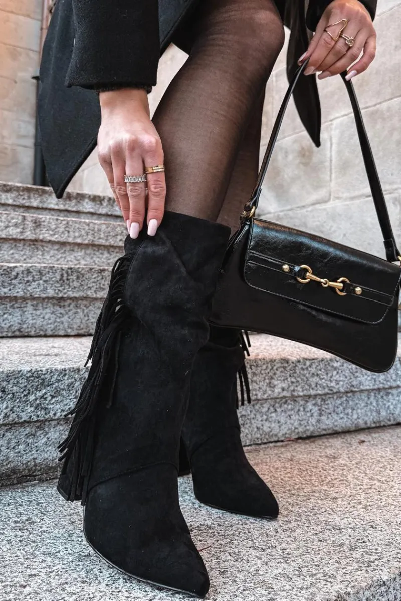 Botki Darlina to wyjątkowa propozycja dla kobiet, które lubią łączyć wygodę z odrobiną boho elegancji. Wykonane z miękkiego eko zamszu w czekoladowym odcieniu, zachwycają swoim subtelnym wykończeniem i stylowymi detalami. Marszczona cholewka oraz ozdobne frędzle dodają całości lekkości i oryginalnego charakteru, czyniąc model Darlina idealnym uzupełnieniem jesienno-zimowych stylizacji.