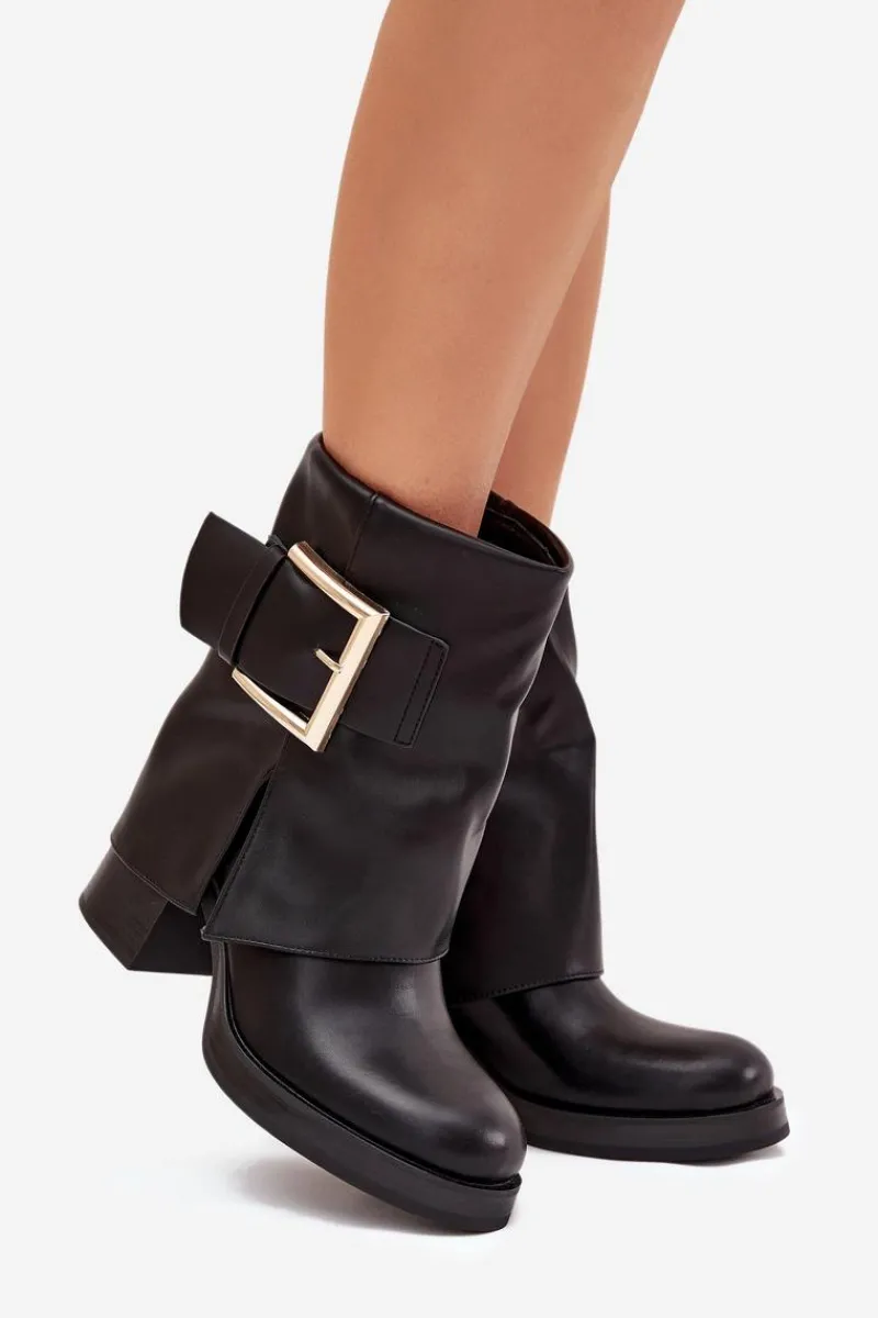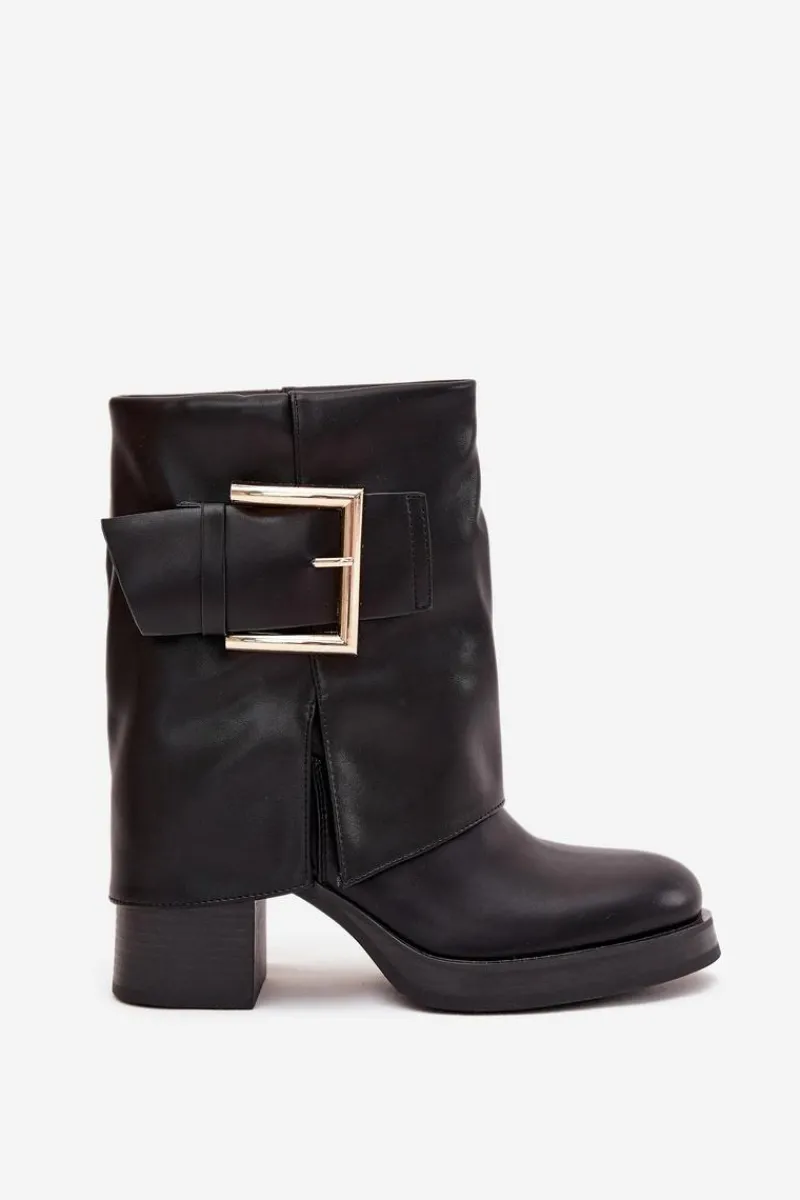 Botki damskie z eko skóry, osadzone na obcasie słupku, to stylowa propozycja na chłodniejsze dni. Model wsuwany, z ociepleniem kocem obuwniczym, zapewnia komfort i ciepło. Wyróżniają się elegancką złotą klamrą, która dodaje im wyjątkowego charakteru, a zaokrąglone noski gwarantują wygodę przez cały dzień. Doskonałe do codziennych stylizacji, idealnie komponują się z sukienkami, spódnicami czy spodniami. Przy wyborze rozmiaru prosimy sugerować się tabelą rozmiarów.
