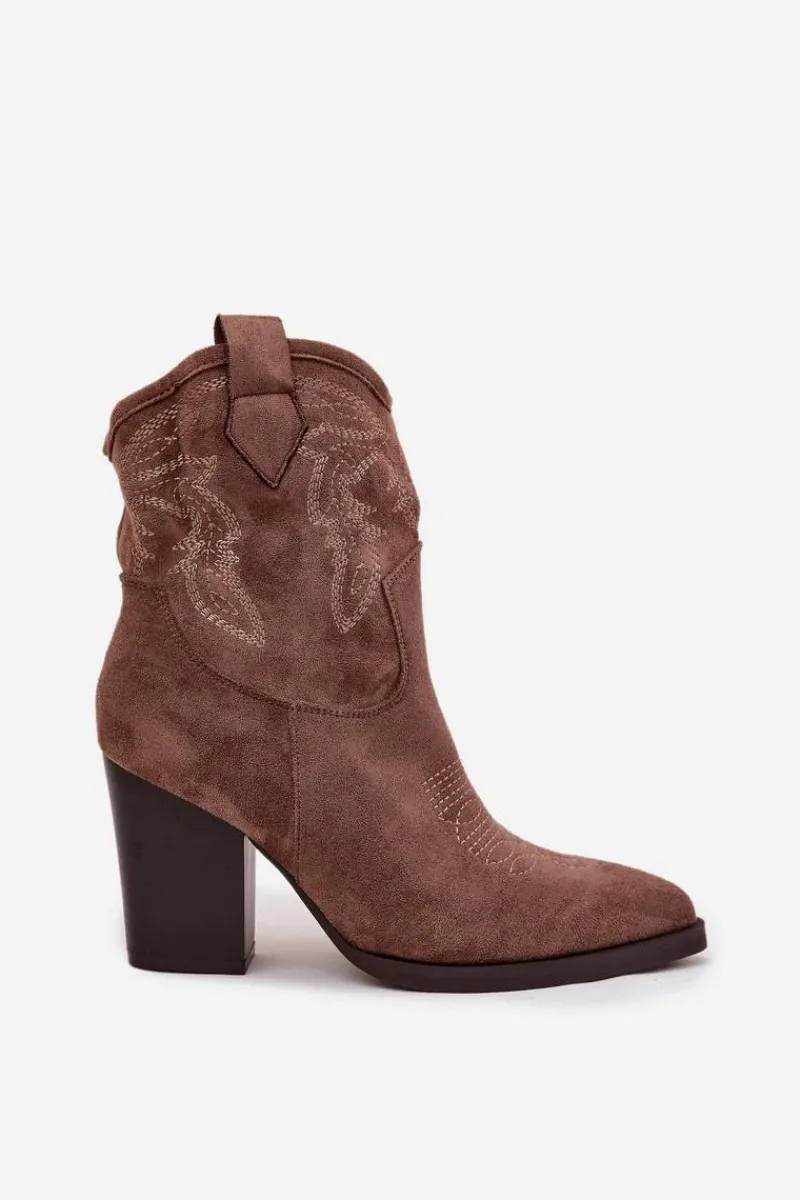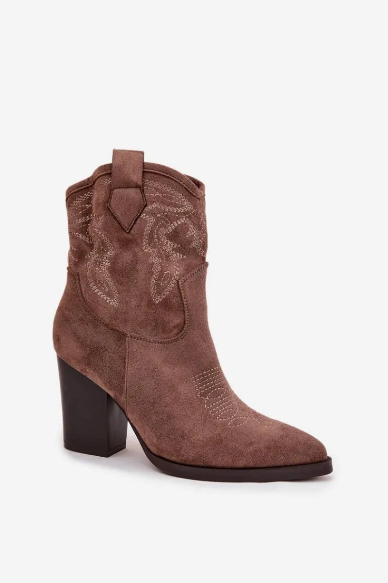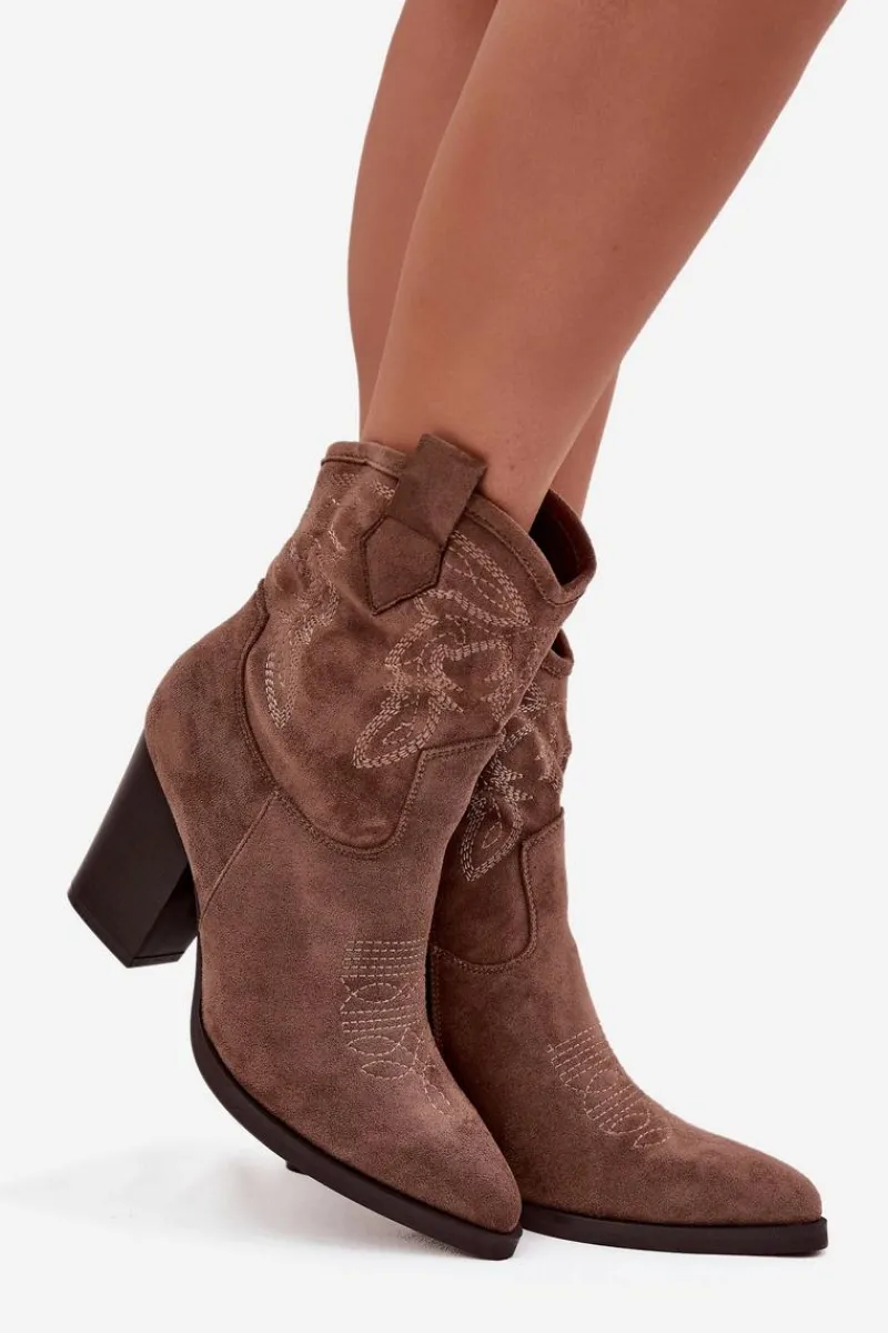 Damskie botki w stylu kowbojek wykonane z eko zamszu. Model osadzony został na stabilnym obcasie typu słupek, który optycznie wysmukla sylwetkę. Szpiczaste noski nadają całości kobiecego charakteru, a ozdobne przeszycia na cholewce podkreślają kowbojski wygląd. Praktyczne zapięcie na zamek ułatwia zakładanie i zdejmowanie butów. To stylowe botki, które doskonale uzupełnią zarówno codzienne, jak i bardziej eleganckie stylizacje, dodając im wyrazistości i charakteru.