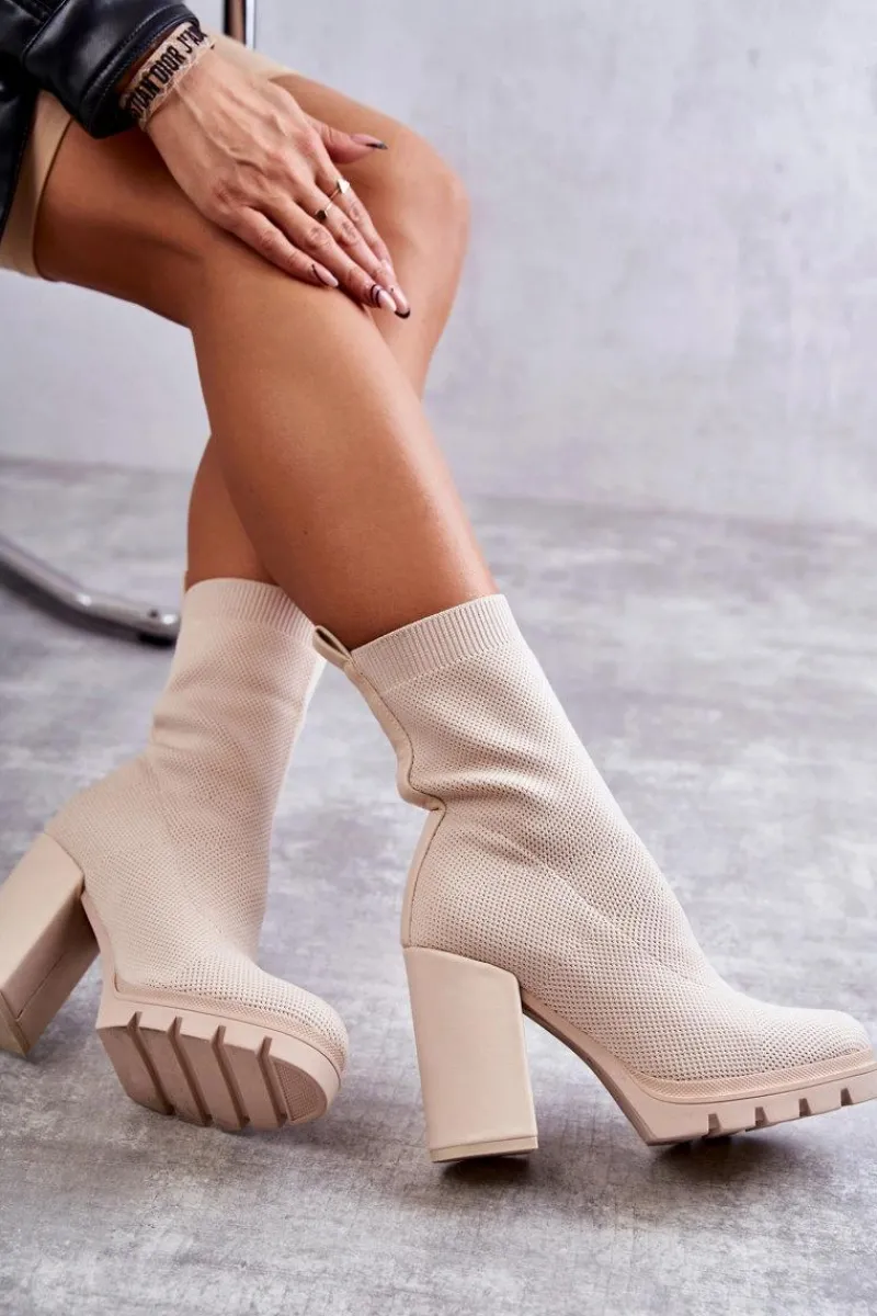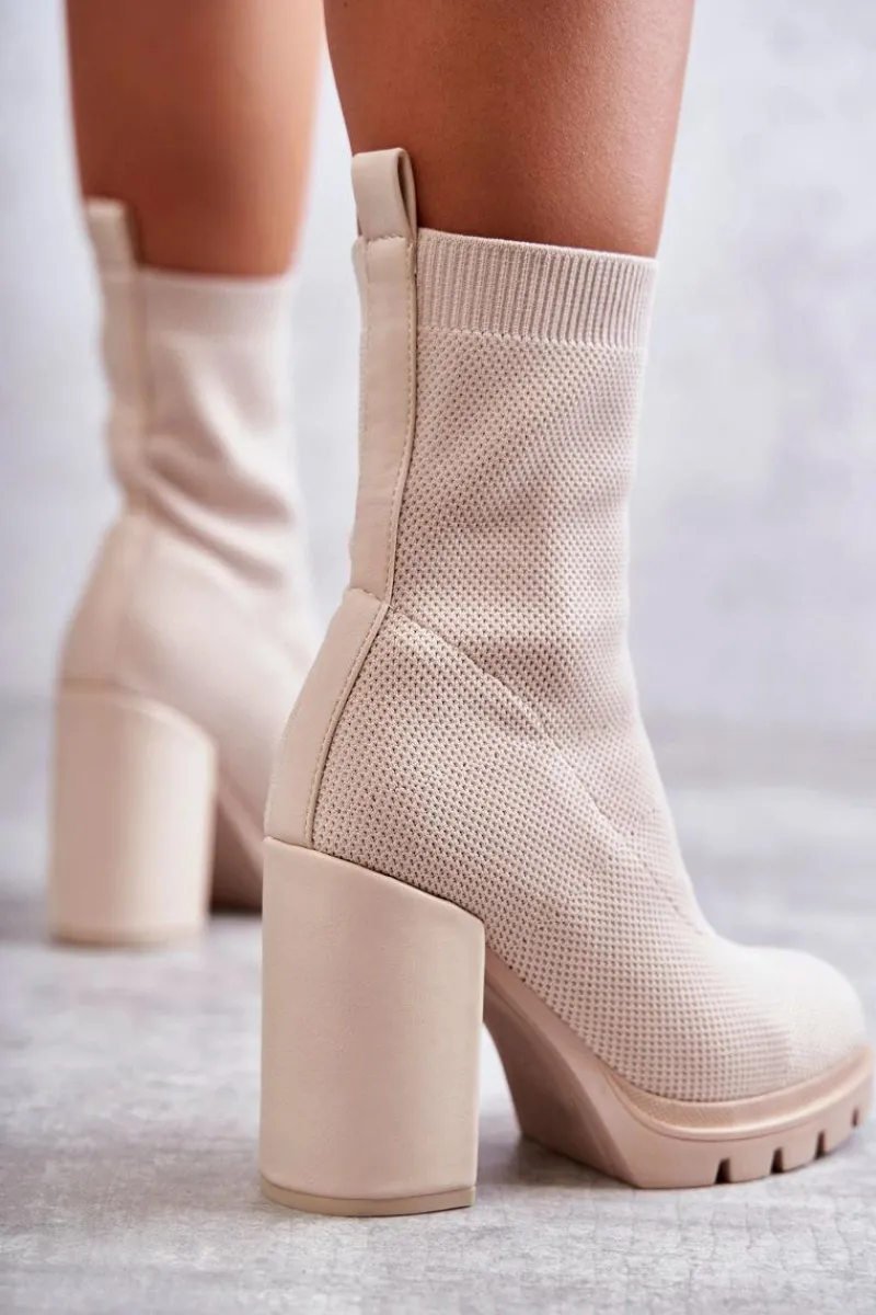 Modne botki z elastyczną cholewką za kostkę wykonaną z materiału. Na wysokości stopy są ocieplane kocem obuwniczym. Osadzone na obcasie w postaci masywnego słupka oraz platformie ze żłobieniami. Zapiętek jest usztywniany. Model ten świetnie będzie prezentować się zarówno z sukienkami, jak i jeansami. Dodatkowo buty posiadają bootstrapa, czyli pętelkę ułatwiającą zakładanie i ściąganie obuwia. Przy wyborze rozmiaru prosimy sugerować się tabelą rozmiarów.