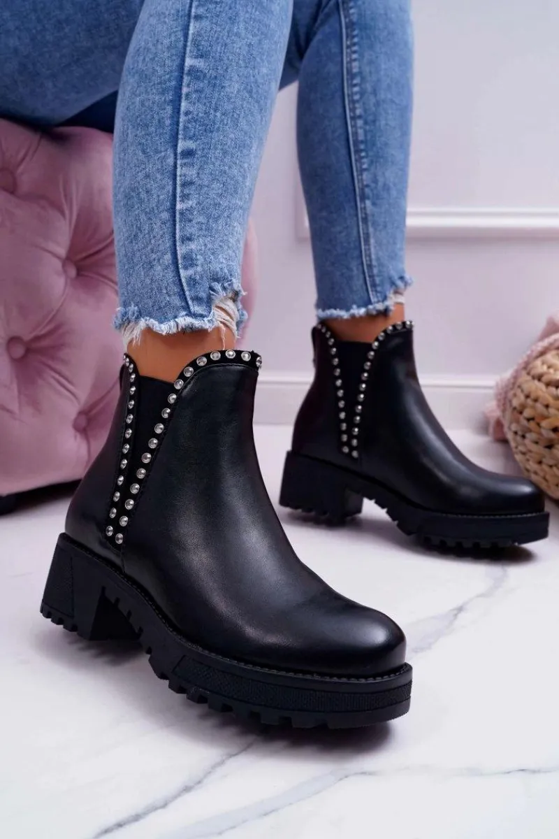 Klasyczne sztyblety, w przepięknej wersji zdobionej cyrkoniami! Wnętrze ocieplane kocem obuwniczym z krótkim włosiem. Idealnie wkomponują się do codziennych jak i bardziej wyszukanych stylizacji. Stabilny, gruby obcas oraz 3cm podeszwa to podkreślenie ich mocnego stylu. Elastyczne wstawki po bokach cholewki idealnie dopasowują buty do kształtu nogi. Model dostępny w wersji z eko-zamszu oraz skóry ekologicznej. Przy wyborze rozmiaru prosimy sugerować się tabelą rozmiarów.