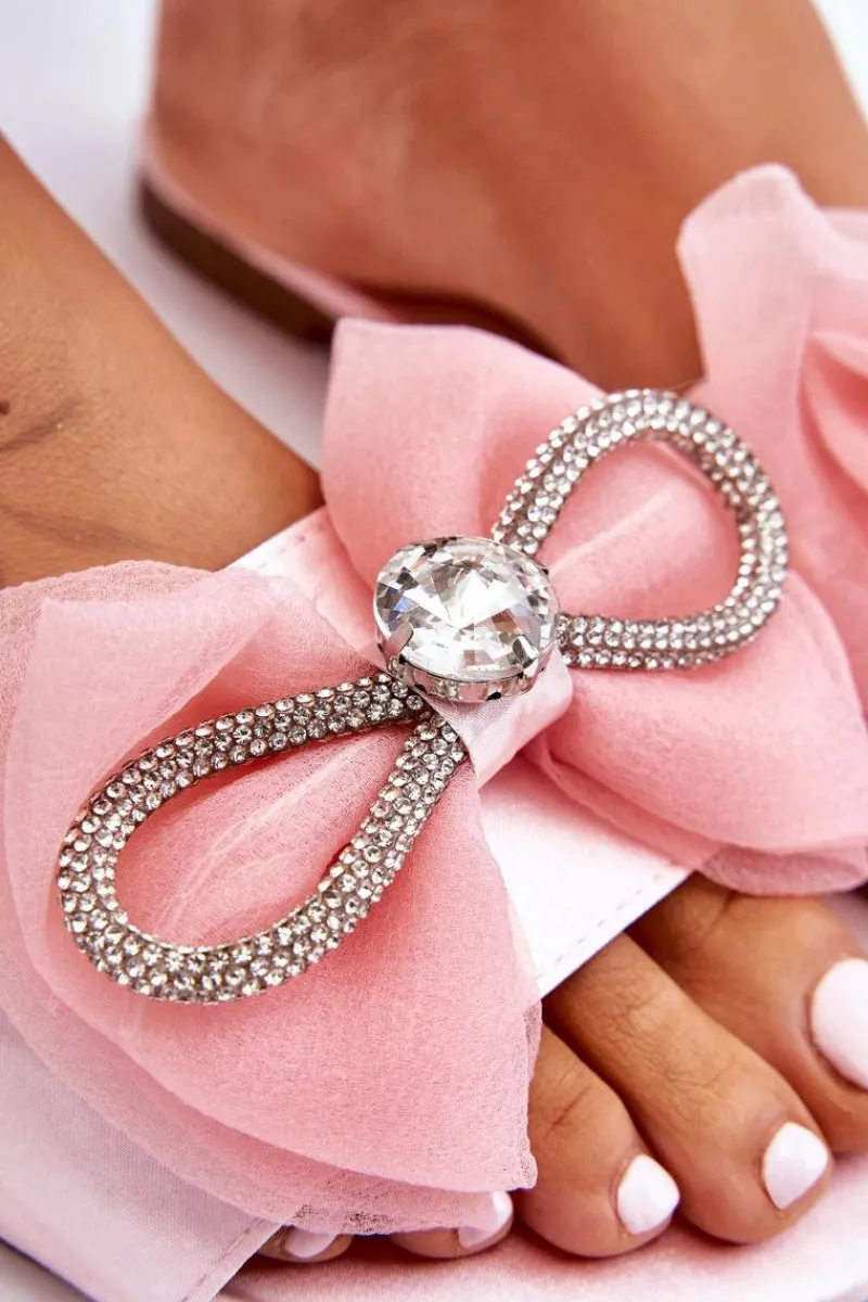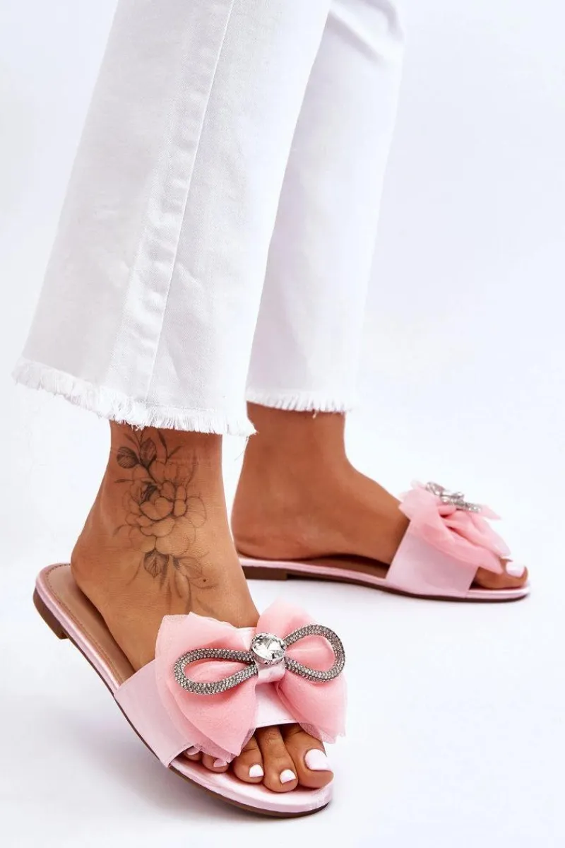 Wygodne klapki wykonane z materiału tekstylnego. Posiadają z przodu piękną kokardę z dodatkami w postaci dżetów imitujących cyrkonie. Miękka wkładka została wykonana z eko skóry. Buty te osadzono na płaskim obcasie. Model idealny na co dzień. Świetnie podkreśli wiele Twoich letnich stylizacji! Przy wyborze rozmiaru prosimy sugerować się tabelą rozmiarów.