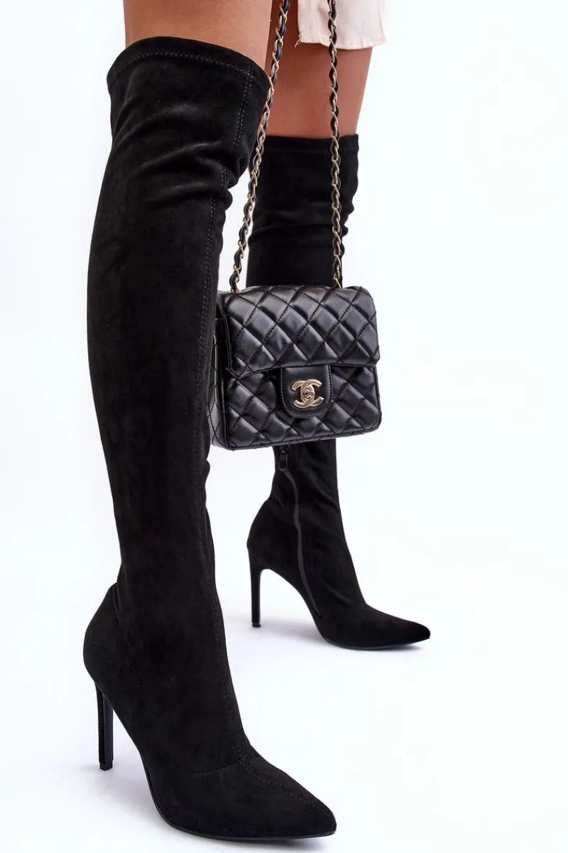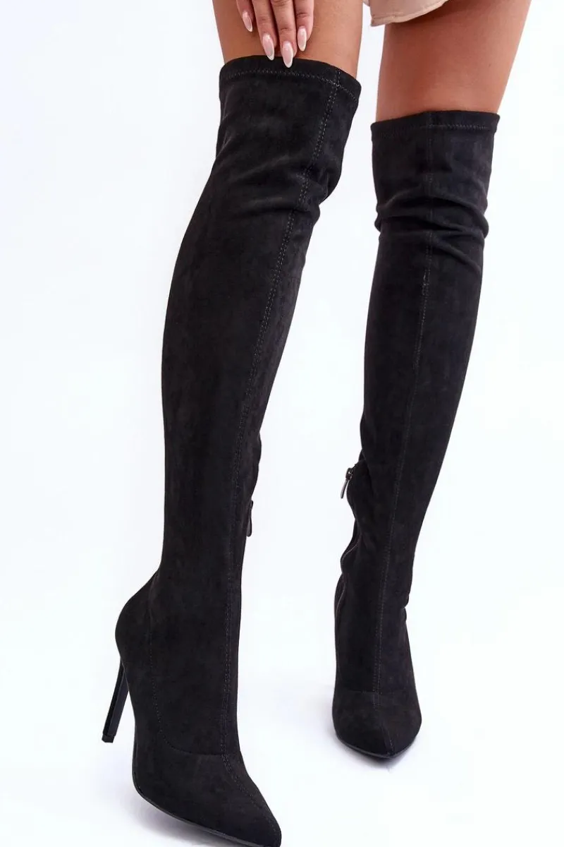 Modne kozaki za kolano zostały wykonane z eko zamszu. Zapinane na suwak w dolnej części cholewki. Obcas w postaci szpilki. Wnętrze ocieplone na wysokości stopy. Zapiętek usztywniony, noski w szpic. Koniecznie musisz mieć ten model w swojej garderobie! Przy wyborze rozmiaru prosimy kierować tabelą rozmiarów.