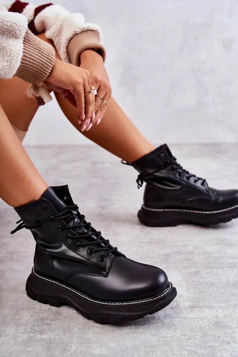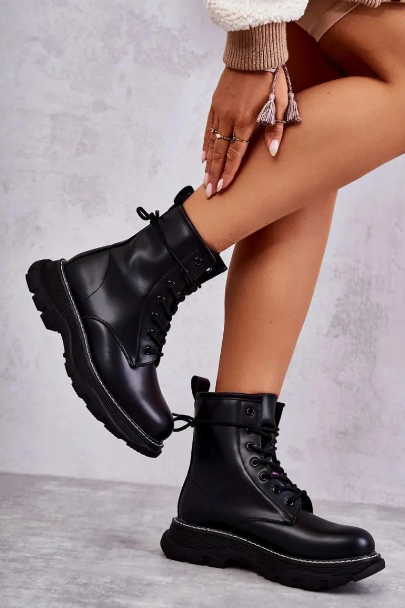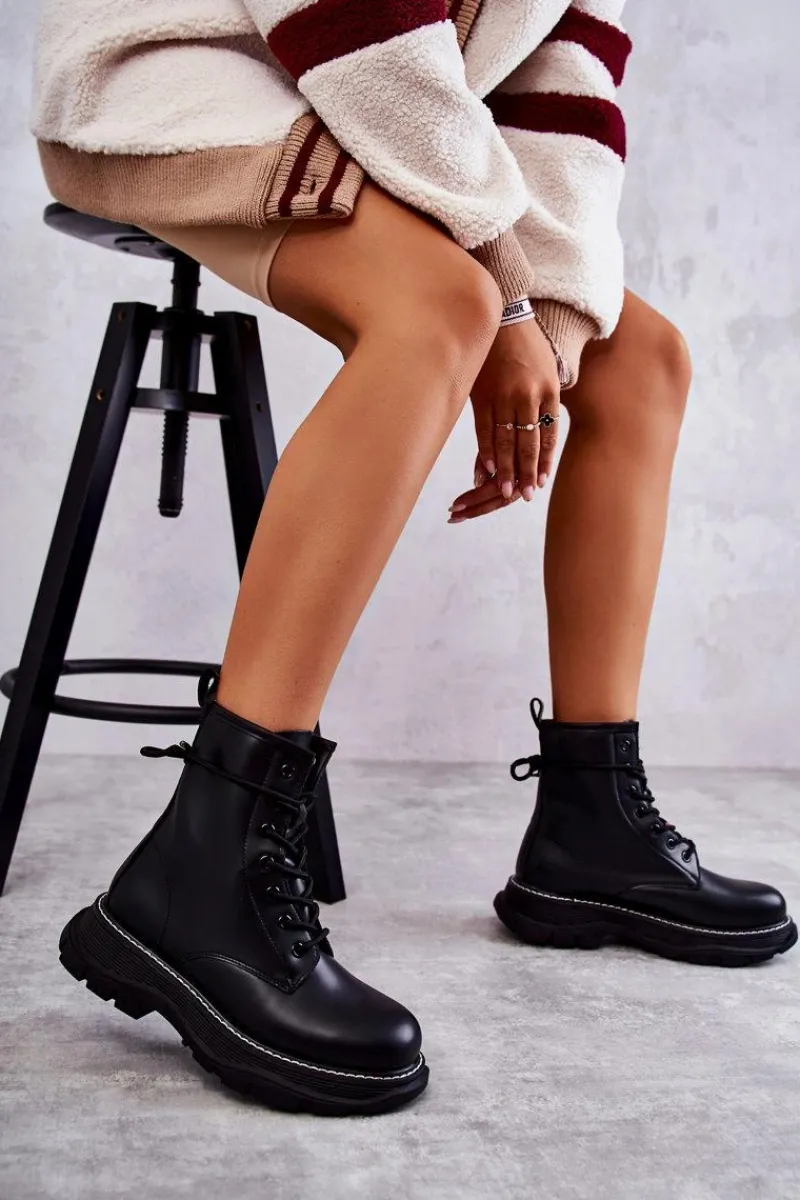 Damskie botki w stylu glanów zostały osadzone na platformie i płaskim obcasie z gumowego tworzywa. Posiadają klasyczne sznurowanie. Wyższa cholewka za kostkę została wykonana z eko skóry. Nosek zaokrąglony. Botki posiadają usztywniany zapiętek. Podeszwa obszyta nicią. Świetnie będą prezentować się z woskowanymi spodniami. Przy wyborze rozmiaru prosimy sugerować się tabelą rozmiarów.