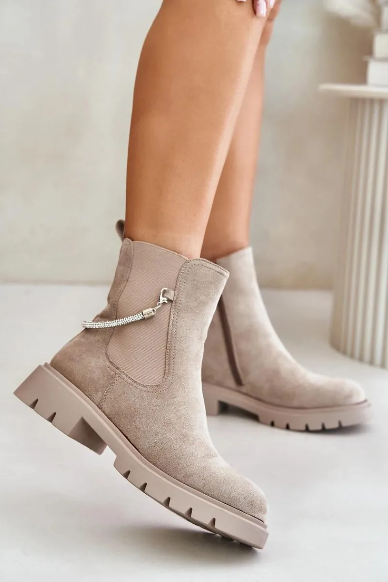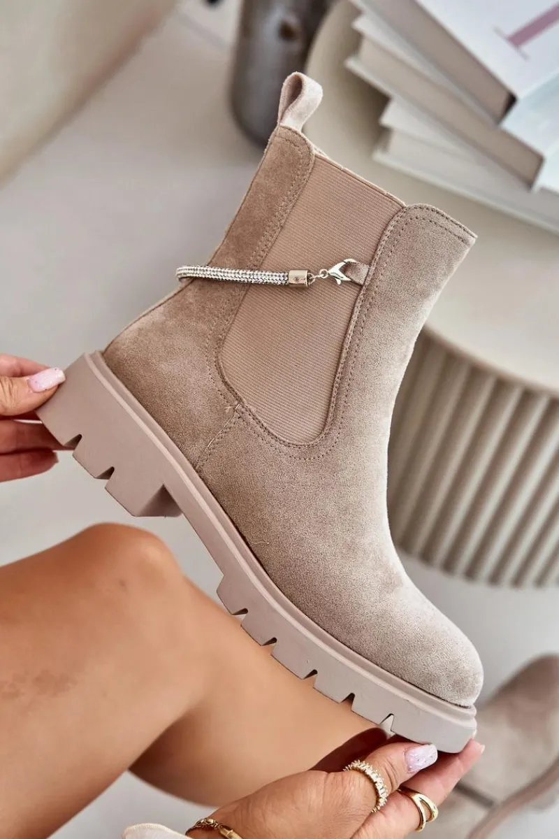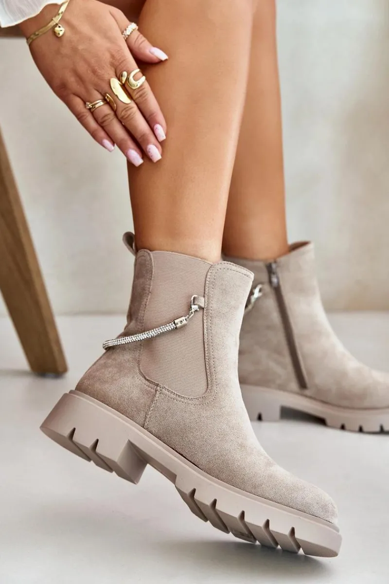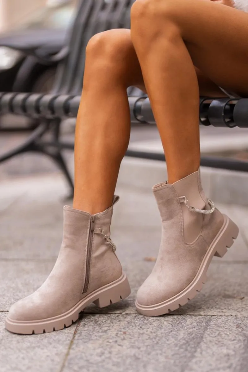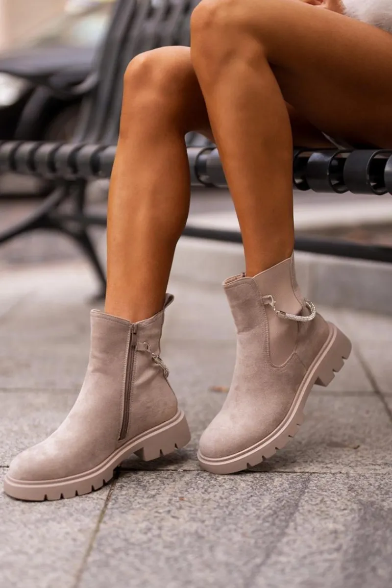 Botki damskie wykonane z eko zamszu. Model ten wyróżnia się ozdobnym, błyszczącym, odpinanym paseczkiem, który nadaje wyjątkowego uroku. Środek ocieplany kocem obuwniczym, co zapewni ciepło i komfort w chłodniejsze dni. Przy wyborze rozmiaru prosimy sugerować się tabelą rozmiarów.