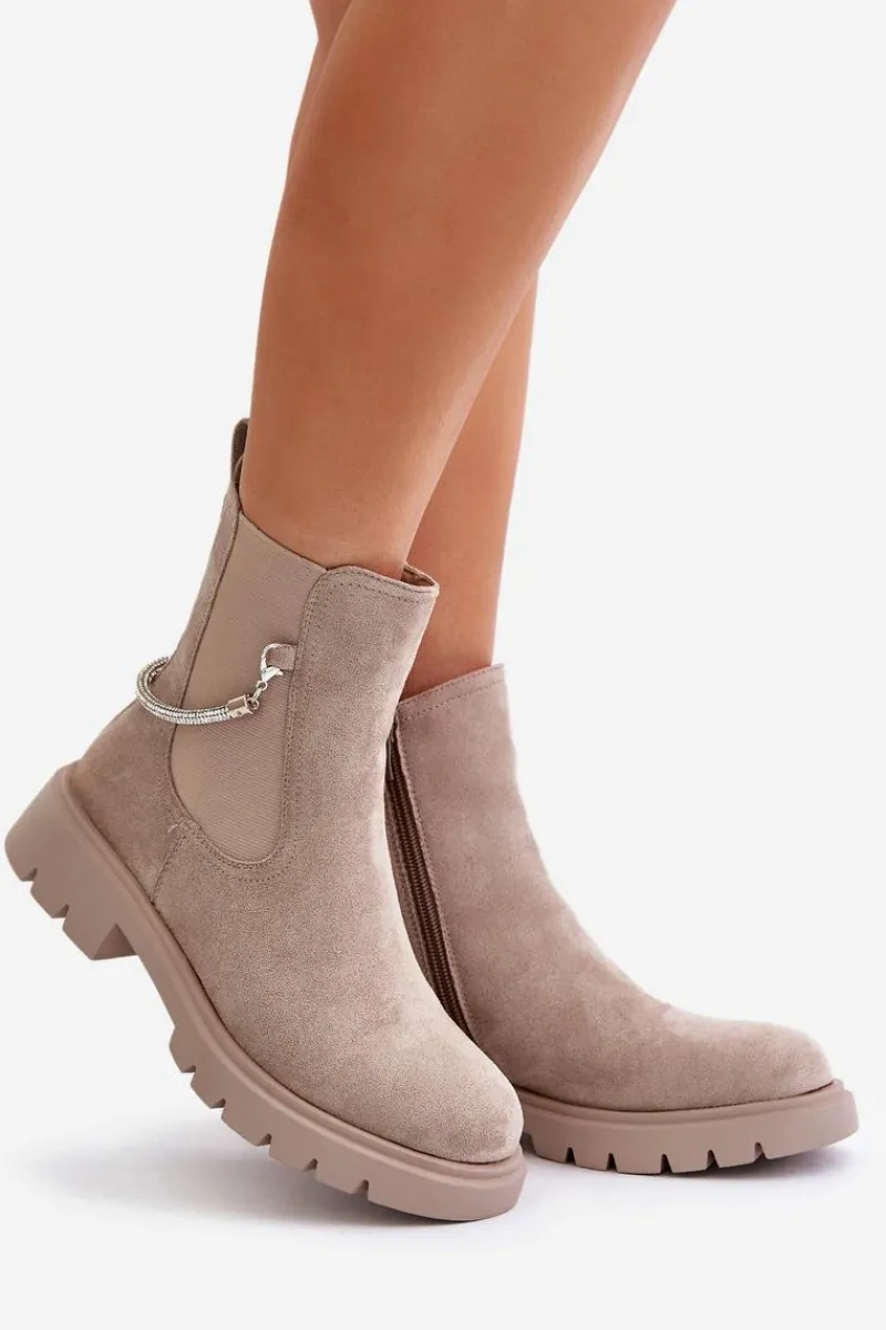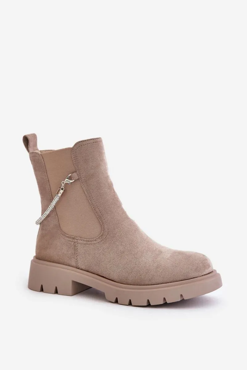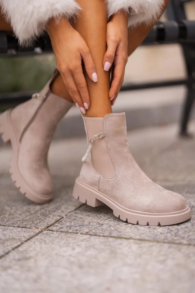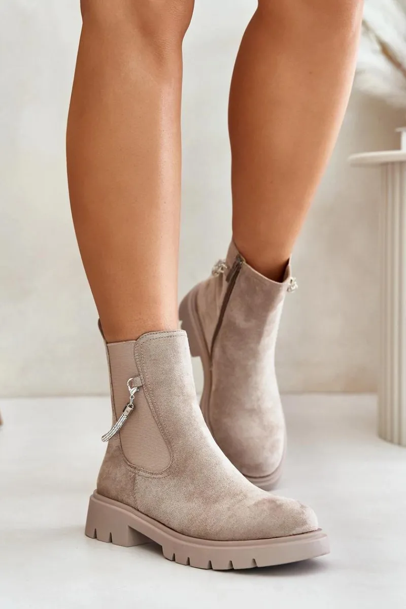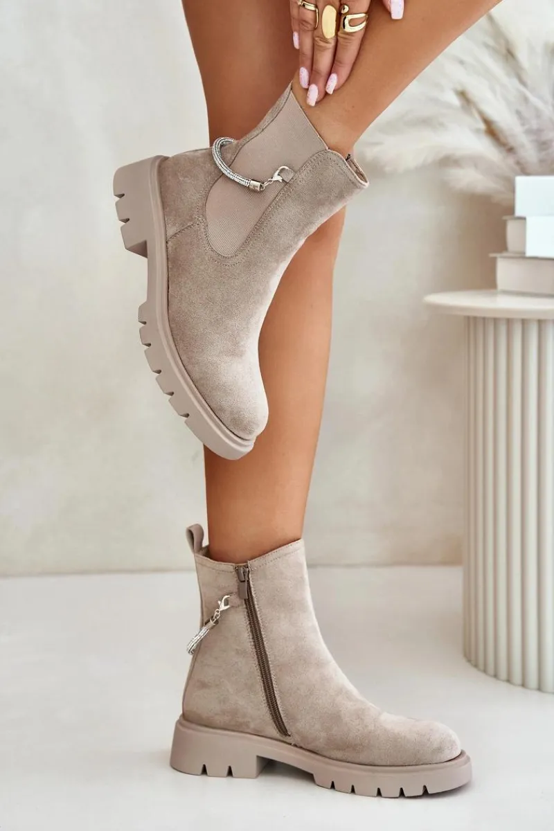 Botki damskie wykonane z eko zamszu. Model ten wyróżnia się ozdobnym, błyszczącym, odpinanym paseczkiem, który nadaje wyjątkowego uroku. Środek ocieplany kocem obuwniczym, co zapewni ciepło i komfort w chłodniejsze dni. Przy wyborze rozmiaru prosimy sugerować się tabelą rozmiarów.