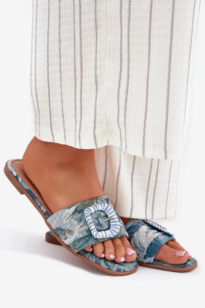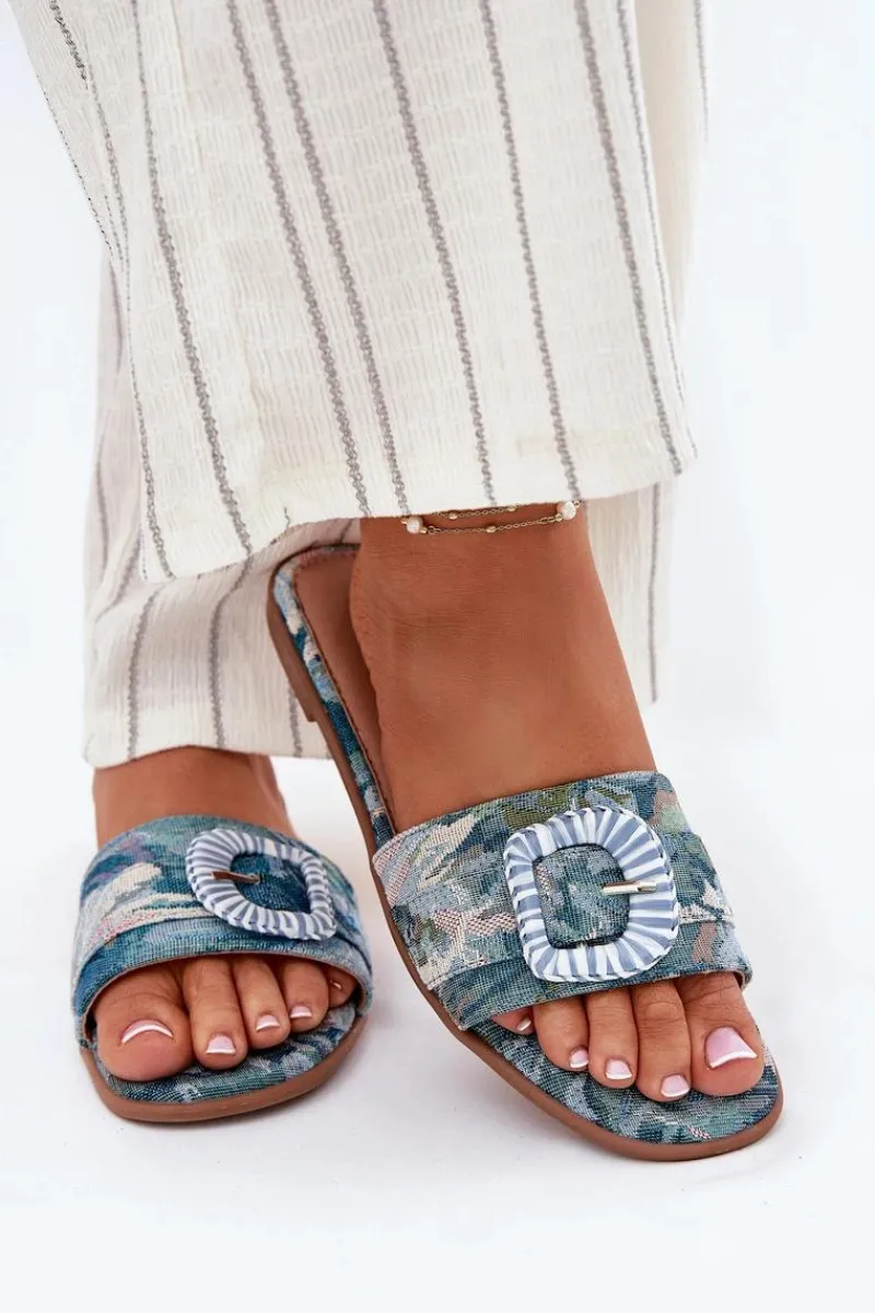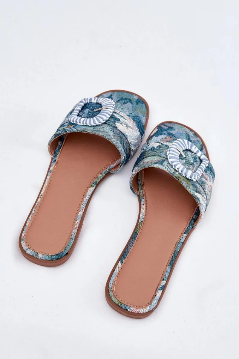 Klapki damskie na płaskim obcasie, wykonane z materiału tekstylnego. Z przodu wyróżnia je ozdobna klamra, która dodaje stylu i elegancji. To doskonały wybór na letnie dni – lekkie, wygodne i modne, świetnie sprawdzą się na co dzień. Przy wyborze rozmiaru prosimy sugerować się tabelą rozmiarów.