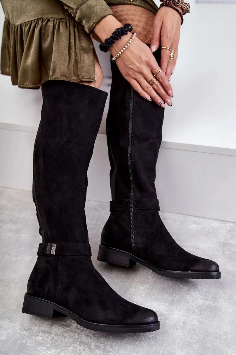 Klasyczne, damskie kozaki zostały wykonane z eko skórzanych materiałów z dbałością o szczegóły. Model ten posiada suwak na całej długości cholewki. Kozaki osadzono na płaskim obcasie. Nie posiadają ocieplenia. Dodatkowo zapiętek jest usztywniany. Cholewka przyozdobiona paskiem z metalową blaszką. Cholewka u góry posiada nieregularne zakończenie. Przy wyborze rozmiaru prosimy sugerować się tabelą rozmiarów.