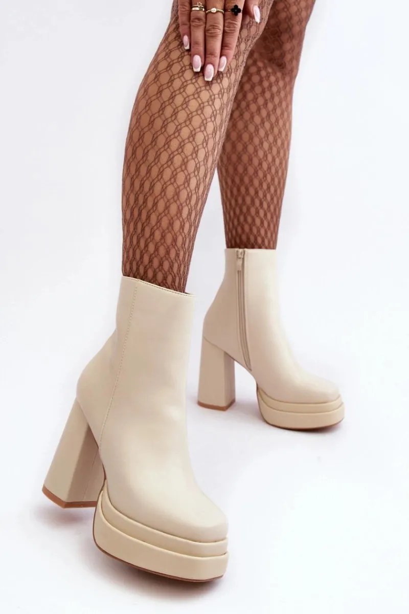 Masywne botki damskie wykonane z eko skóry. Osadzone na wysokim obcasie w postaci słupka i platformie. Noski w kwadrat. Zapiętek jest usztywniony. Model ten zapinany jest na suwak z boku. Botki te doskonale sprawdzą się w jesiennych stylizacjach. Przy wyborze rozmiaru prosimy kierować się tabelą rozmiarów
