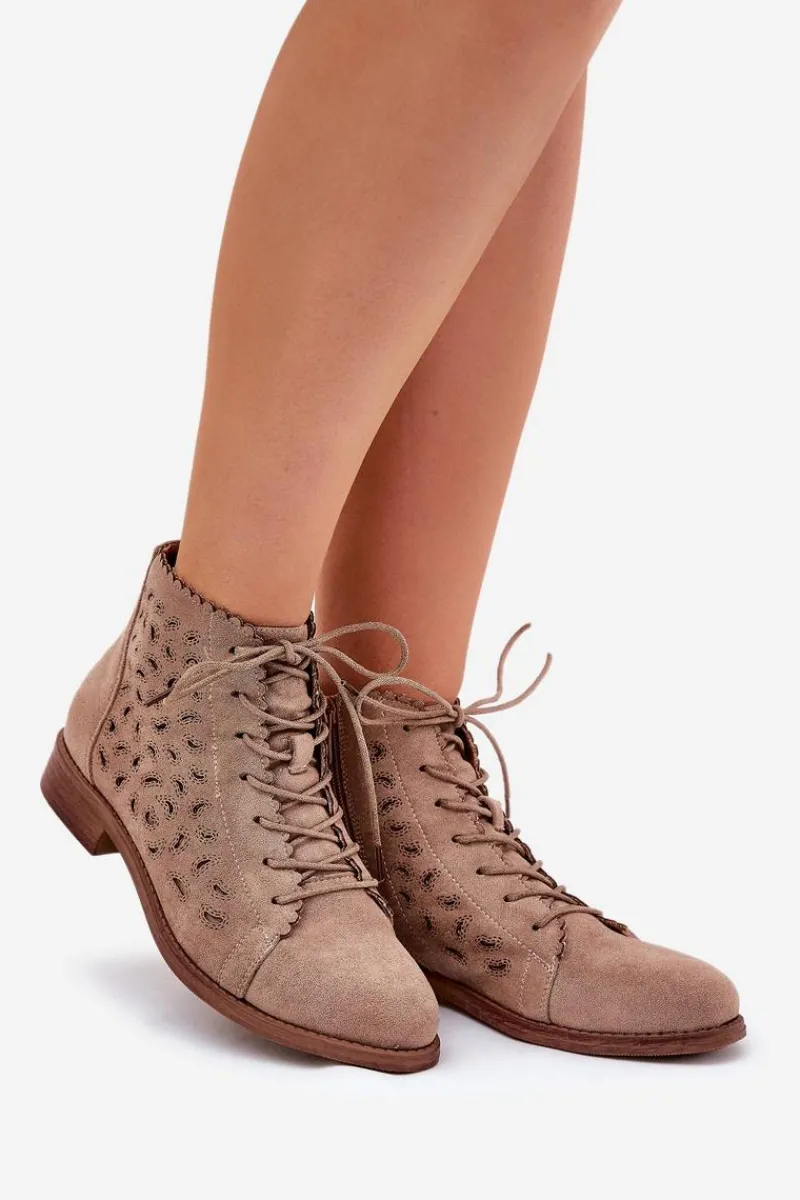 Botki damskie z eko zamszu to stylowa propozycja na chłodniejsze dni. Niska cholewka ozdobiona ażurowym wzorem nadaje im lekkości. Sznurowane i zapinane na zamek, co zapewnia łatwość zakładania oraz dopasowanie do stopy. Te botki będą doskonałym wyborem do codziennych stylizacji, łącząc funkcjonalność z modnym wyglądem.Przy wyborze rozmiaru prosimy sugerować się poniższą tabelą rozmiarów.