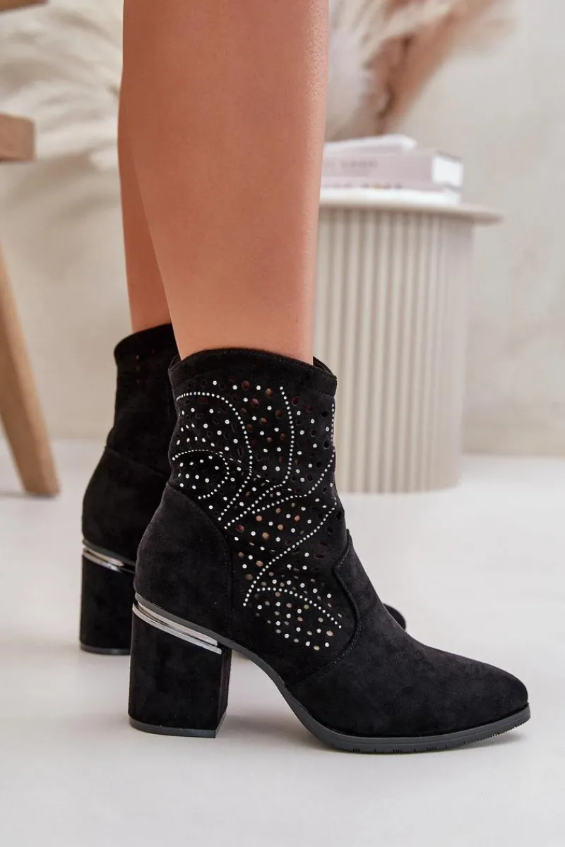 Eleganckie ażurowe botki damskie wykonane z wysokiej jakości eko zamszu. Osadzone na stabilnym słupkowym obcasie. Noski w szpic. Model zapinany na zamek zapewnia wygodę i łatwość zakładania. Idealne na różne okazje, te botki będą stylowym uzupełnieniem Twojej garderoby. Przy wyborze rozmiaru prosimy sugerować się tabelą rozmiarów.