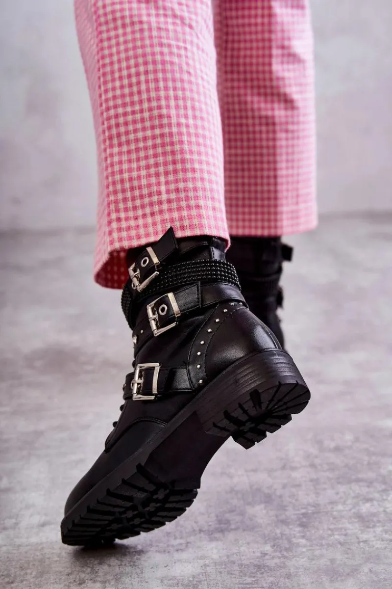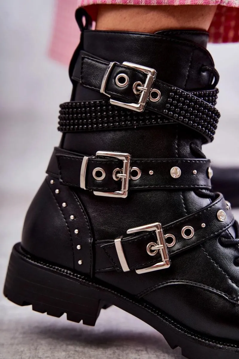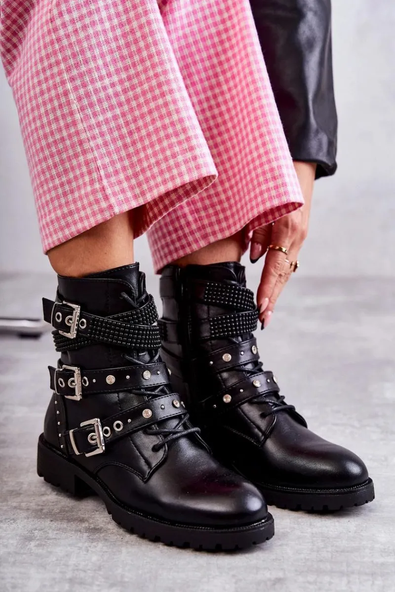 Modne damskie botki zostały wykonane z wierzchu z eko skóry. Na cholewce znajdują się paski z ozdobami w postaci ćwieków. Dodatkowo są one regulowane i posiadają klamry. Model ten jest zapinany na zamek błyskawiczny oraz sznurowany. Wnętrze botków jest pokryte miękkim kocem obuwniczym. Delikatna platforma oraz płaski obcas zapewnią stabilność na każdym kroku. Przy wyborze rozmiaru prosimy sugerować się tabelą rozmiarów.