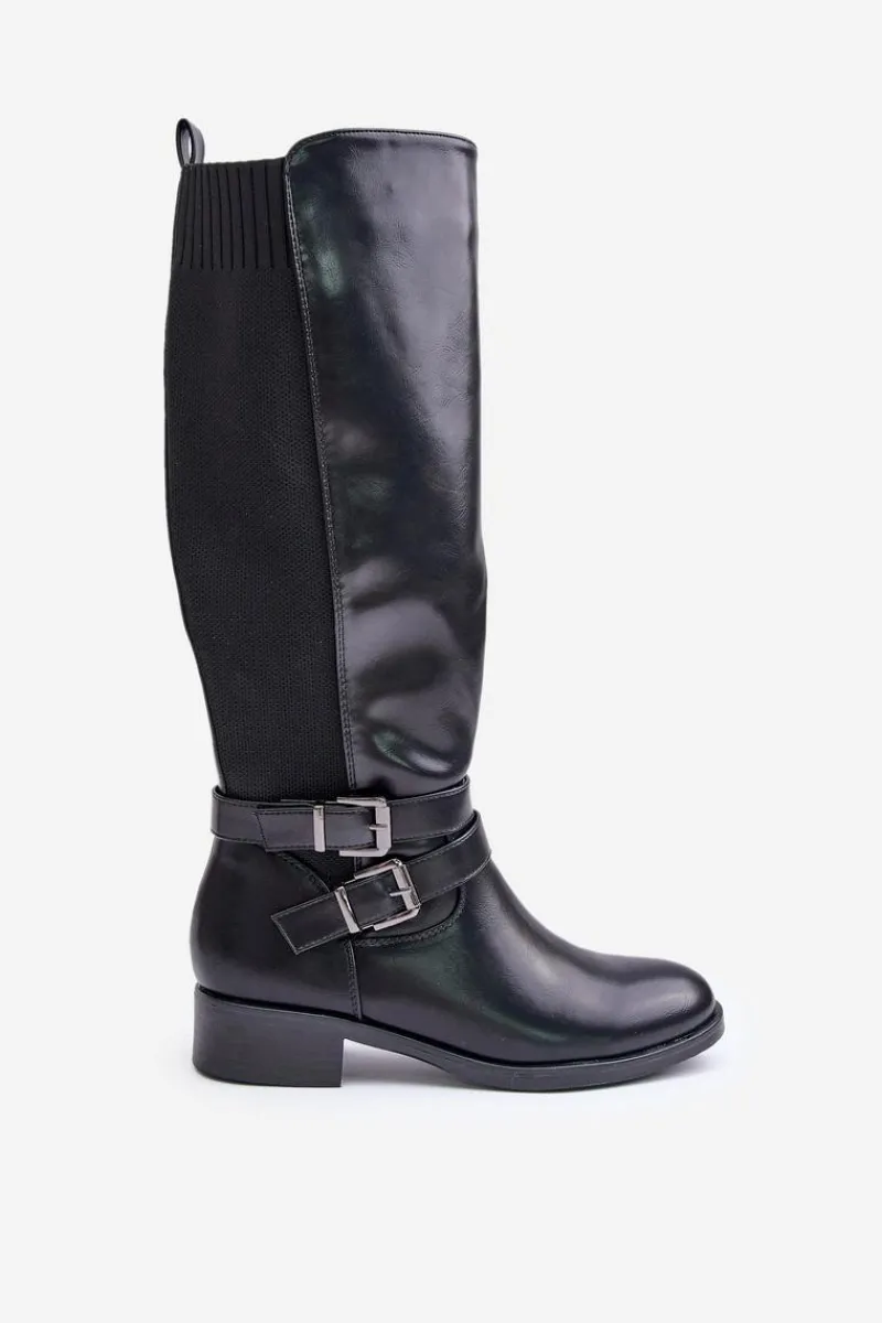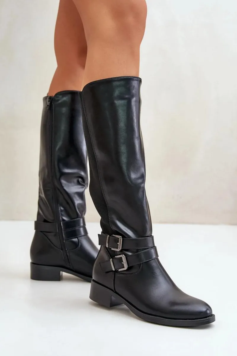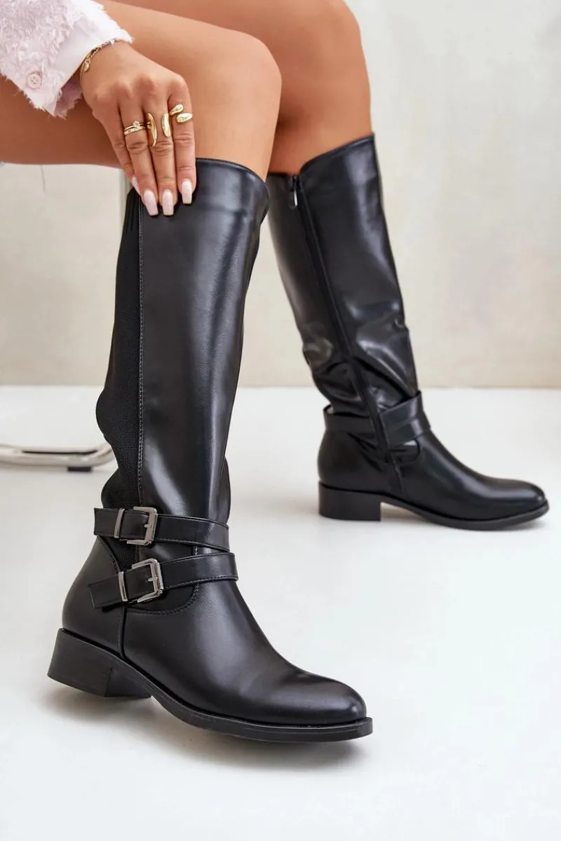 Damskie kozaki o klasycznym kroju, wykonane z eko skóry. Osadzone na płaskim obcasie, co zapewnia wygodę noszenia na co dzień. Noski zaokrąglone, a cholewka sięga przed kolano, dodając elegancji i wydłużając sylwetkę. Zapinane na zamek, ułatwiający zakładanie. Dodatkowym atutem są ozdobne paski ze złotymi klamrami, które nadają wyjątkowego charakteru. Przy wyborze rozmiaru prosimy sugerować się tabelą rozmiarów.