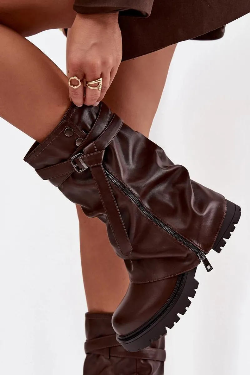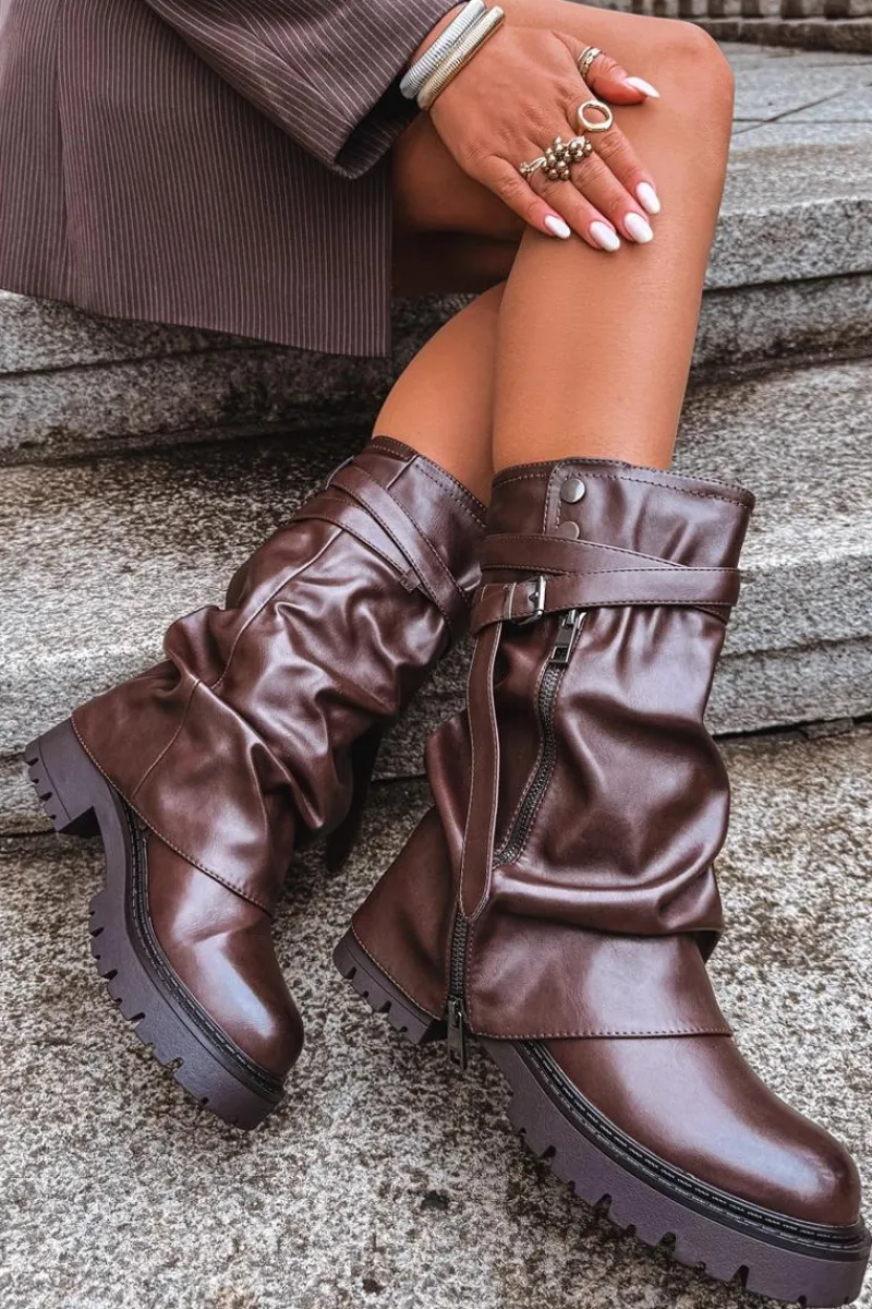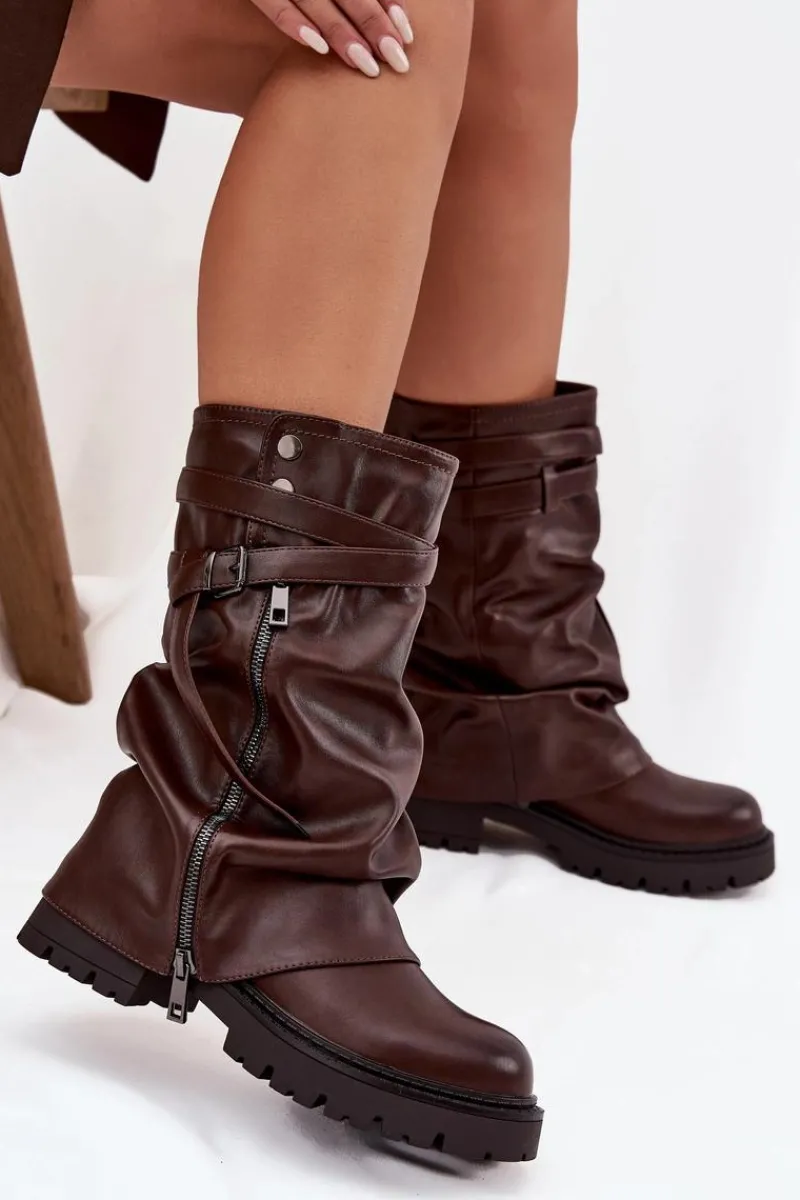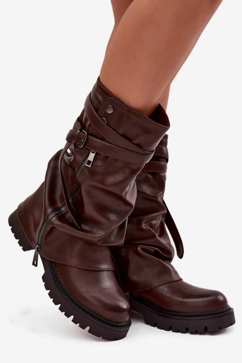 Kozaki damskie sięgające do połowy łydki to stylowa propozycja dla kobiet, które cenią modny wygląd i wygodę na co dzień. Model wyróżnia się efektowną, wywiniętą oraz delikatnie marszczoną cholewką. Uwagę przyciągają stylowe detale — ozdobny pasek z klamrą oraz dekoracyjny zamek, które dodają nowoczesnego wyrazu i podkreślają ich wyjątkowy wygląd. Płaski obcas gwarantuje wygodę nawet podczas długiego noszenia, sprawiając, że kozaki doskonale sprawdzą się w codziennym użytkowaniu. To modny fason, który świetnie prezentuje się w połączeniu z dopasowanymi spodniami, legginsami, a także z sukienkami czy spódnicami, tworząc stylowe i kobiece stylizacje idealne na sezon jesienno-zimowy. Przy wyborze rozmiaru prosimy sugerować się tabelą rozmiarów.