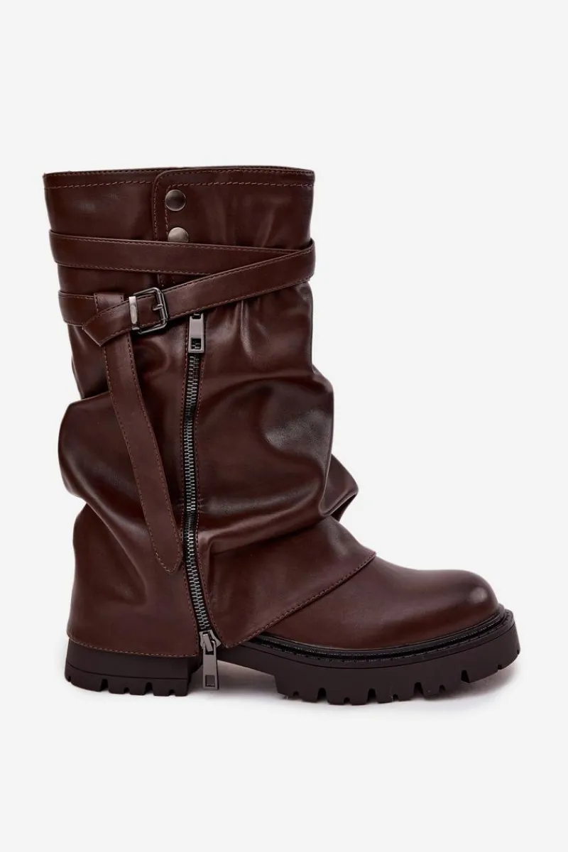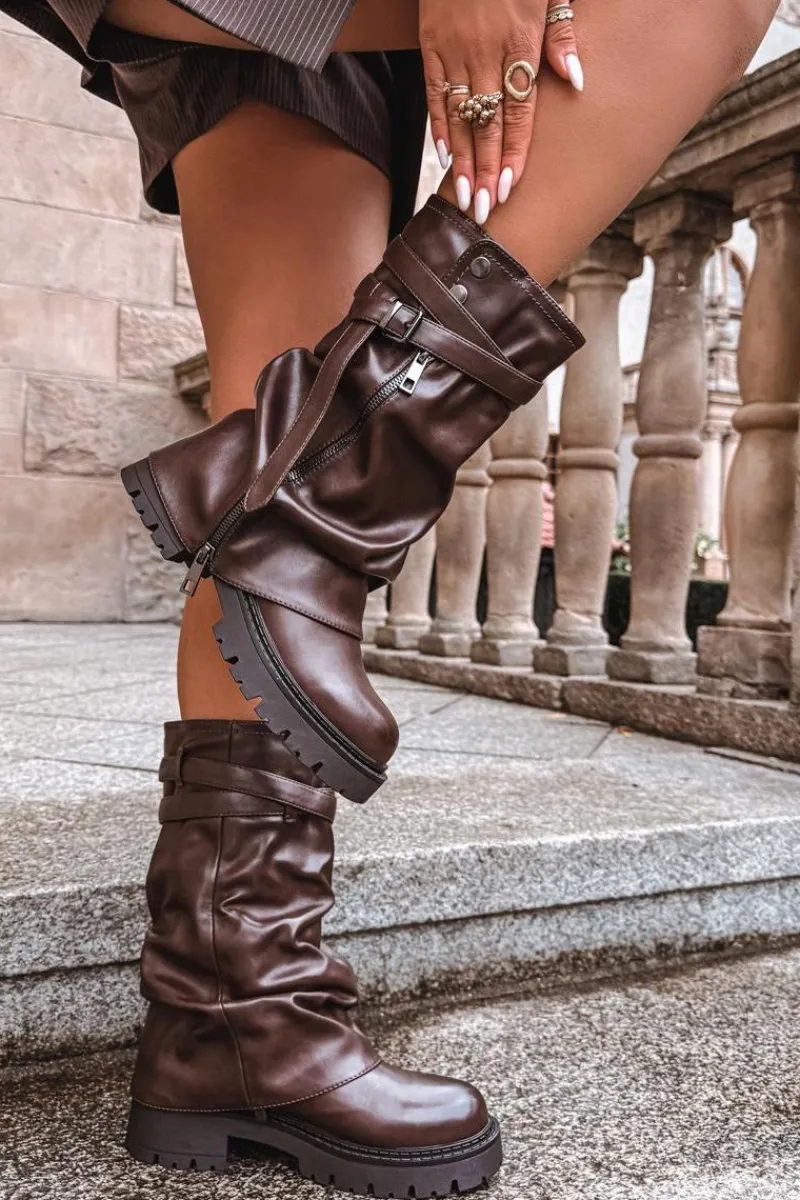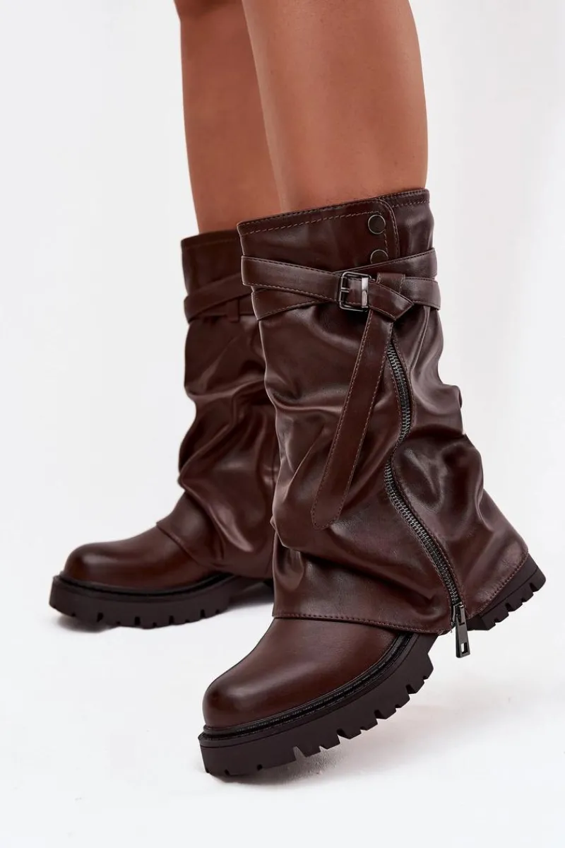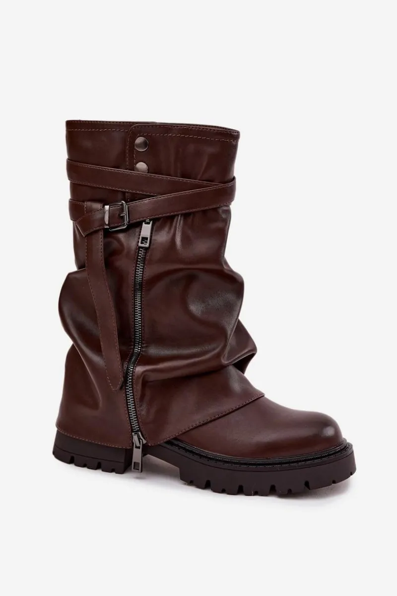 Kozaki damskie sięgające do połowy łydki to stylowa propozycja dla kobiet, które cenią modny wygląd i wygodę na co dzień. Model wyróżnia się efektowną, wywiniętą oraz delikatnie marszczoną cholewką. Uwagę przyciągają stylowe detale — ozdobny pasek z klamrą oraz dekoracyjny zamek, które dodają nowoczesnego wyrazu i podkreślają ich wyjątkowy wygląd. Płaski obcas gwarantuje wygodę nawet podczas długiego noszenia, sprawiając, że kozaki doskonale sprawdzą się w codziennym użytkowaniu. To modny fason, który świetnie prezentuje się w połączeniu z dopasowanymi spodniami, legginsami, a także z sukienkami czy spódnicami, tworząc stylowe i kobiece stylizacje idealne na sezon jesienno-zimowy. Przy wyborze rozmiaru prosimy sugerować się tabelą rozmiarów.
