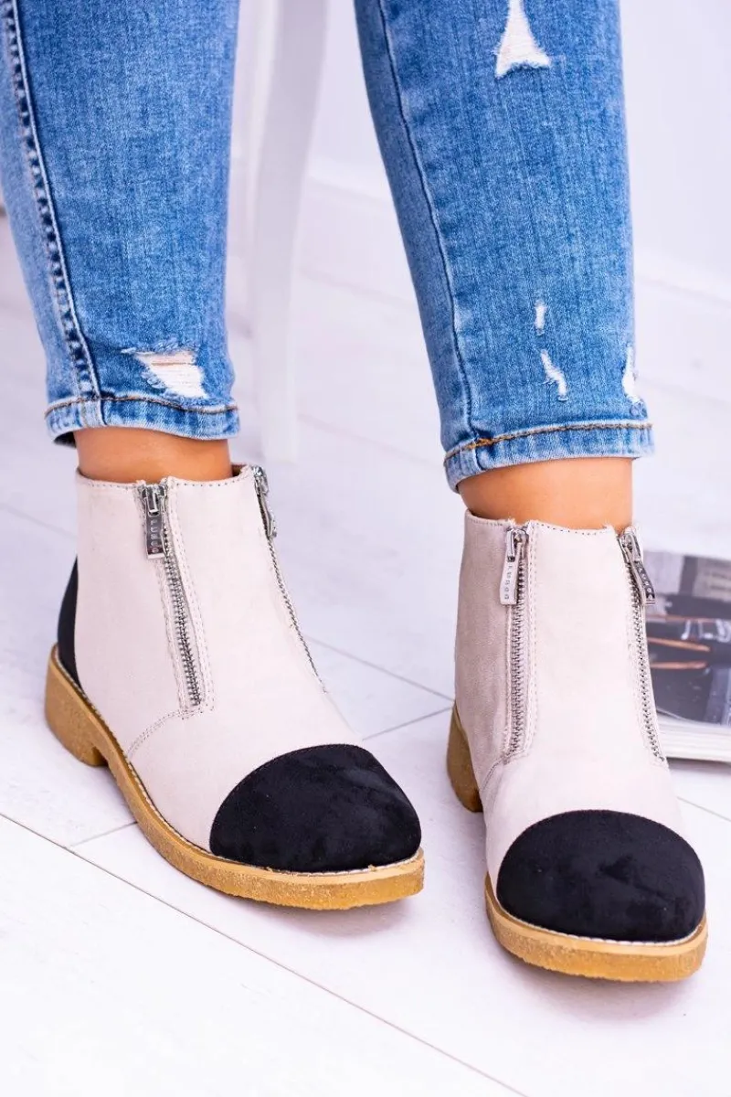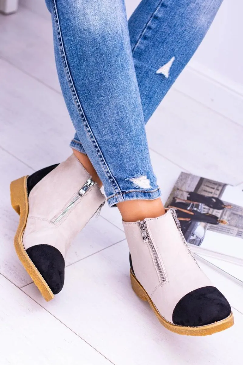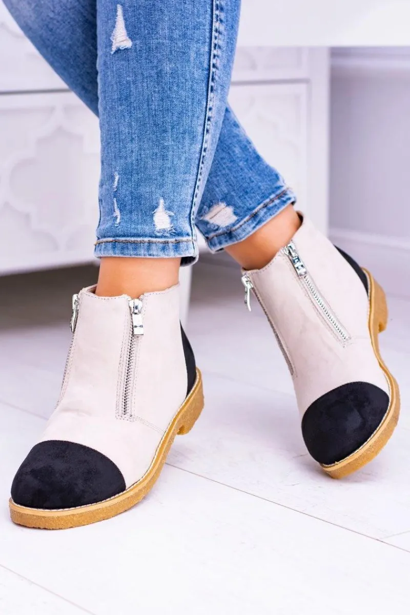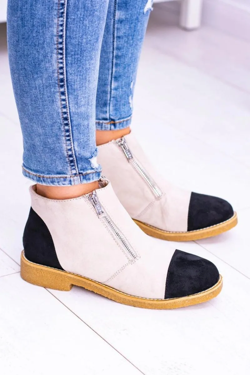 Hot Lu Boo Zamszowe Beżowe Botki Z Suwakami Inez Damskie Brązowe I Beżowe Botki|Botki Płaskie