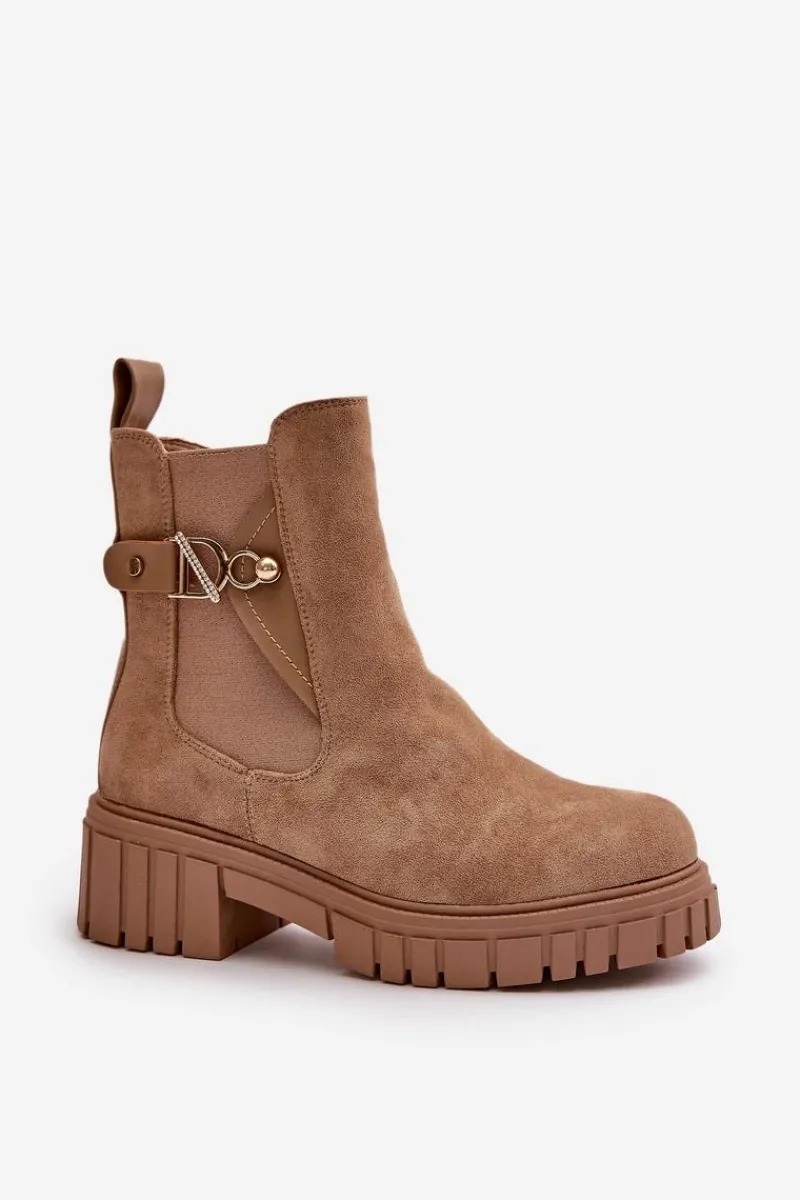 Botki damskie wykonane z miękkiego eko zamszu. Wnętrze ocieplone kocem obuwniczym sprawia, że są one doskonałym rozwiązaniem na chłodne dni. Wyróżniającym się elementem tego modelu jest złoty detal, który dodaje im wyjątkowego uroku i elegancji. Zapinanie na zamek ułatwia zakładanie i zdejmowanie obuwia. Doskonale sprawdzą się w połączeniu z różnymi elementami garderoby, od jeansów po eleganckie sukienki, podkreślając unikalny styl każdej kobiety. Przy wyborze rozmiaru prosimy sugerować się tabelą rozmiarów.