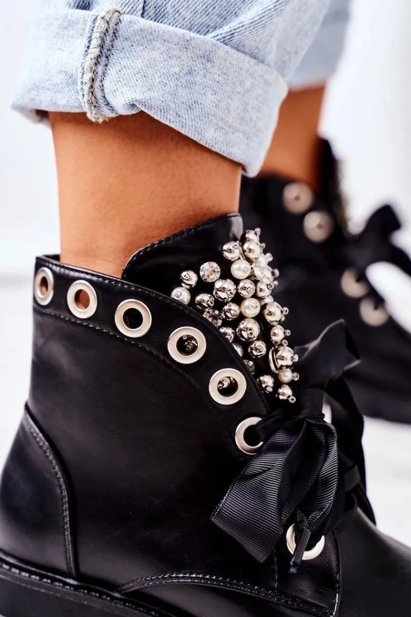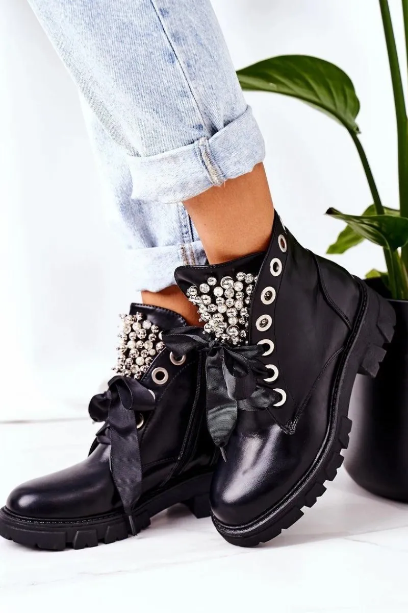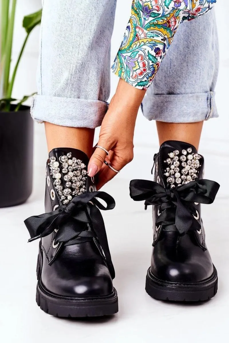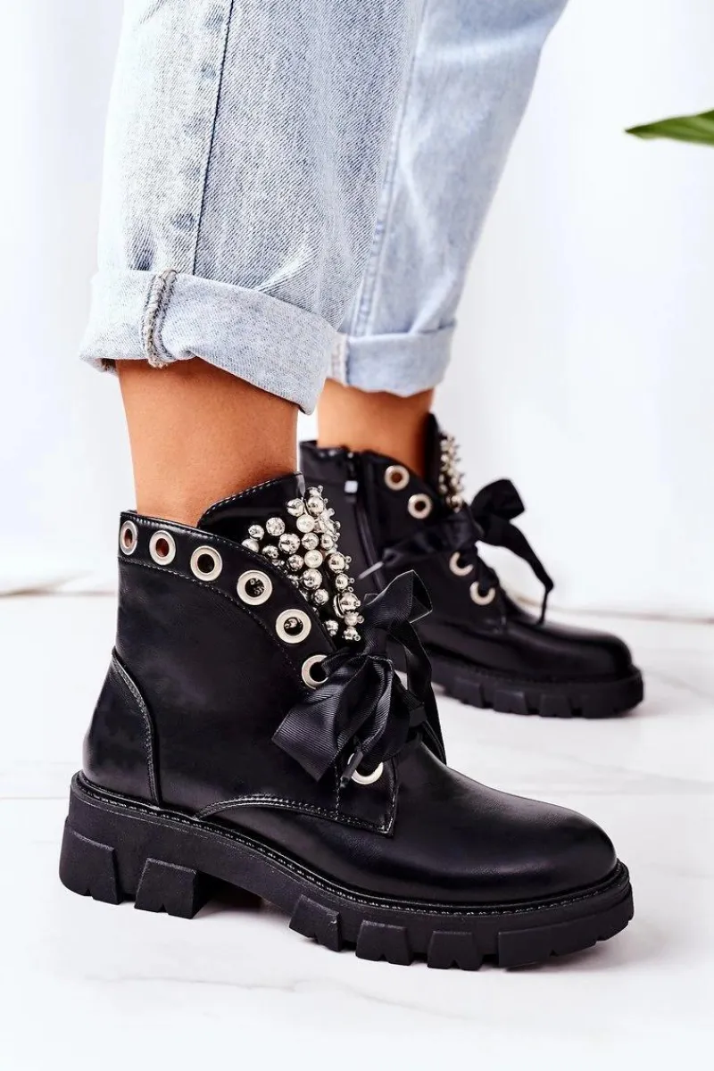 Wyjątkowe botki damskie wykonane z eko skóry. Wnętrze ocieplone jest miłym w dotyku kocem obuwniczym. Model wyróżnia się krojem cholewki oraz ozdobami. Przy wyborze rozmiaru prosimy sugerować się tabelą rozmiarów.