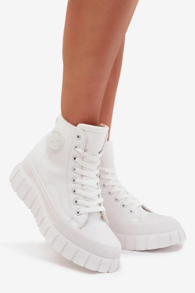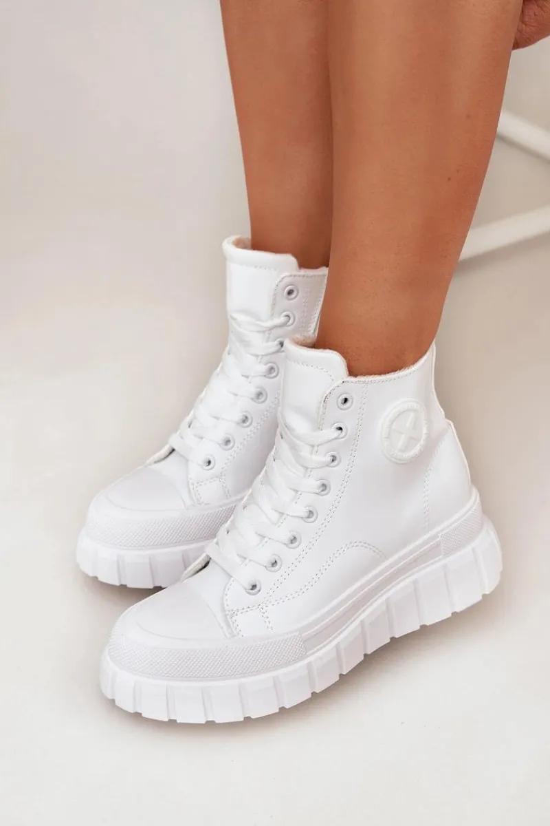 Trampki damskie wykonane ze skóry ekologicznej to połączenie stylu i komfortu. Wysoka cholewka zapinana na zamek oraz sznurowana, co zapewnia idealne dopasowanie do stopy. Buty osadzone są na platformie, co dodaje im modnego charakteru oraz zapewnia wygodę podczas chodzenia. Środek buta ocieplany jest miękkim kocem obuwniczym, co gwarantuje ciepło i komfort przez cały dzień. Zaokrąglone noski dodają trampkom lekkości i subtelności. Idealny wybór na chłodniejsze dni! Przy wyborze rozmiaru prosimy sugerować się tabelą rozmiarów.