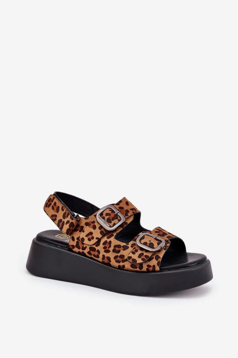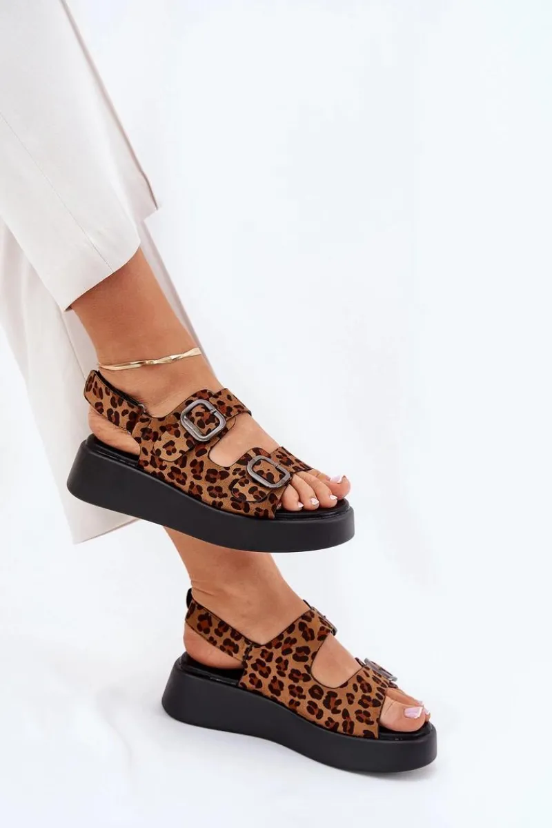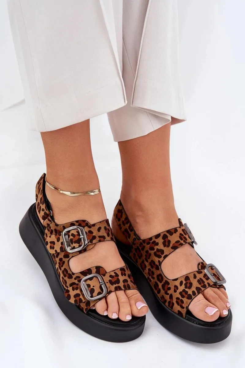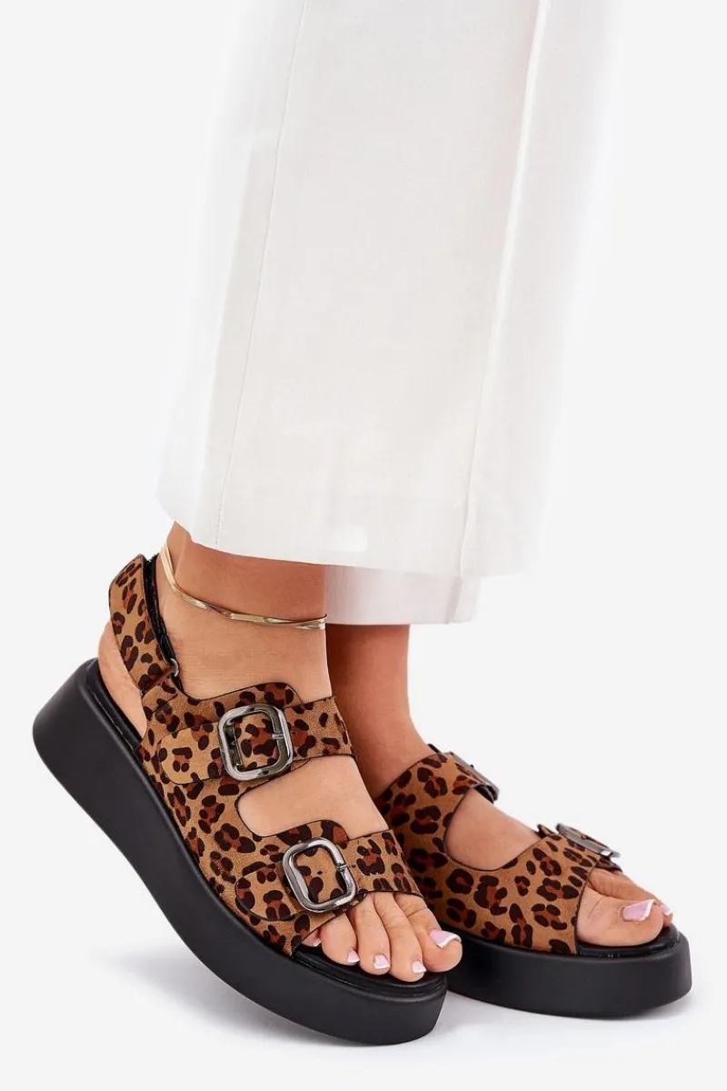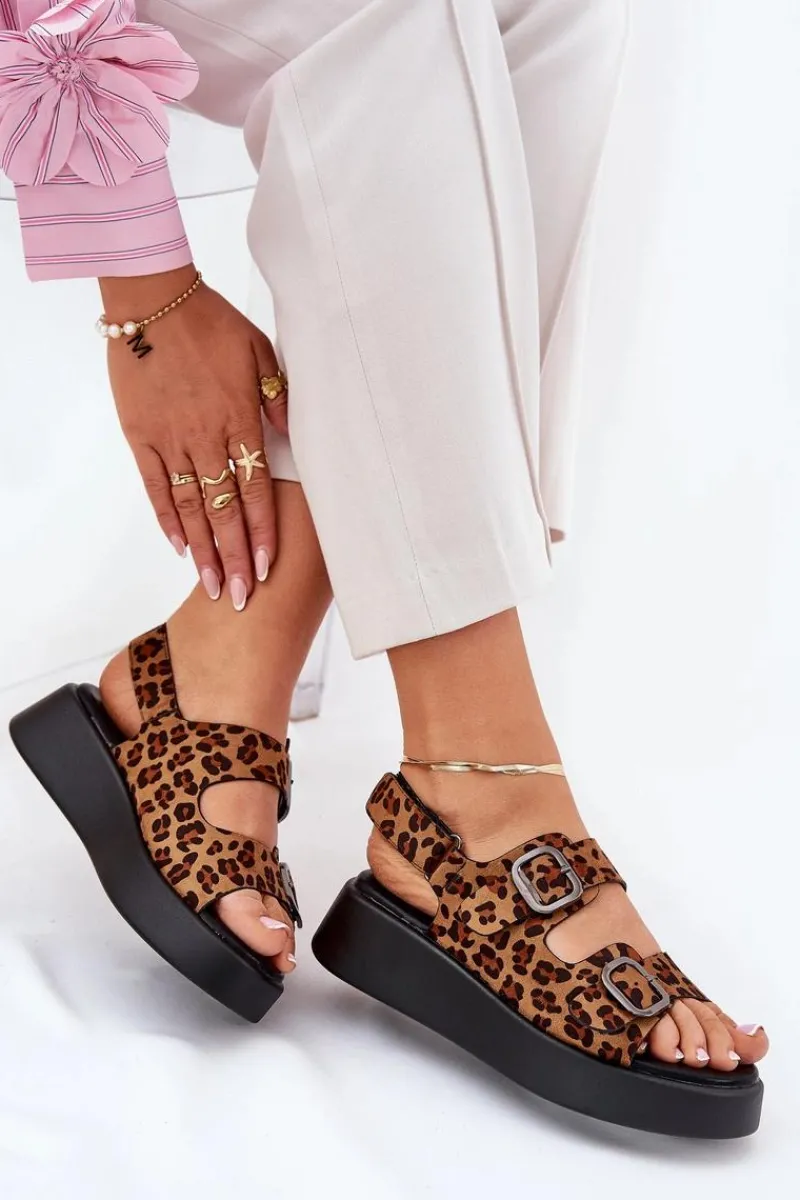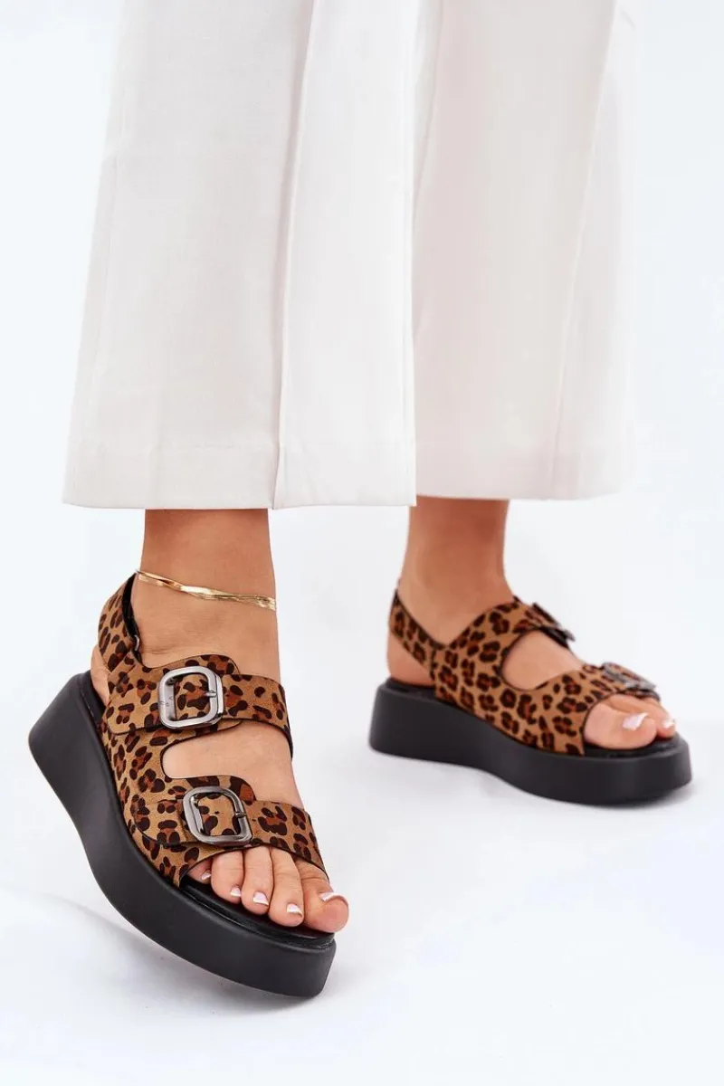 Hot Sandały Damskie Na Platformie I Koturnie Z Klamrami Panterka Brązowe Genorre Damskie Sandały Na Koturnie|Sandały Płaskie