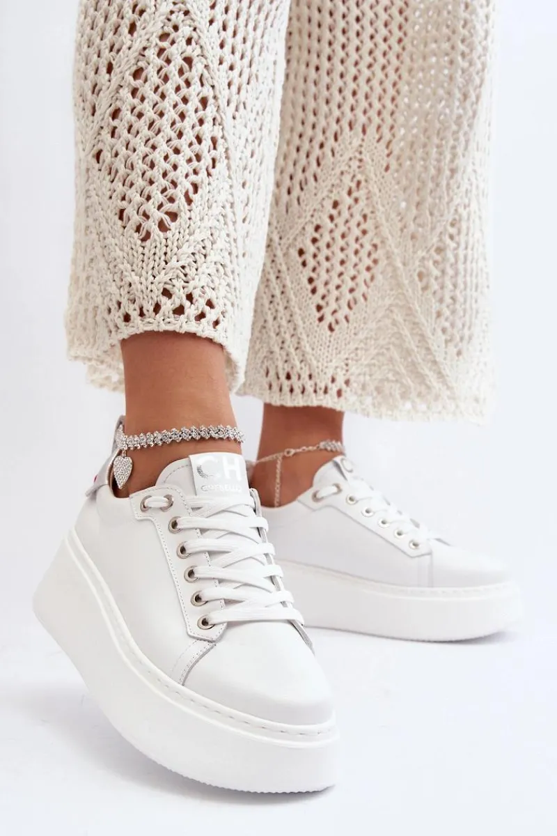 Sneakersy damskie od marki CheBello. Wykonane z wysokiej jakości naturalnej skóry. Osadzone na platformie. Noski zaokrąglone. Model ten dodatkowo posiada bransoletę z cyrkoniami oraz sercem. Fason ten dopasujesz do niemalże każdej stylizacji! Przy wyborze rozmiaru prosimy sugerować się tabelą rozmiarów.