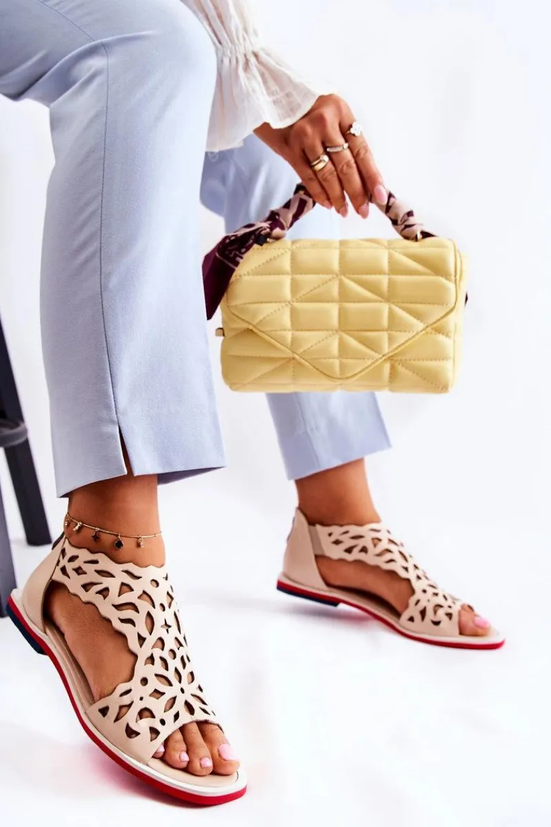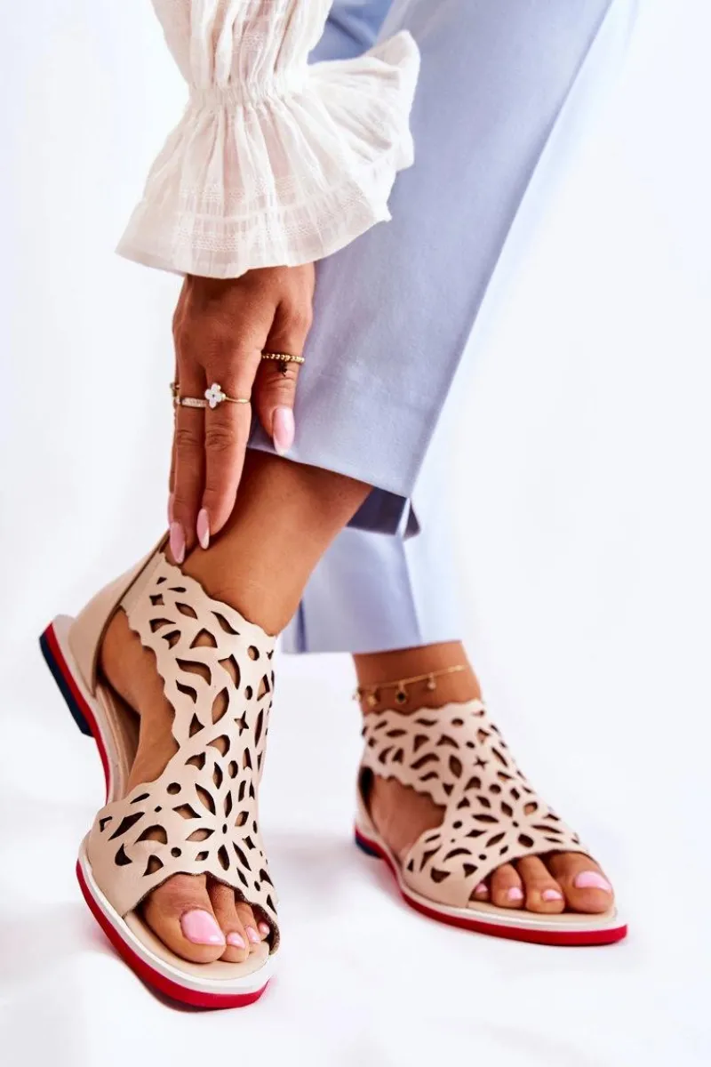 Damskie sandały zostały wykonane z naturalnej skóry w ażurowy wzór. Z boku cholewki posiadają gumkę. Zapiętek usztywniany z suwakiem. Buty są osadzone na płaskim obcasie. Sandały posiadają odkryty nosek. Miękka wkładka została także wykonana z naturalnej skóry. Lekki i przewiewny fason świetnie sprawdzi się w upalne dni. Koniecznie powinnaś je mieć! Przy wyborze rozmiaru prosimy sugerować się tabelą rozmiarów.
