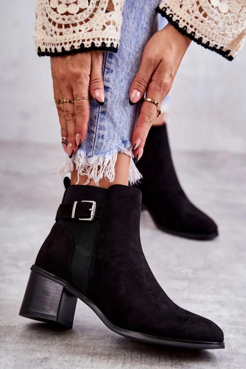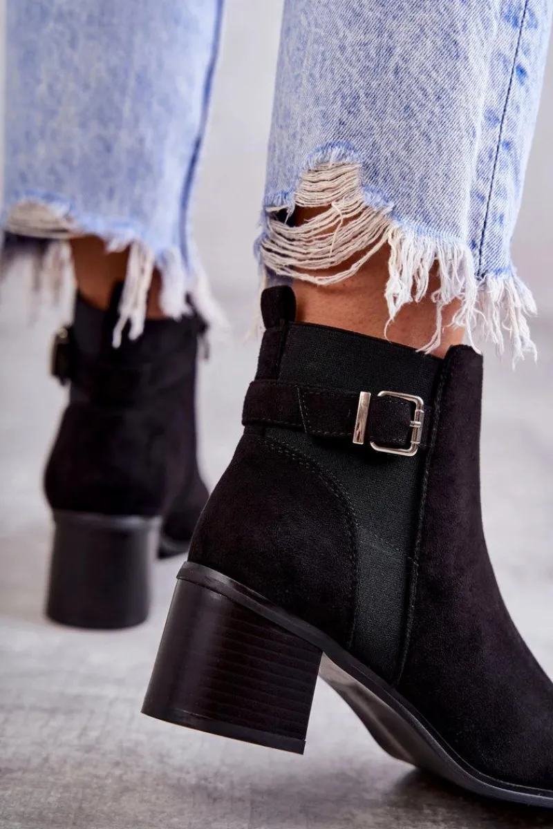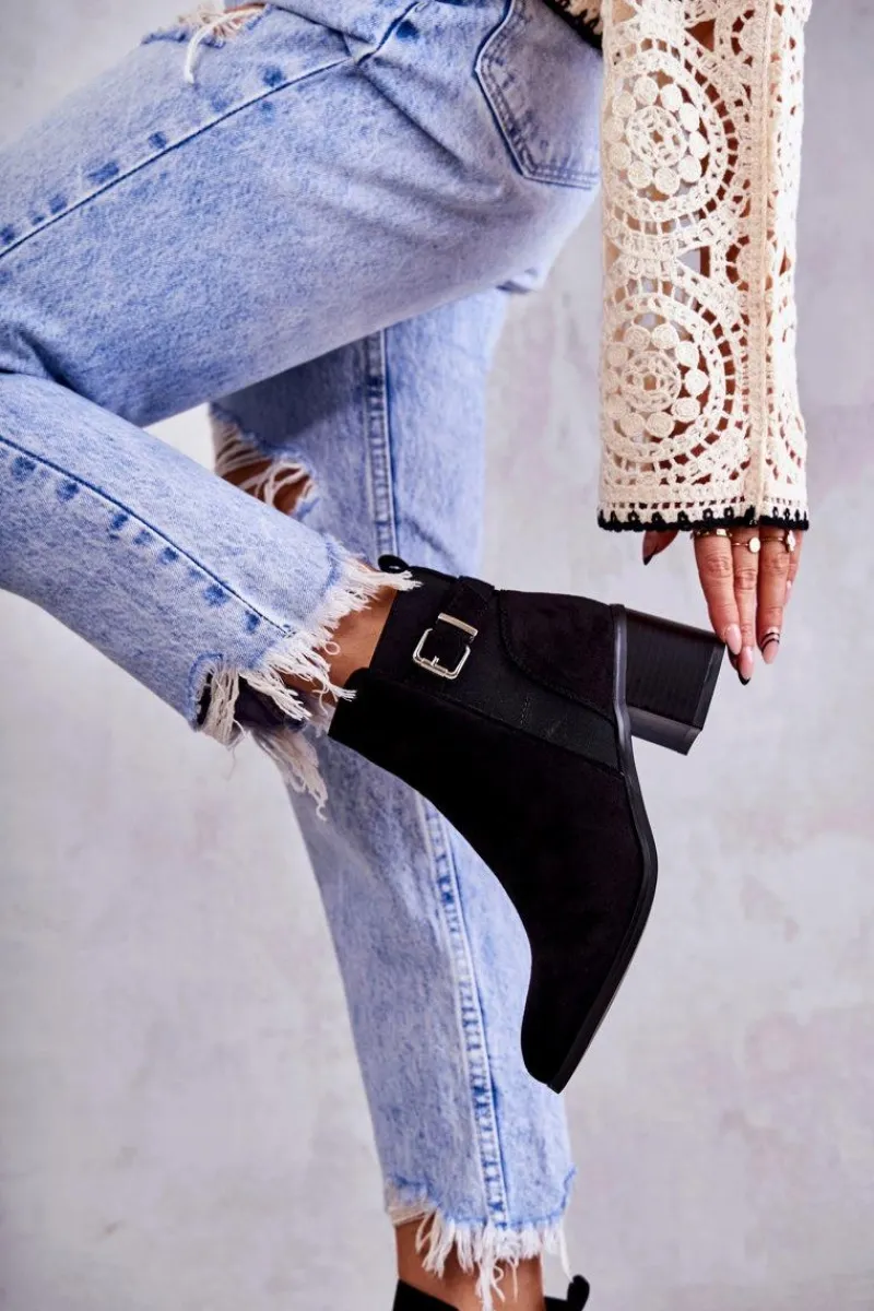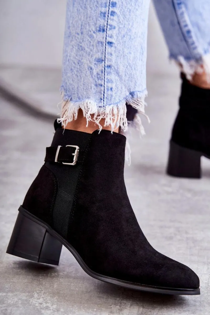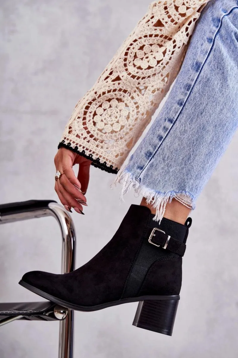 Botki wykonane z eko zamszu. Wnętrze zostało ocieplone miłym w dotyku kocem obuwniczym. Z boku cholewki znajduje się także pasek zapinany na sprzączkę. Obcas w postaci masywnego słupka. Modny fason sprawia, że możesz założyć je do wielu stylizacji. Nosek zaokrąglony. Buty posiadają także usztywniany zapiętek. W tych botkach jesienne dni nie będą już takie straszne! Przy wyborze rozmiaru prosimy sugerować się tabelą rozmiarów.