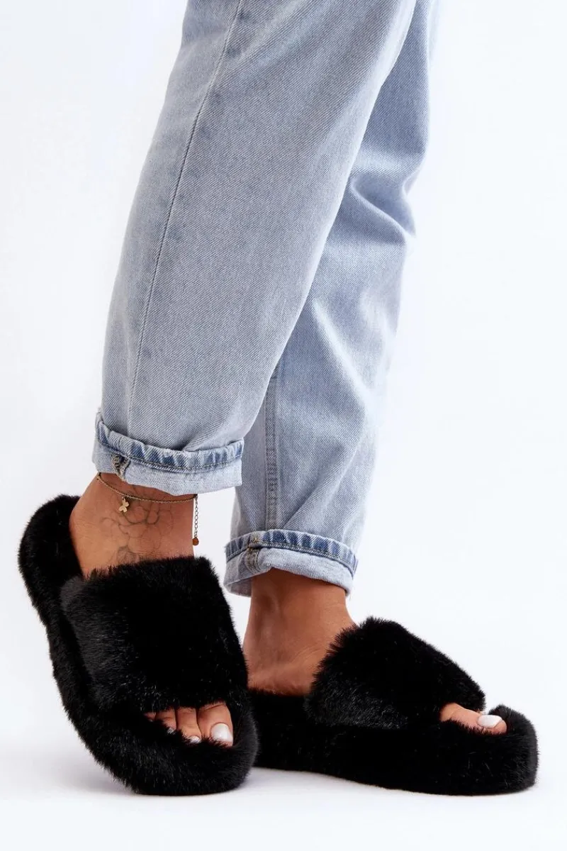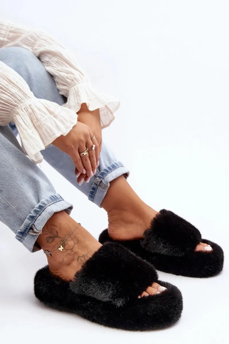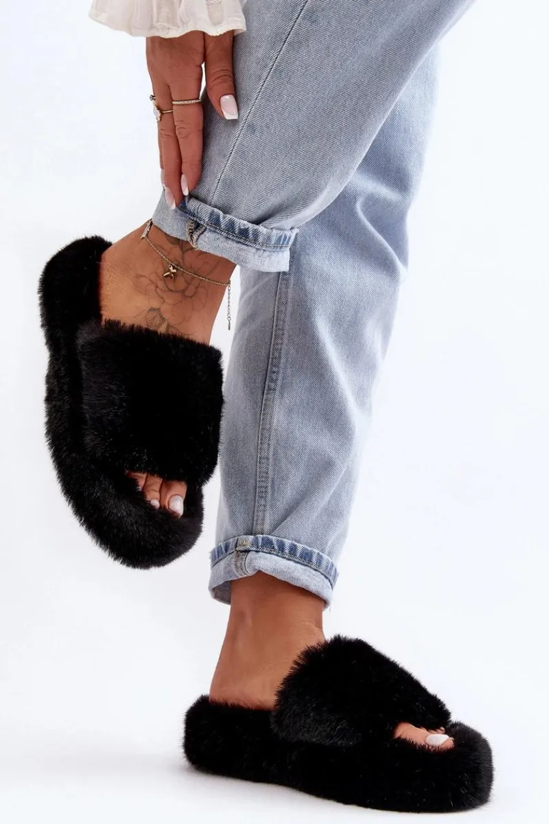 Kapcie damskie zostały wykonane z ekologicznego futerka. Model wsuwany z odkrytym noskiem i szerokim paskiem. Podeszwa wykonana z gumowego tworzywa ochroni przed zimnym podłożem. Przy wyborze rozmiaru prosimy kierować tabelą rozmiarów.