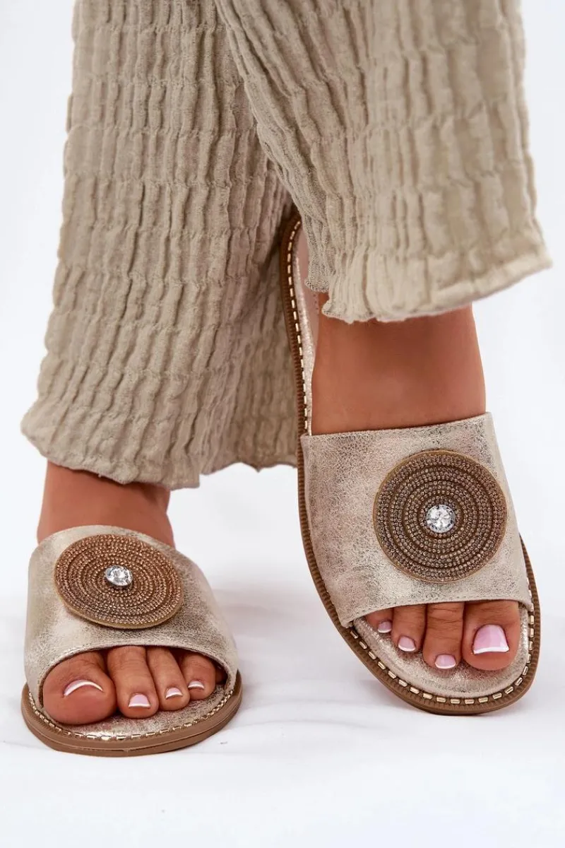 Eleganckie klapki damskie wykonane z wysokiej jakości eko skóry. Osadzone na płaskim obcasie, zapewniają stabilność i wygodę przez cały dzień. Skórzana wkładka gwarantuje komfort i odpowiednią wentylację, dbając o wygodę stóp nawet w ciepłe dni. Z przodu znajduje się ozdoba, która dodaje wyjątkowego uroku i elegancji, czyniąc je doskonałym wyborem do letnich stylizacji. Te klapki to świetna opcja zarówno do casualowych, jak i bardziej eleganckich zestawów. Przy wyborze rozmiaru prosimy sugerować się tabelą rozmiarów.