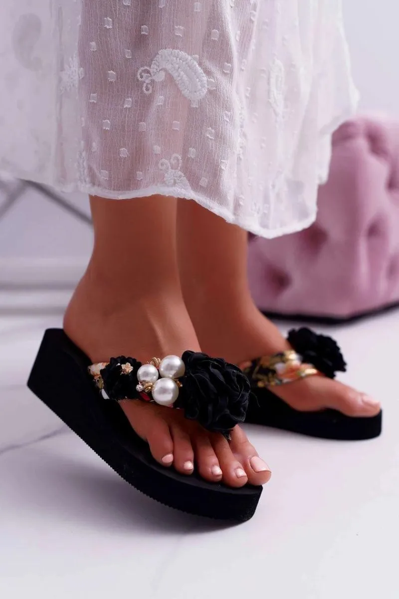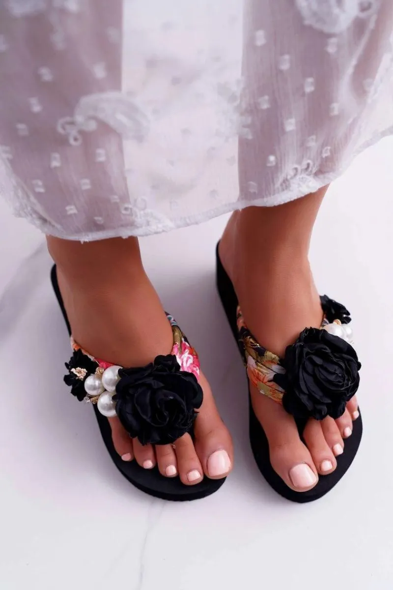 Klapki Na Koturnie|Klapki Na Obcasie>Boto Damskie Klapki Z Kwiatem Japonki Na Koturnie Czarne Sharme