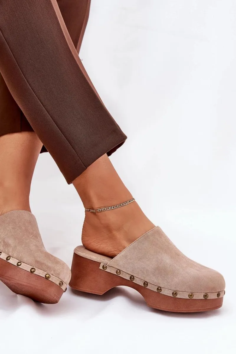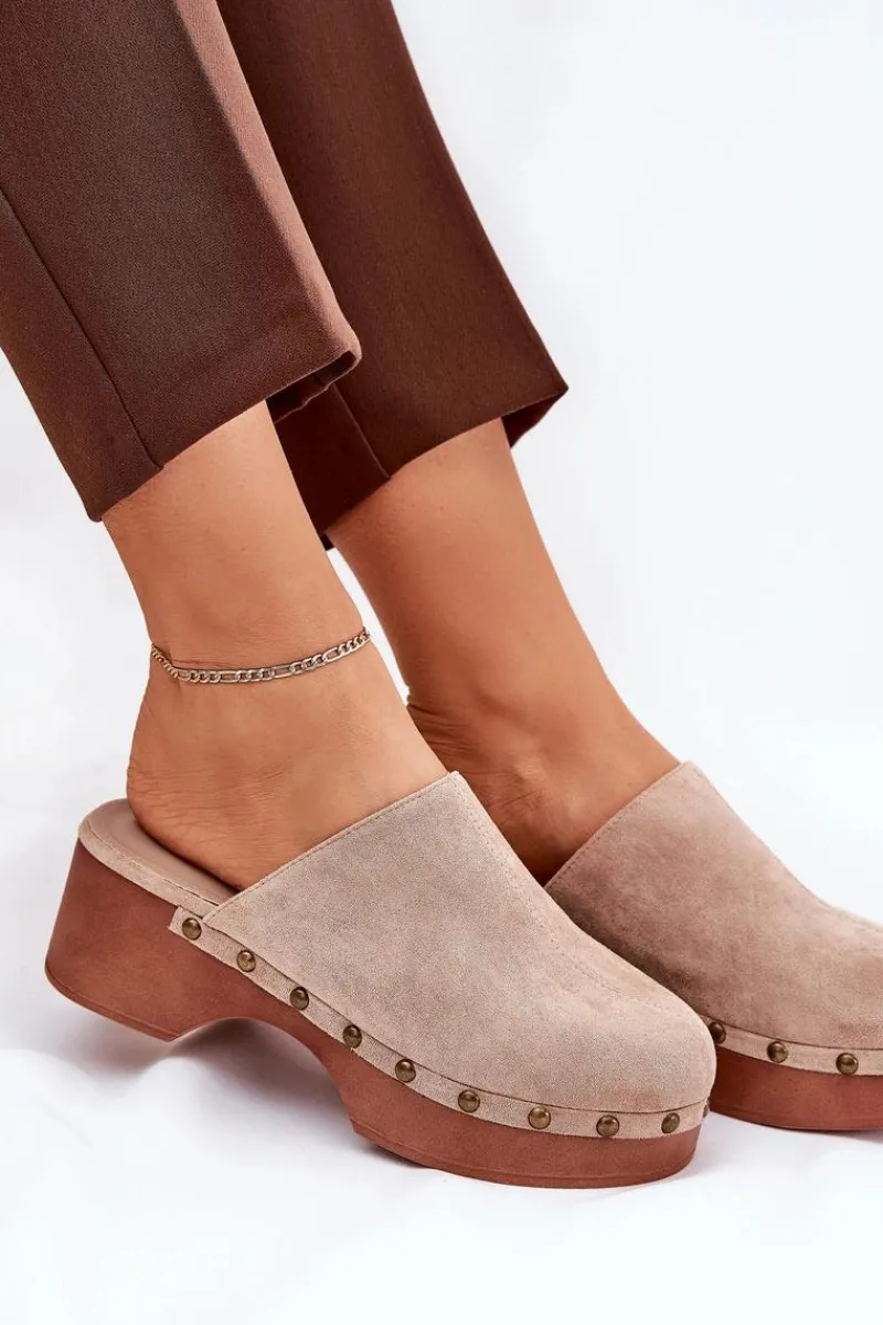 Lekkie klapki chodaki damskie wykonane z eko zamszu. Osadzone na platformie i koturnie. Ozdobione ćwiekami, które nadają im modnego i niepowtarzalnego charakteru. Wewnątrz znajduje się miękka eko skórzana wkładka, która gwarantuje komfort przez cały dzień. Klapki posiadają zakryte, zaokrąglone noski. Idealne na co dzień, doskonale komponują się z letnimi sukienkami, spódnicami i spodniami. Przy wyborze rozmiaru prosimy sugerować się tabelą rozmiarów.