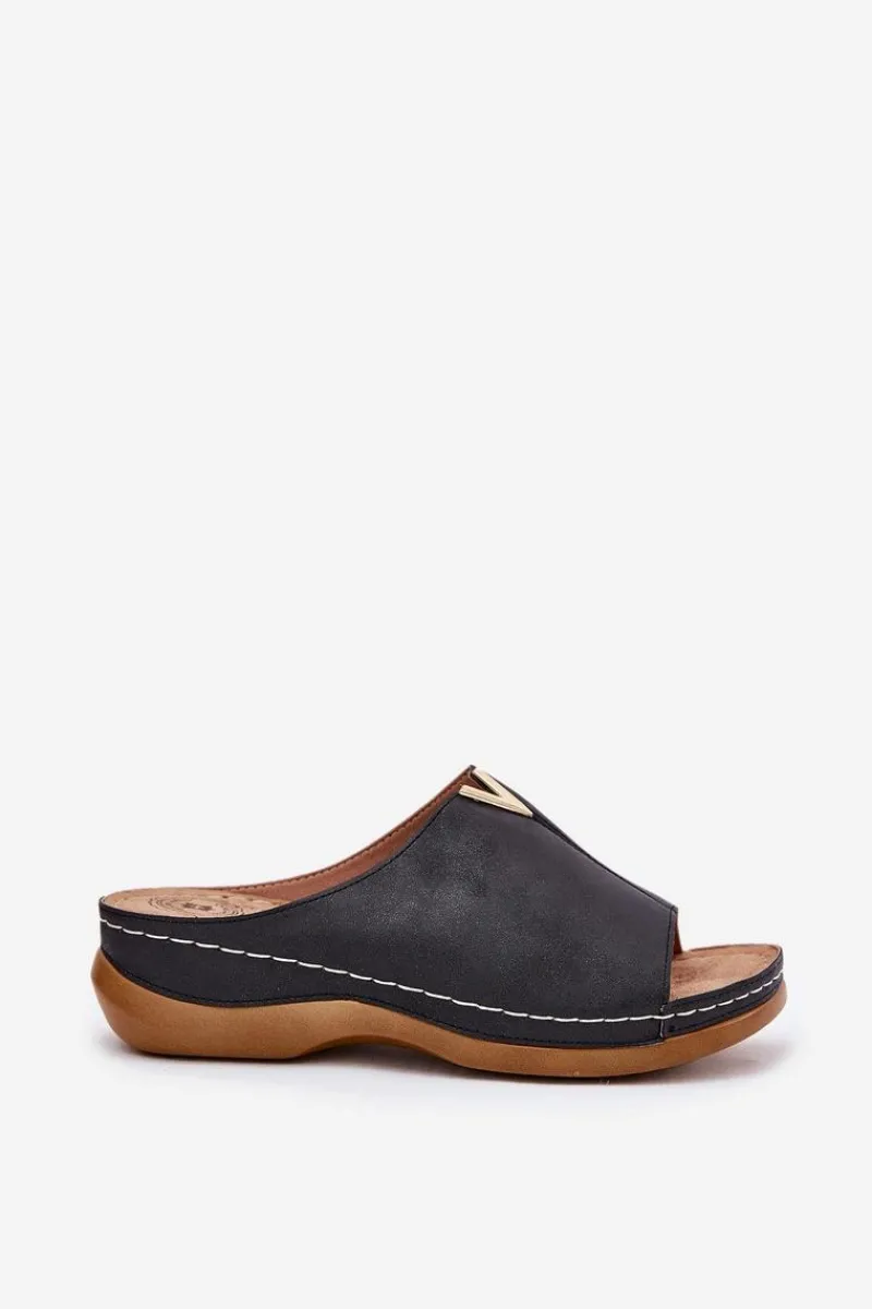Eleganckie damskie klapki wykonane z eko skóry to połączenie stylu i komfortu. Osadzone na koturnie, zapewniają lekkość oraz stabilność przez cały dzień. Model ten posiada miękką wkładkę Comfortshoe z efektem poduszki, co gwarantuje wygodę nawet przy długotrwałym noszeniu. Te klapki doskonale komponują się z codziennymi stylizacjami, łącząc elegancję z funkcjonalnością. Idealne na ciepłe dni! Przy wyborze rozmiaru prosimy sugerować się tabelą rozmiarów.