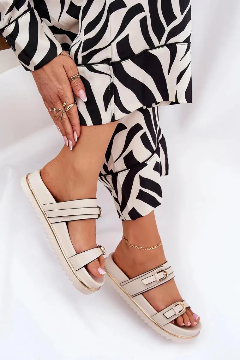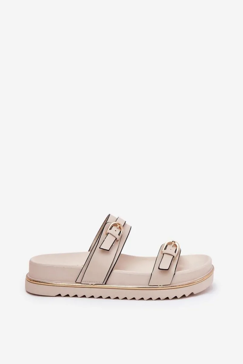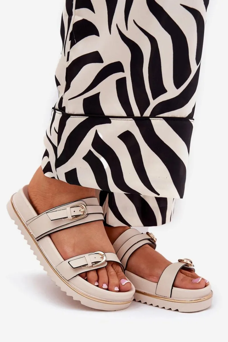 Modne klapki damskie na platformie, które łączą wygodę z nowoczesnym wyglądem. Z przodu znajdują się dwa paski z klamrami, które dodają charakteru i subtelnie przyciągają uwagę. Platforma zapewnia pewność kroku i stabilność przez cały dzień. Idealne na co dzień, doskonale pasują zarówno do sukienek, jak i spodni, tworząc uniwersalny element każdej letniej stylizacji. Przy wyborze rozmiaru rosimy sugerować się tabelą rozmiarów.