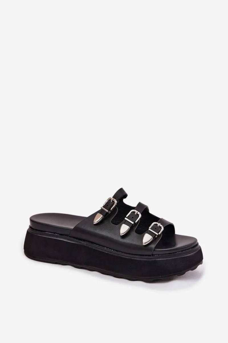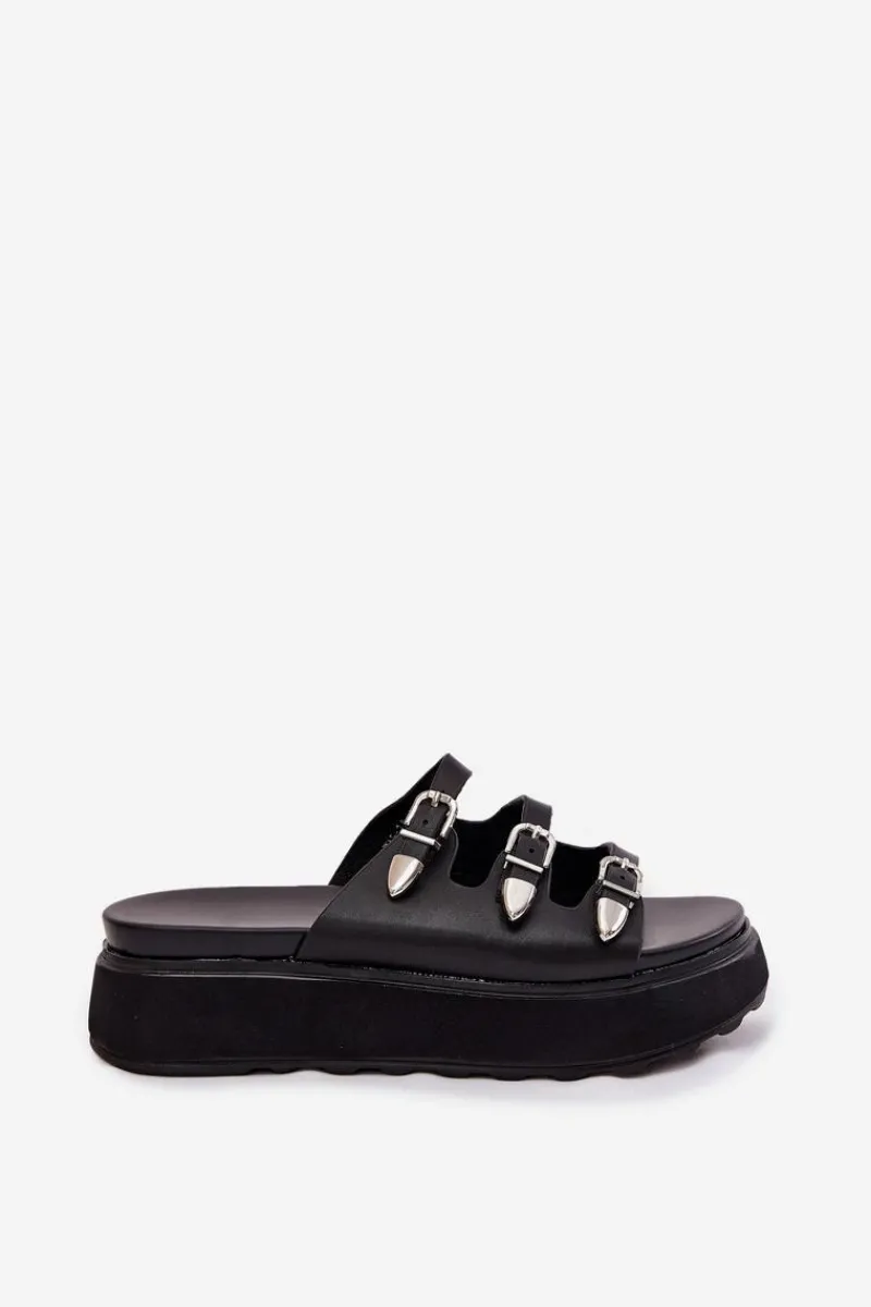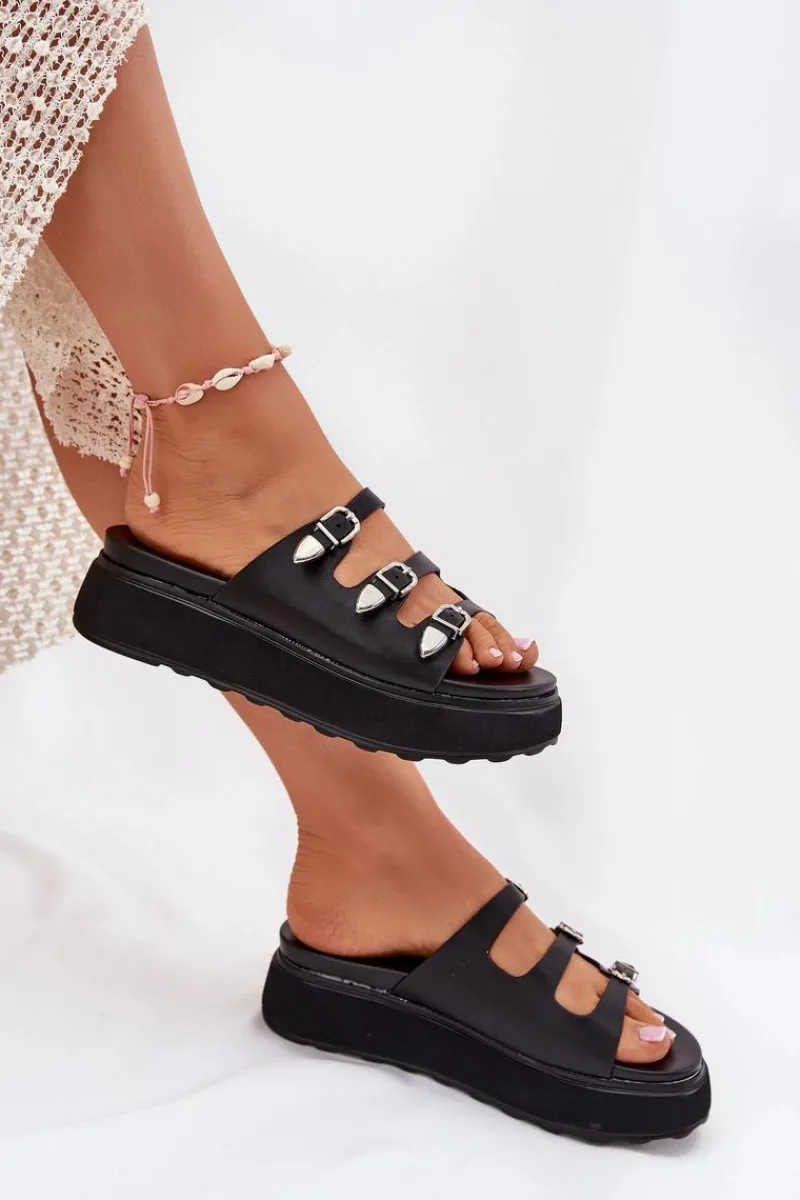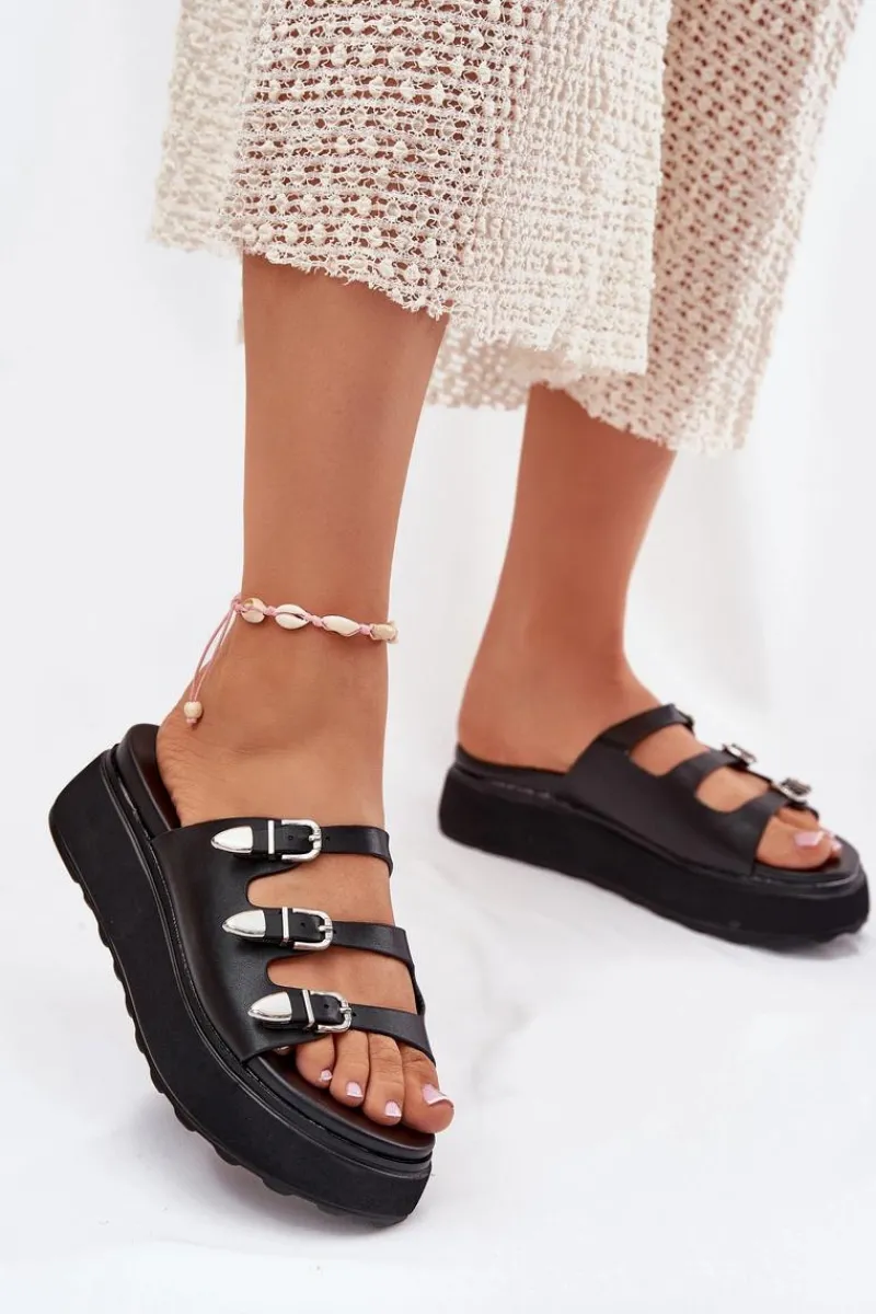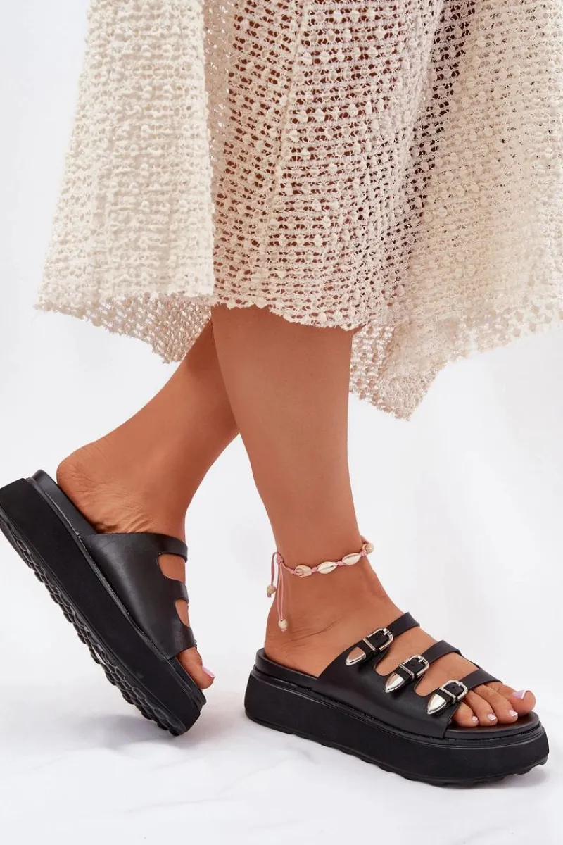 Klapki damskie z eko skóry, osadzone na platformie, to połączenie komfortu i stylu. Model wyróżnia się trzema cienkimi, regulowanymi paseczkami z klamrami, które pozwalają na idealne dopasowanie do stopy. Miękka wkładka zapewnia wygodę przez cały dzień, a nowoczesny design sprawia, że klapki doskonale komponują się z letnimi stylizacjami. Idealne na co dzień, łączą funkcjonalność z modnym wyglądem. Przy wyborze rozmiaru prosimy sugerować się tabelą rozmiarów.
