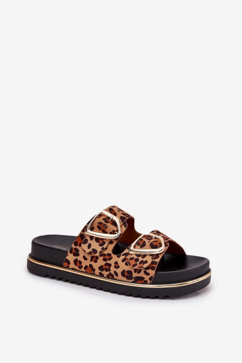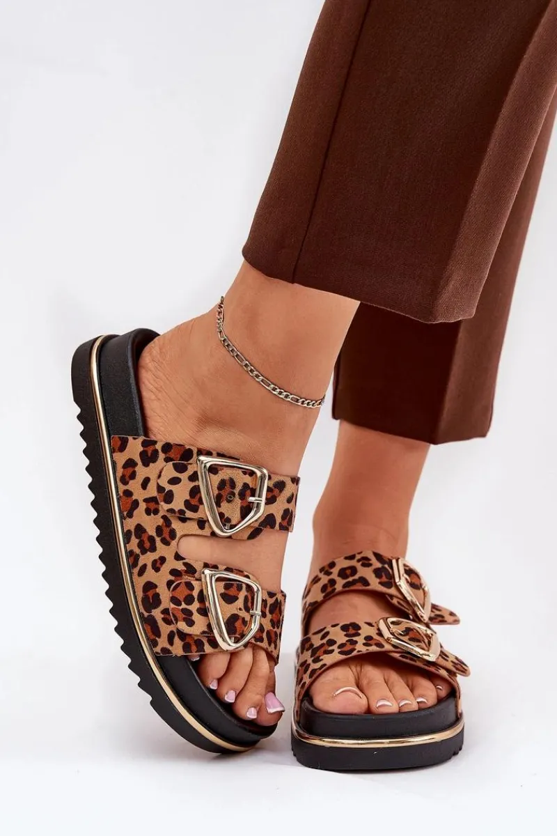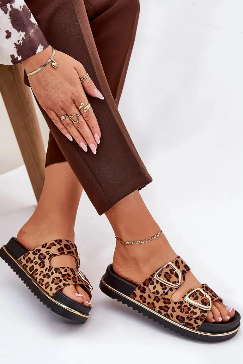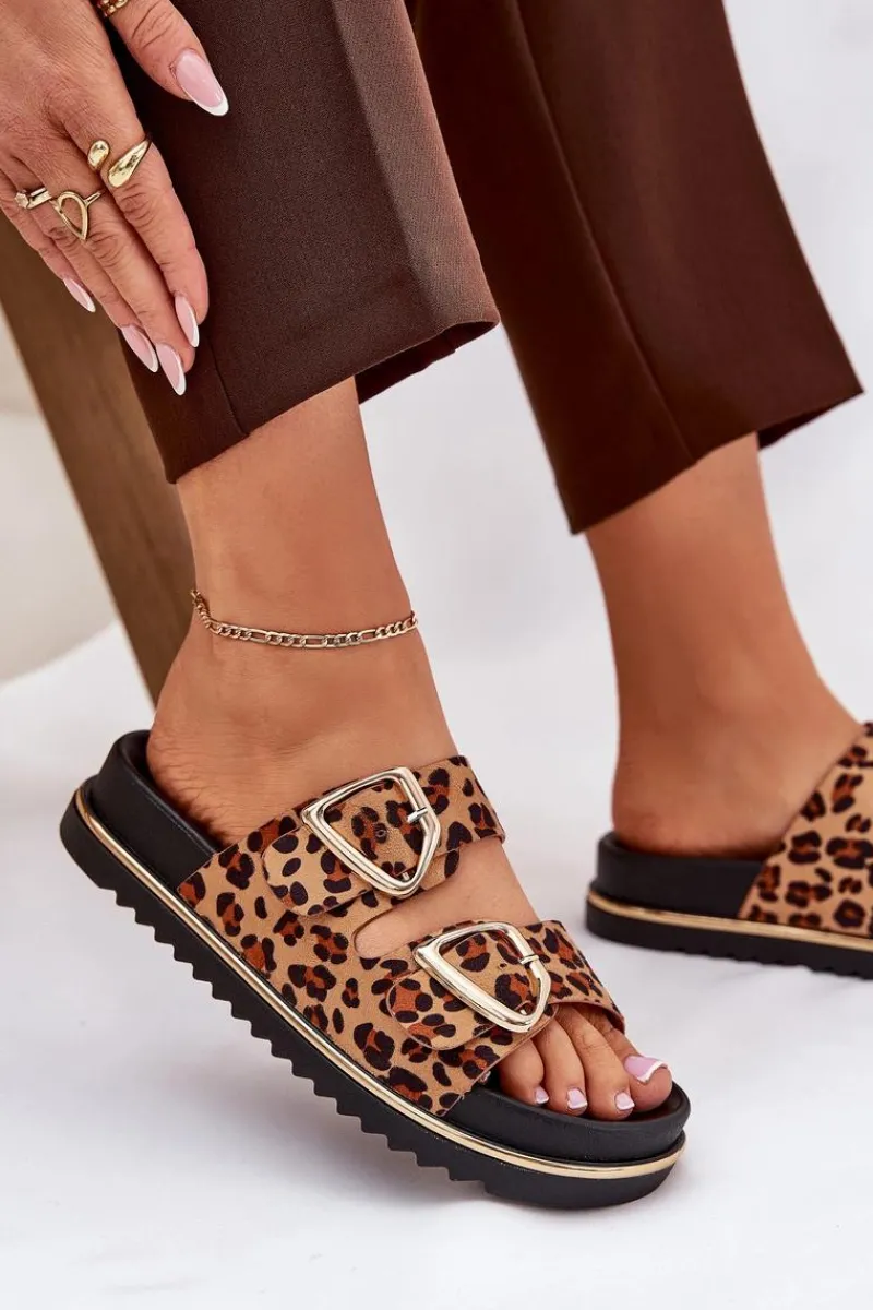 Klapki Na Platformie|Klapki Damskie Klasyczne>Boto Klapki Damskie w Panterkę Na Platformie Ze Złotymi Klamrami Brązowe Tersele