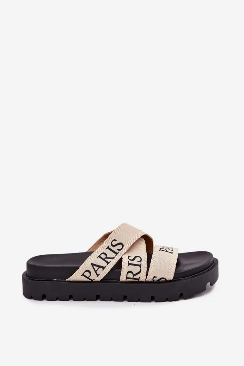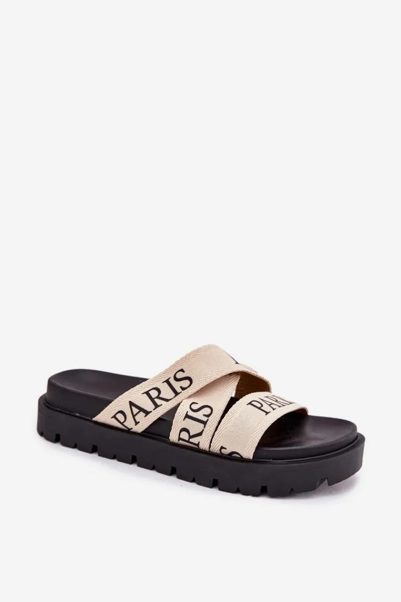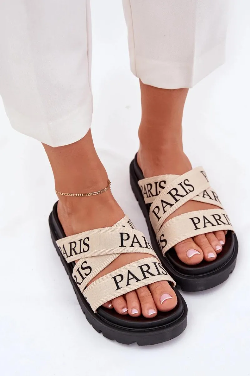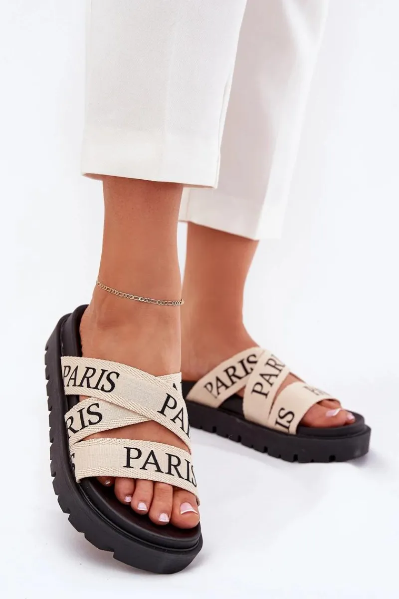 Klapki damskie na platformie z materiałowymi paskami z napisem „PARIS” to stylowy wybór na cieplejsze dni. Ich unikalny wygląd łączy wygodę z modnym akcentem, nadając każdej stylizacji charakteru. Doskonałe do casualowych i wakacyjnych outfitów, zapewniają komfort i nowoczesny wygląd. Przy wyborze rozmiaru rosimy sugerować się tabelą rozmiarów.