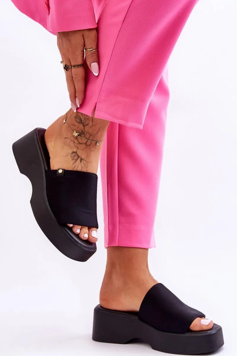 Klasyczne klapki osadzone na masywnej platformie i płaskim obcasie. Wykonane z wierzchu z materiału tekstylnego. Posiadają delikatne zdobienie. Miękka wkładka zapewni wygodne użytkowanie obuwia nawet przez cały dzień. Klasyczny fason z odkrytym, kwadratowym noskiem. Świetnie sprawdzą się do wielu stylizacji! Przy wyborze rozmiaru prosimy kierować się tabelą rozmiarów.