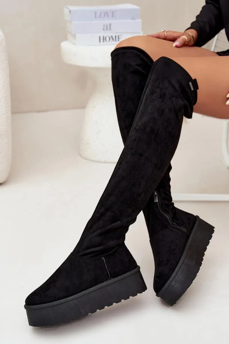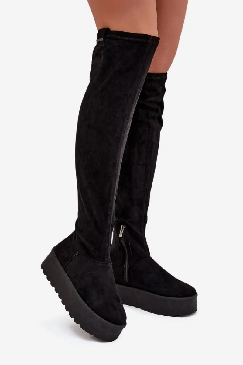 Kozaki damskie od marki Big Star to elegancka propozycja na chłodniejsze dni. Wykonane z eko zamszu, osadzone na platformie, zapewniają wygodę i stabilność, a ich cholewka sięgająca za kolano dodaje im szyku. Ściągacz na górze cholewki pozwala na lepsze dopasowanie do nogi. Ocieplenie kocem obuwniczym wyłącznie na wysokości stopy. Na dole zapięcie na zamek. Te kozaki będą idealnym wyborem do spódnic i sukienek, dodając każdej stylizacji kobiecego i modnego charakteru. Przy wyborze rozmiaru prosimy sugerować się tabelą rozmiarów.