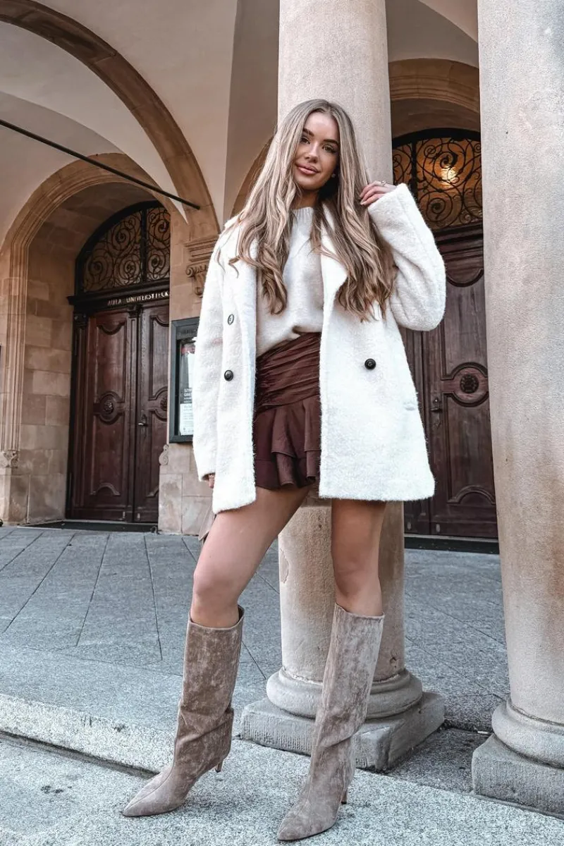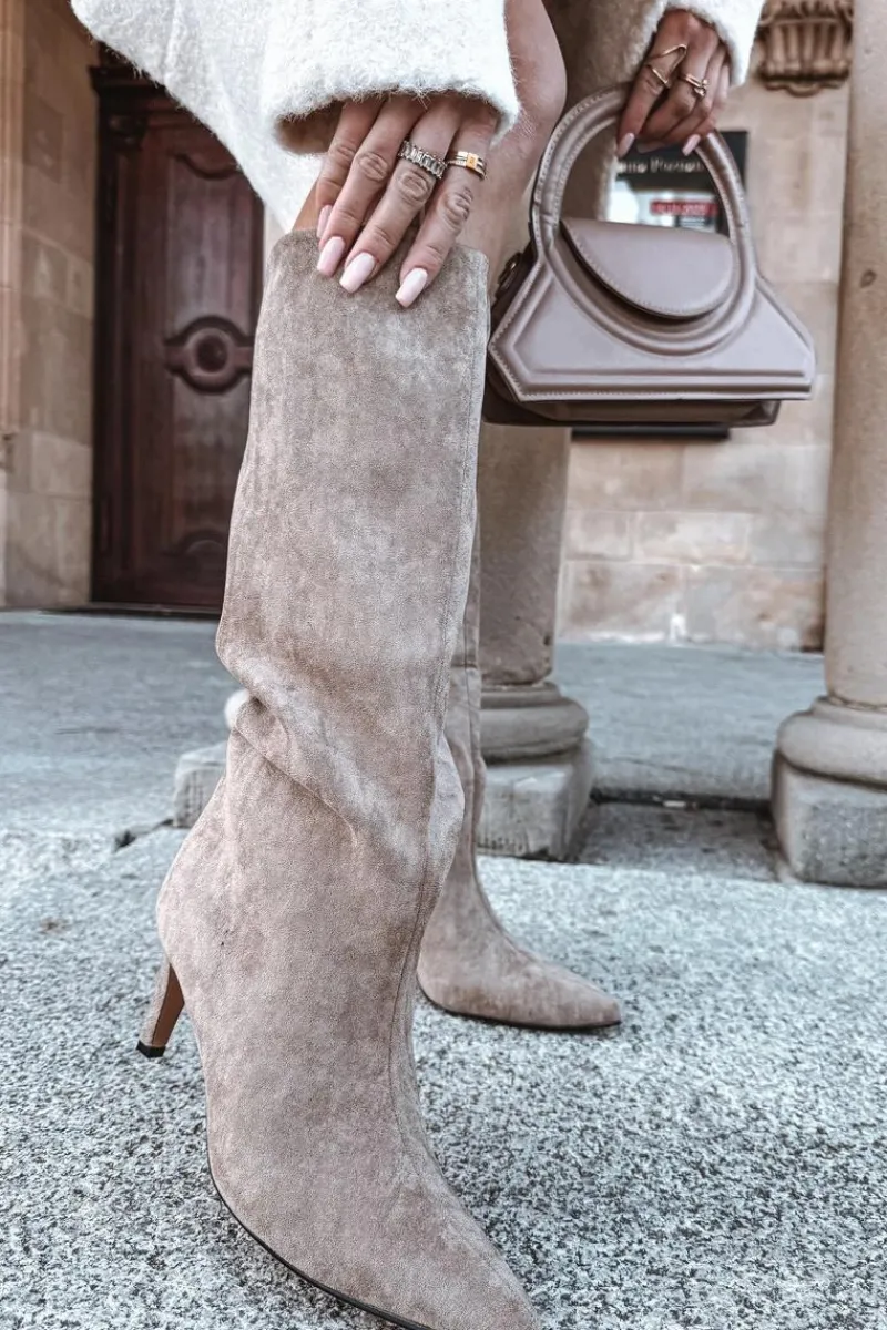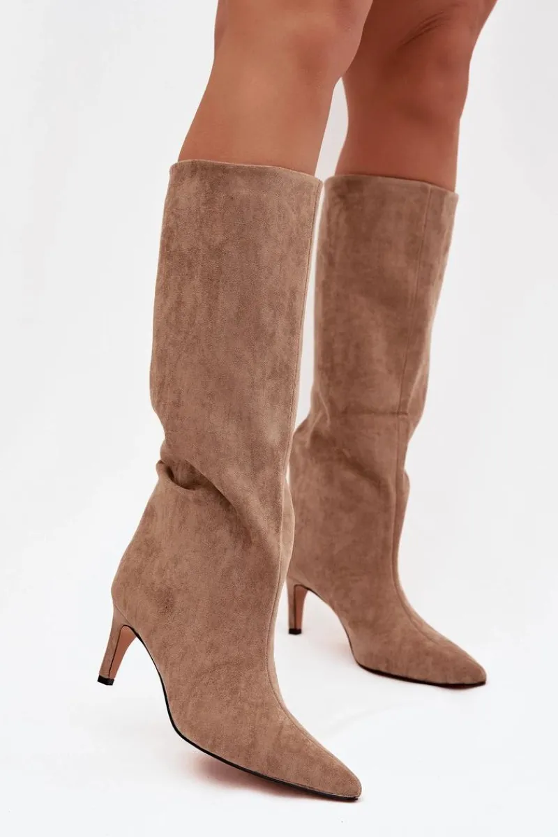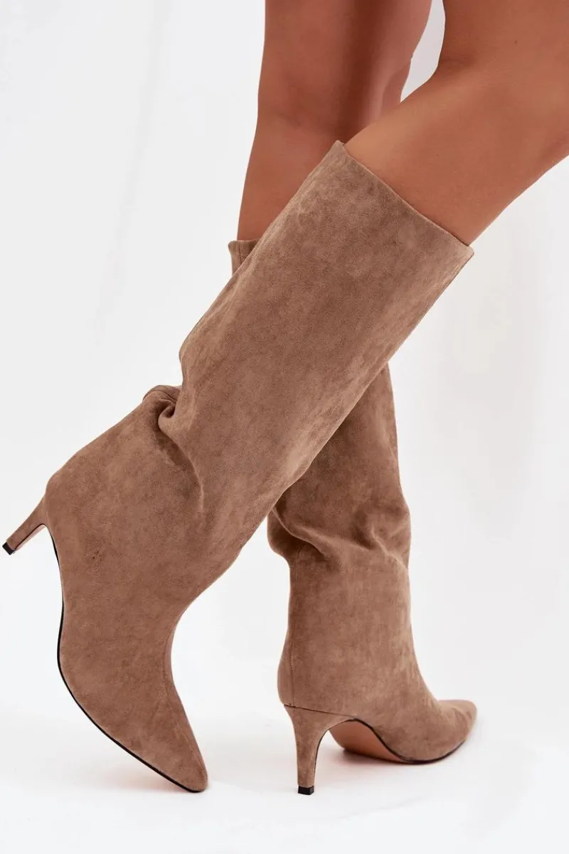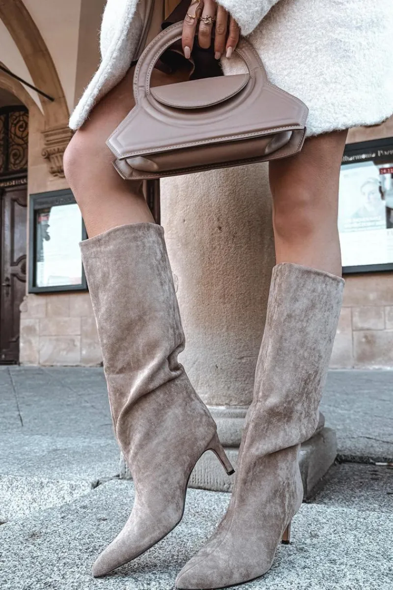Kozaki damskie z eko zamszu to elegancka propozycja na chłodniejsze dni. Wsuwane i osadzone na smukłej szpilce, dodają sylwetce lekkości i kobiecego szyku. Szpiczaste noski podkreślają wyrafinowany charakter, a ocieplenie zapewnia komfort i ciepło w jesienno-zimowe dni. Idealne do efektownych, modowych stylizacji. Przy wyborze rozmiaru prosimy kierować tabelą rozmiarów.
