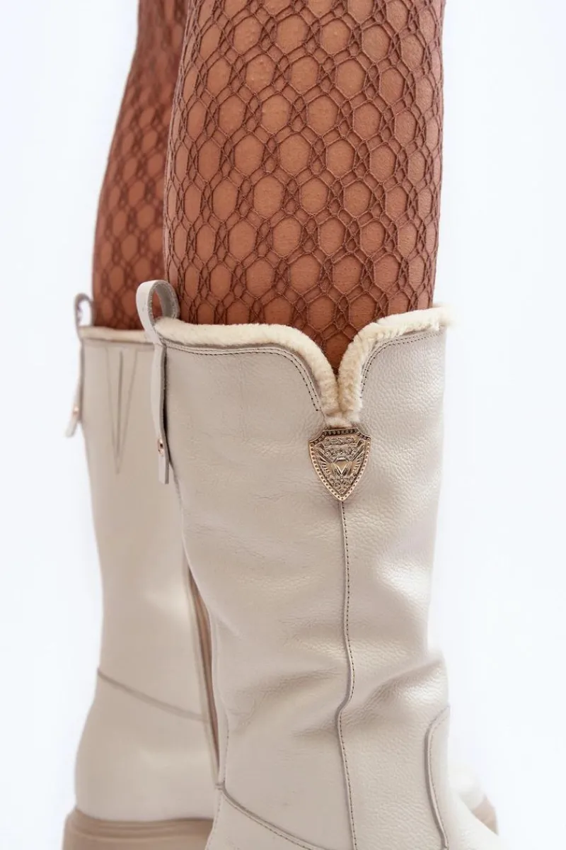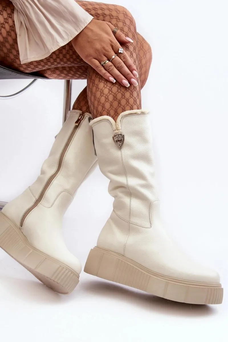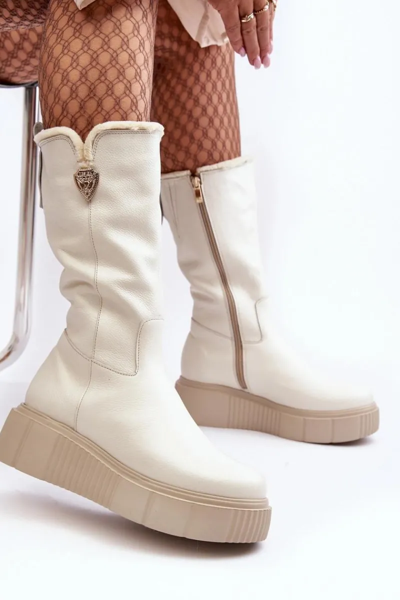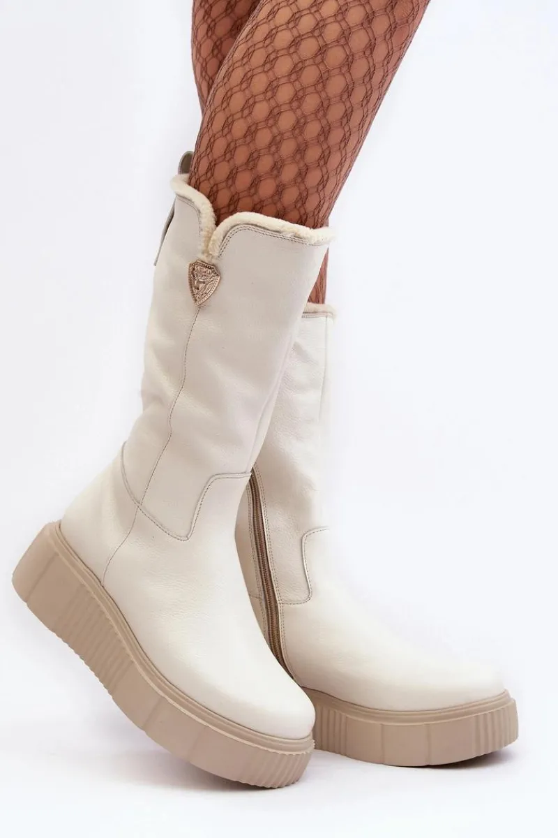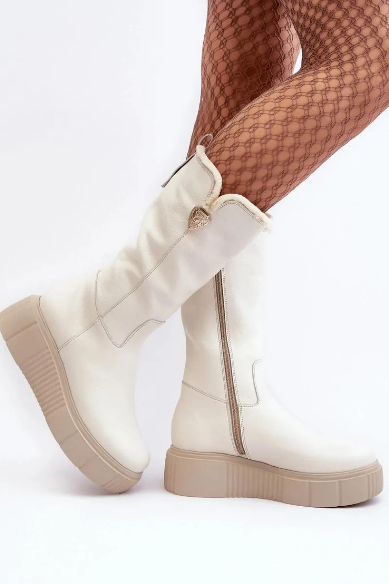 Damskie kozaki zostały wykonane z naturalnej skóry. Model ten posiada suwak z boku cholewki. Wnętrze zostało ocieplone naturalną wełną. Zapiętek jest usztywniany. Kozaki osadzono na masywnej platformie oraz koturnie. Posiadają ozdobny element z boku cholewki. Ten model świetnie sprawdzi się podczas chłodnych, zimowych dni. Przy wyborze rozmiaru prosimy sugerować się tabelą rozmiarów.