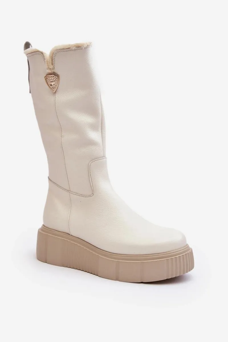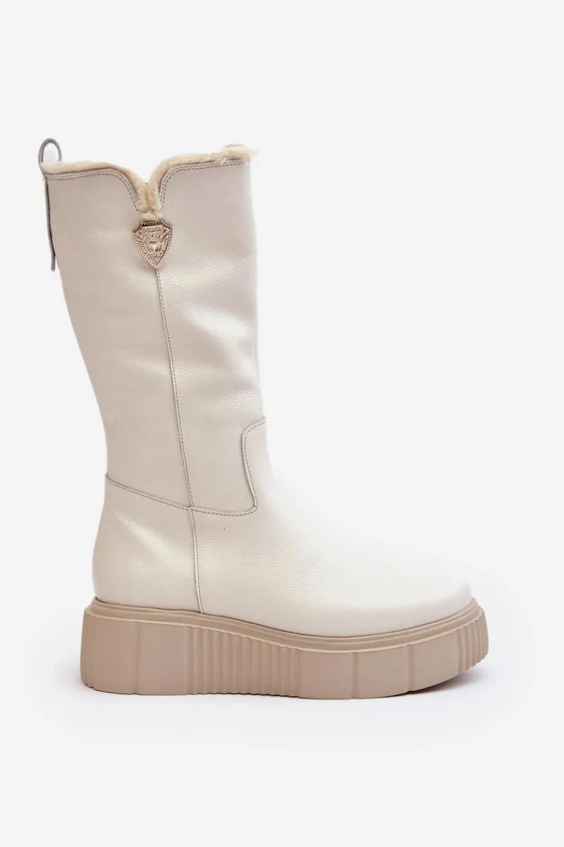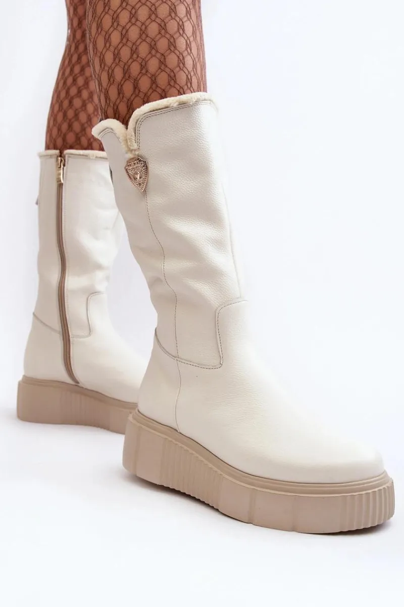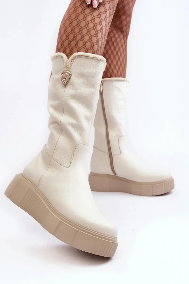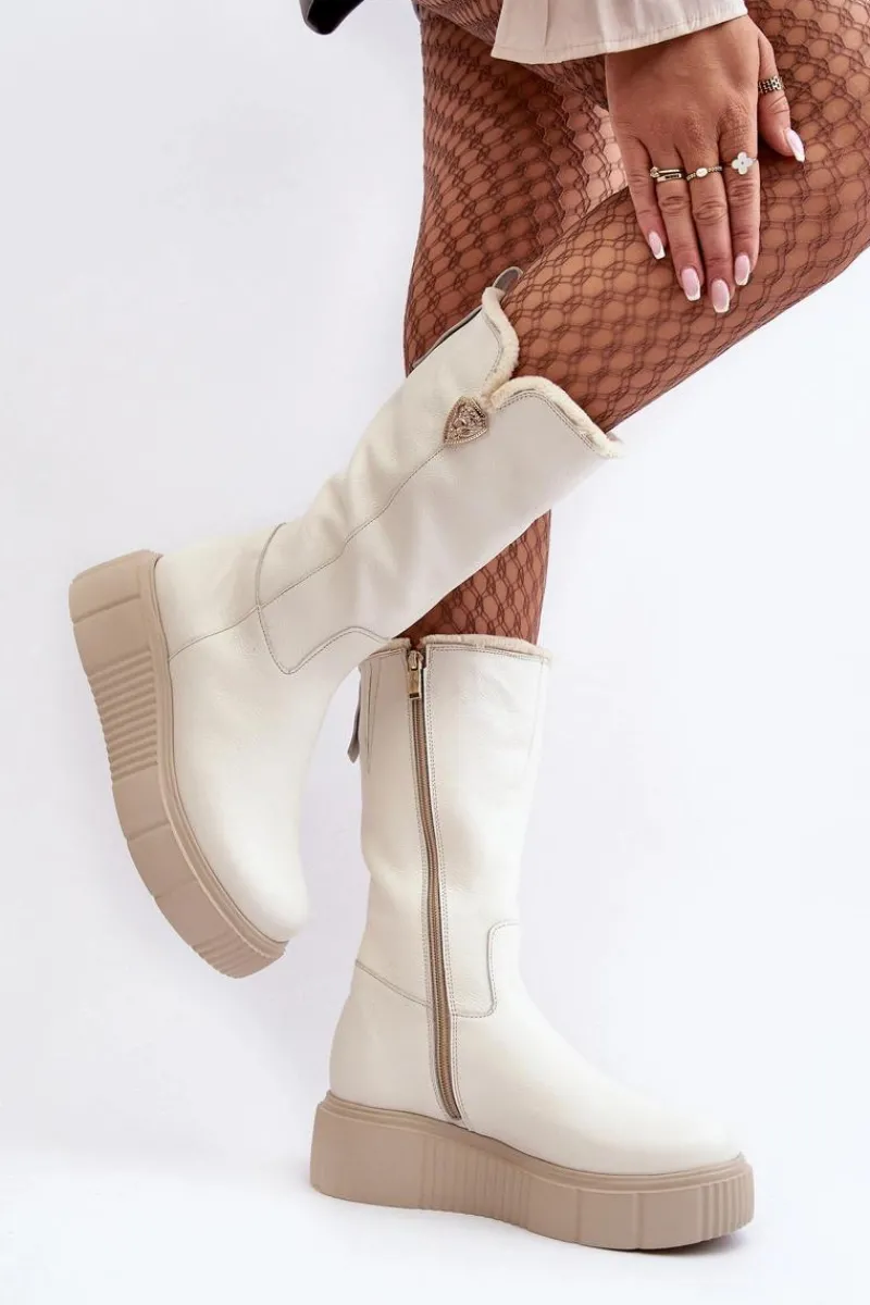 Damskie kozaki zostały wykonane z naturalnej skóry. Model ten posiada suwak z boku cholewki. Wnętrze zostało ocieplone naturalną wełną. Zapiętek jest usztywniany. Kozaki osadzono na masywnej platformie oraz koturnie. Posiadają ozdobny element z boku cholewki. Ten model świetnie sprawdzi się podczas chłodnych, zimowych dni. Przy wyborze rozmiaru prosimy sugerować się tabelą rozmiarów.
