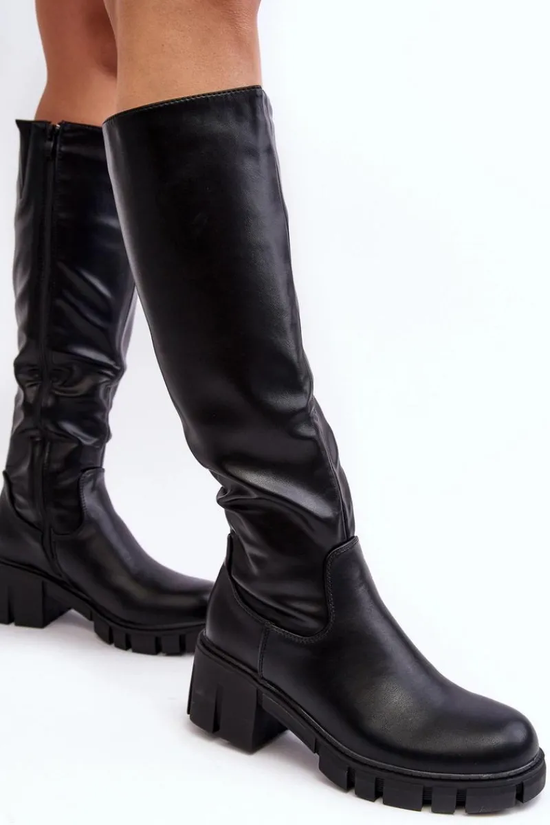 Damskie kozaki wykonane z eko skóry. Cholewka do kolana. Osadzone na niskim, masywnym obcasie. Noski zaokrąglone. Usztywniony zapiętek. Środek ocieplony miłym w dotyku kocem obuwniczym. Zapinane na suwak. Ten klasyczny model będzie idealny do niemalże każdej jesienno-zimowej stylizacji! Przy wyborze rozmiaru prosimy sugerować się tabelą rozmiarów.