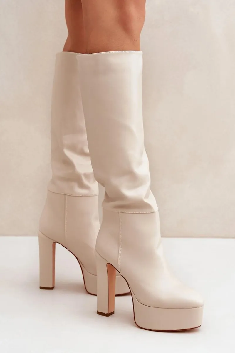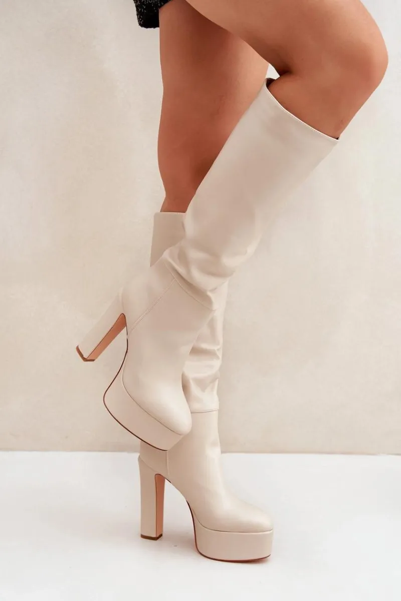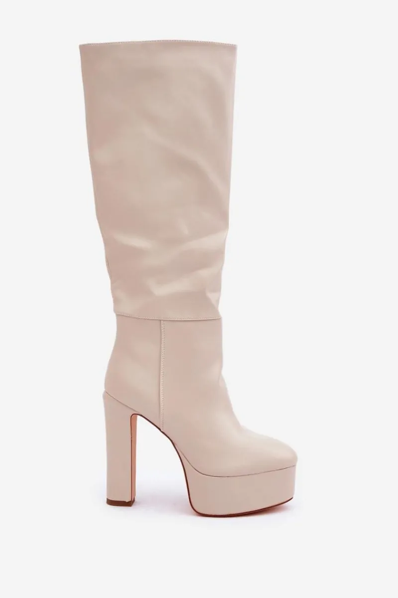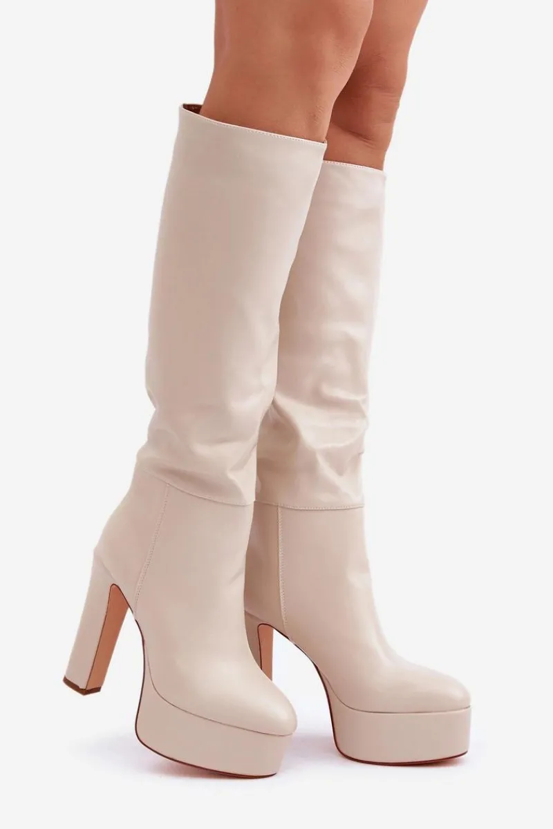 Kozaki Na Słupku I Platformie Z Eko Skóry Jasnobeżowe Felilorn Damskie Kozaki Ocieplane|Kozaki Na Słupku