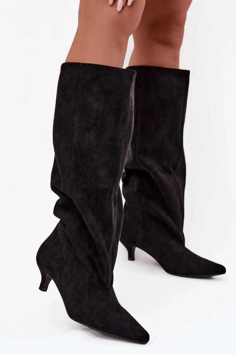 Kozaki damskie z eko zamszu to połączenie wygody i ponadczasowej elegancji. Model wsuwany, z luźną cholewką, doskonale układa się na nodze, podkreślając jej smukły kształt. Niski obcas zapewnia komfort przez cały dzień. Przeszycie biegnące wzdłuż cholewki z przodu optycznie wydłuża nogę. Idealne zarówno do sukienek, jak i dopasowanych spodni – perfekcyjny wybór na co dzień i na wyjątkowe okazje. Przy wyborze rozmiaru prosimy sugerować się tabelą rozmiarów.