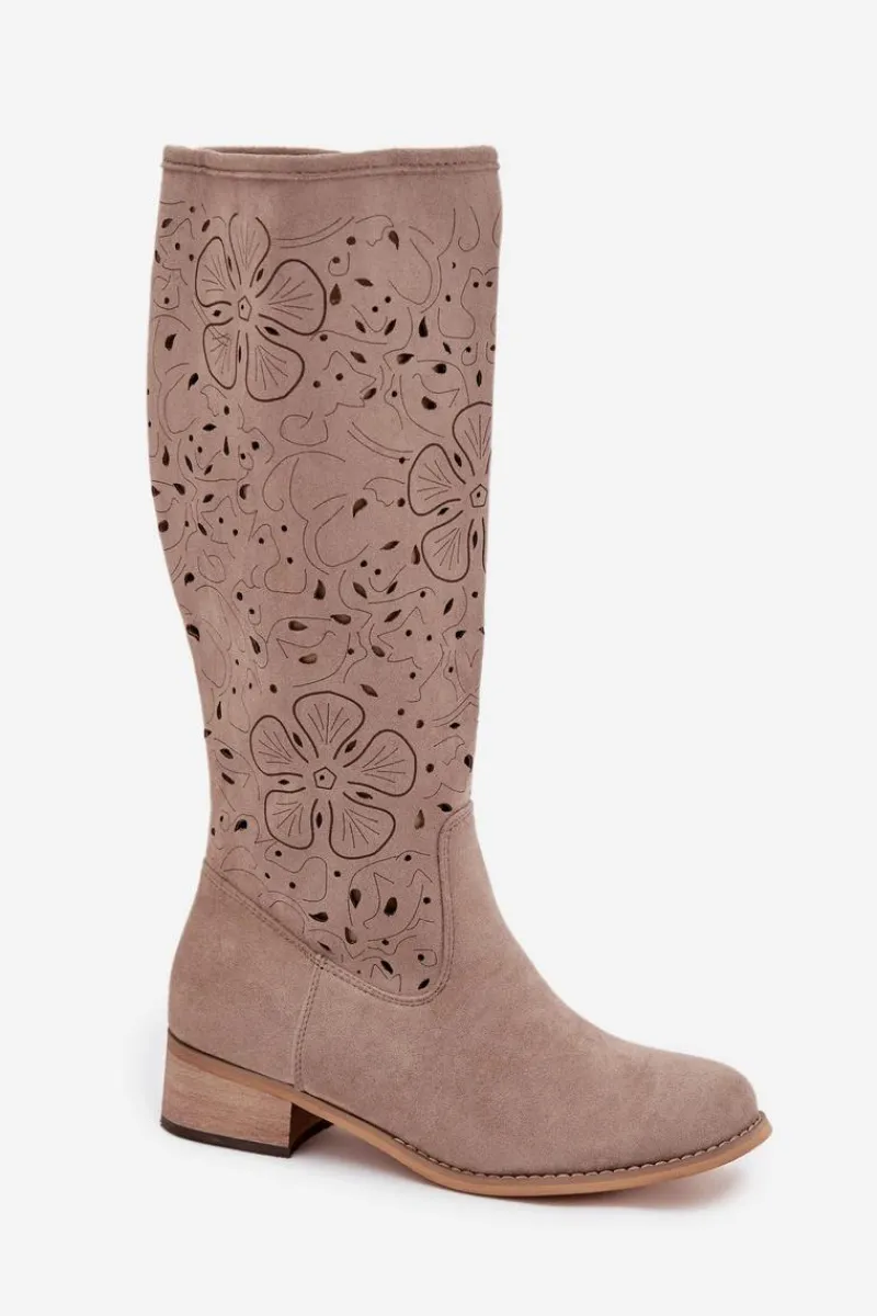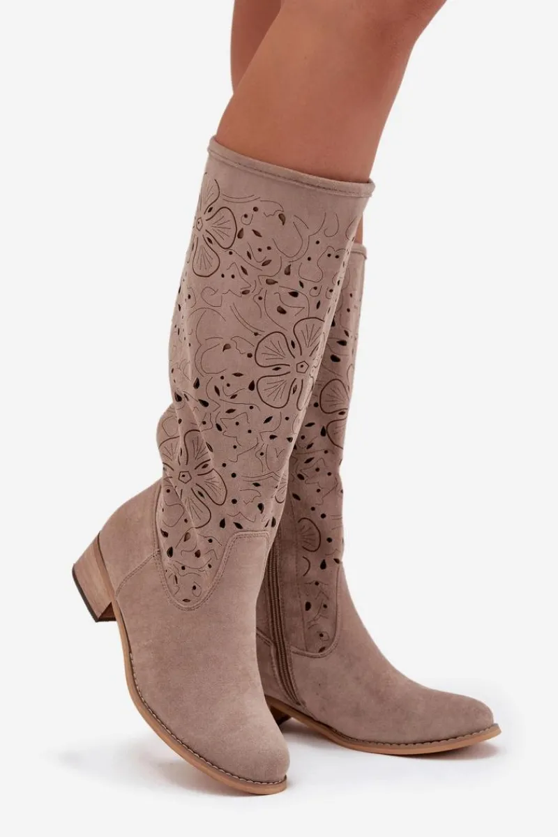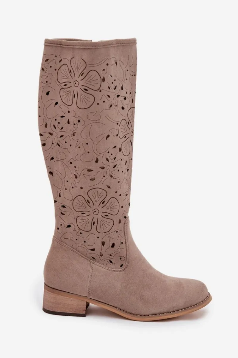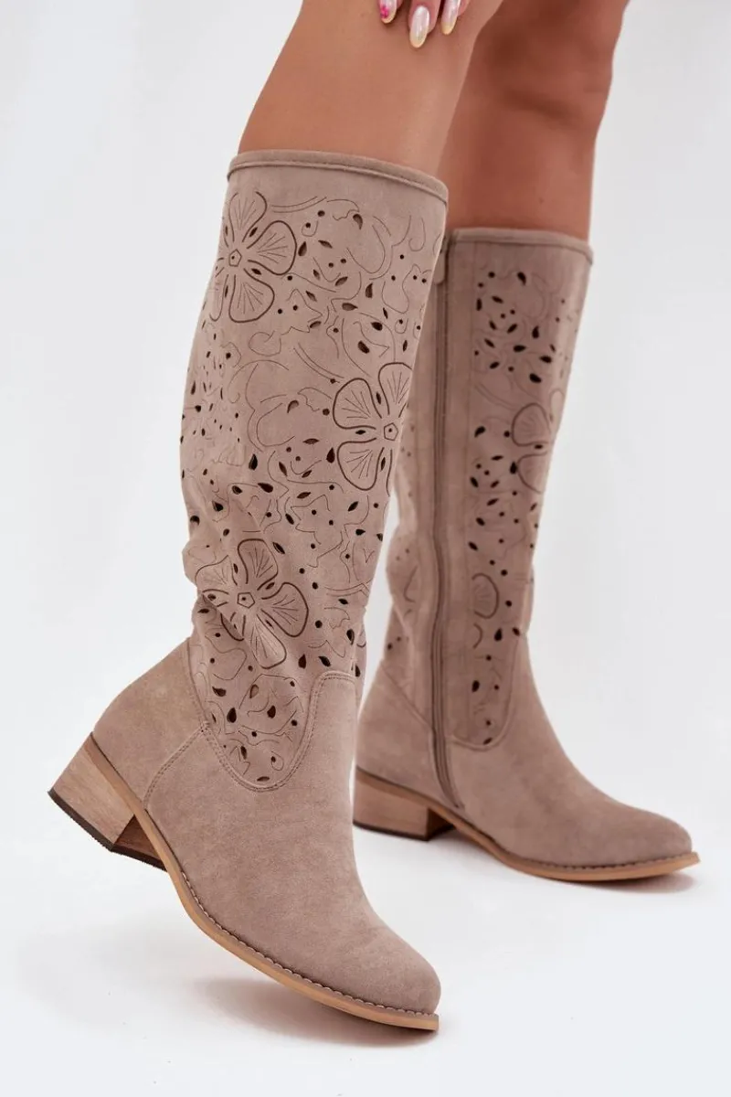 Kozaki Ocieplane|Kozaki Ażurowe>Boto Ażurowe Kozaki Damskie Na Niskim Obcasie Eko Zamszowe Zapinane Na Zamek Beżowe Orchides